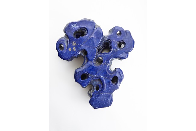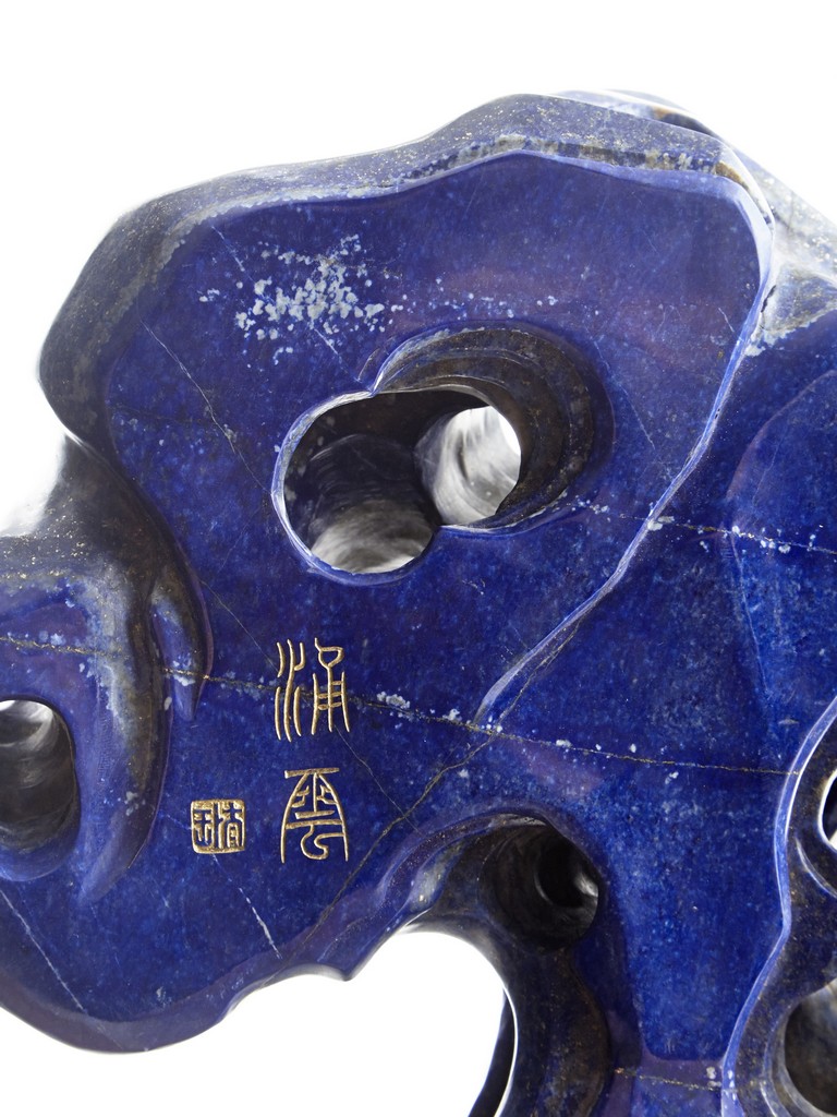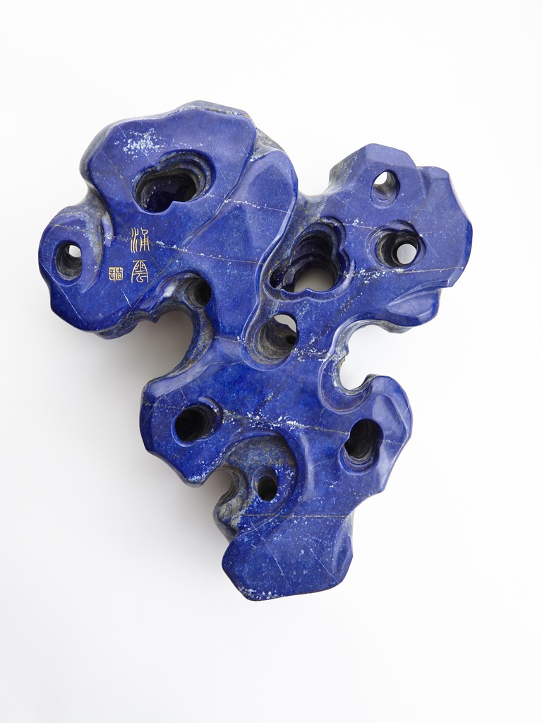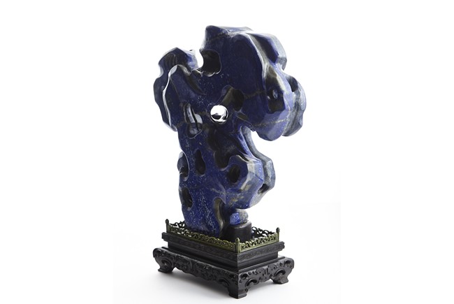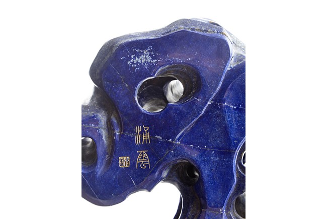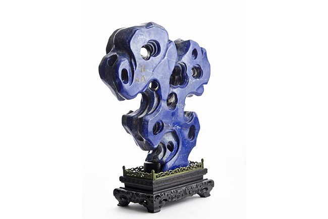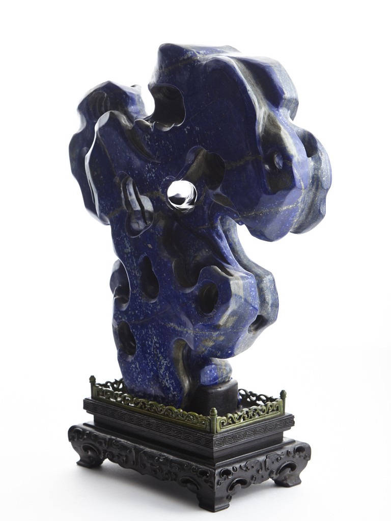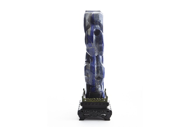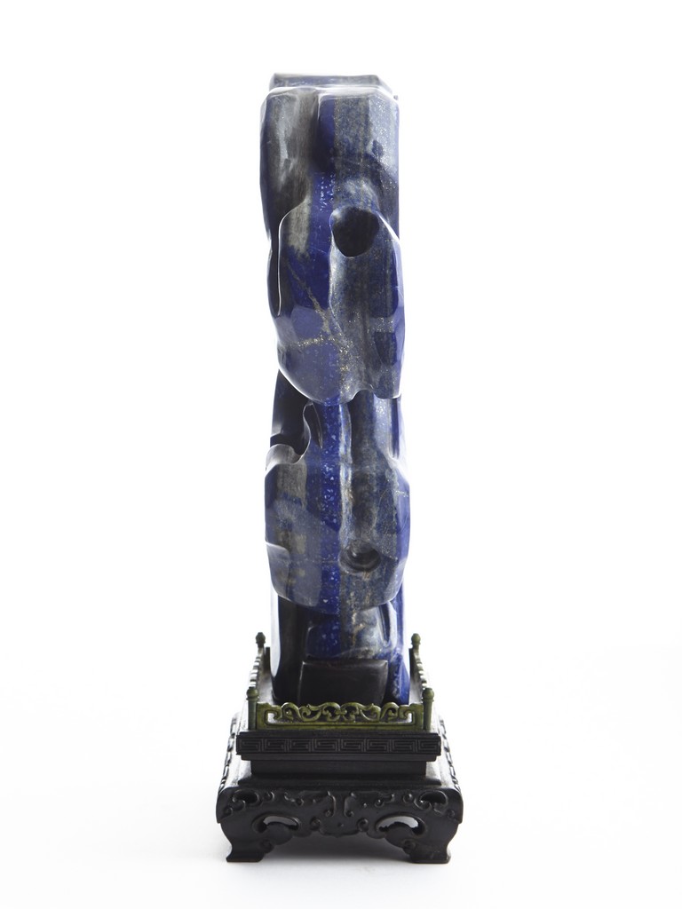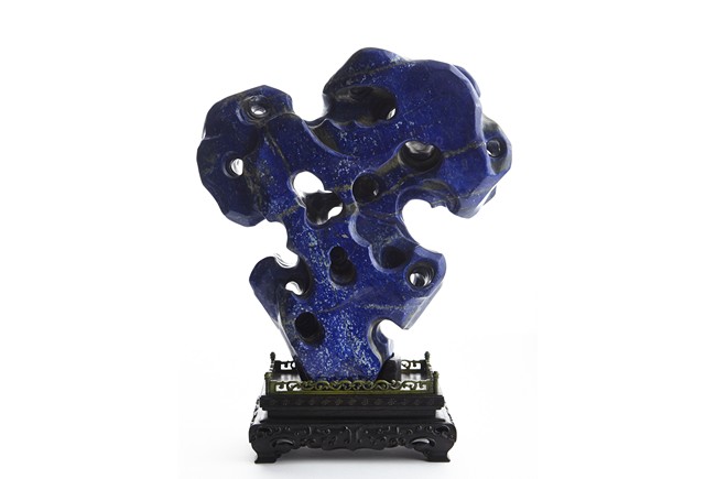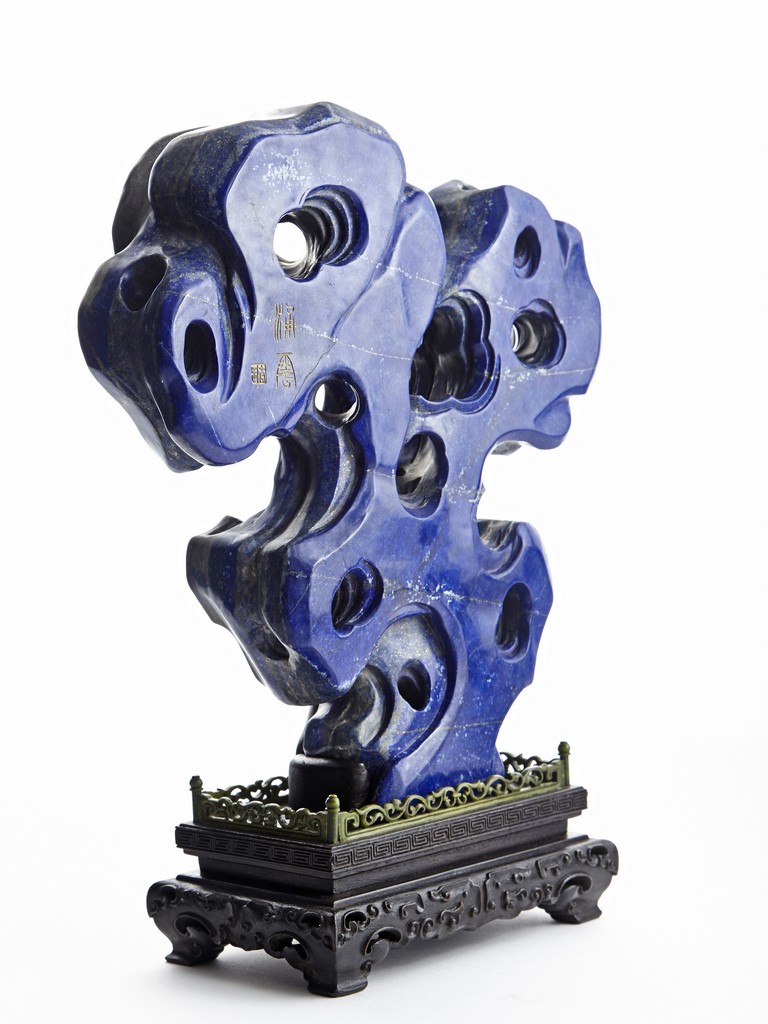 Of upright vertical format, the stone is carved and pierced with various perforations throughout and inscribed with two character and seal mark, supported on zitan stand with archaistic pattern and key-fret band.