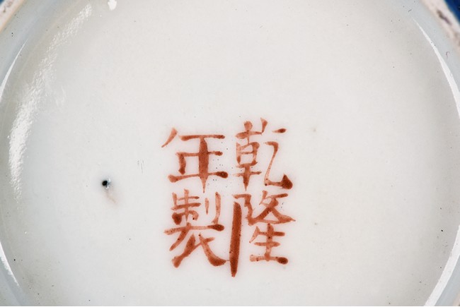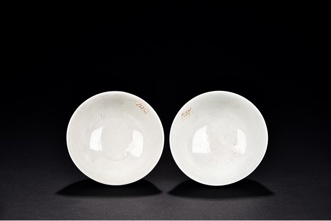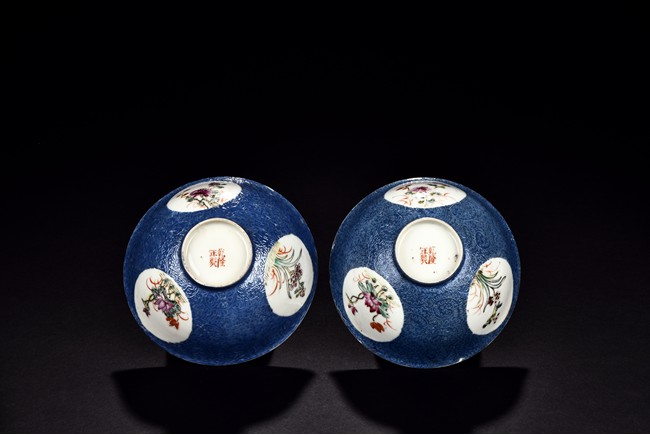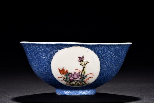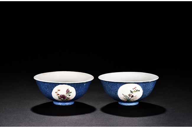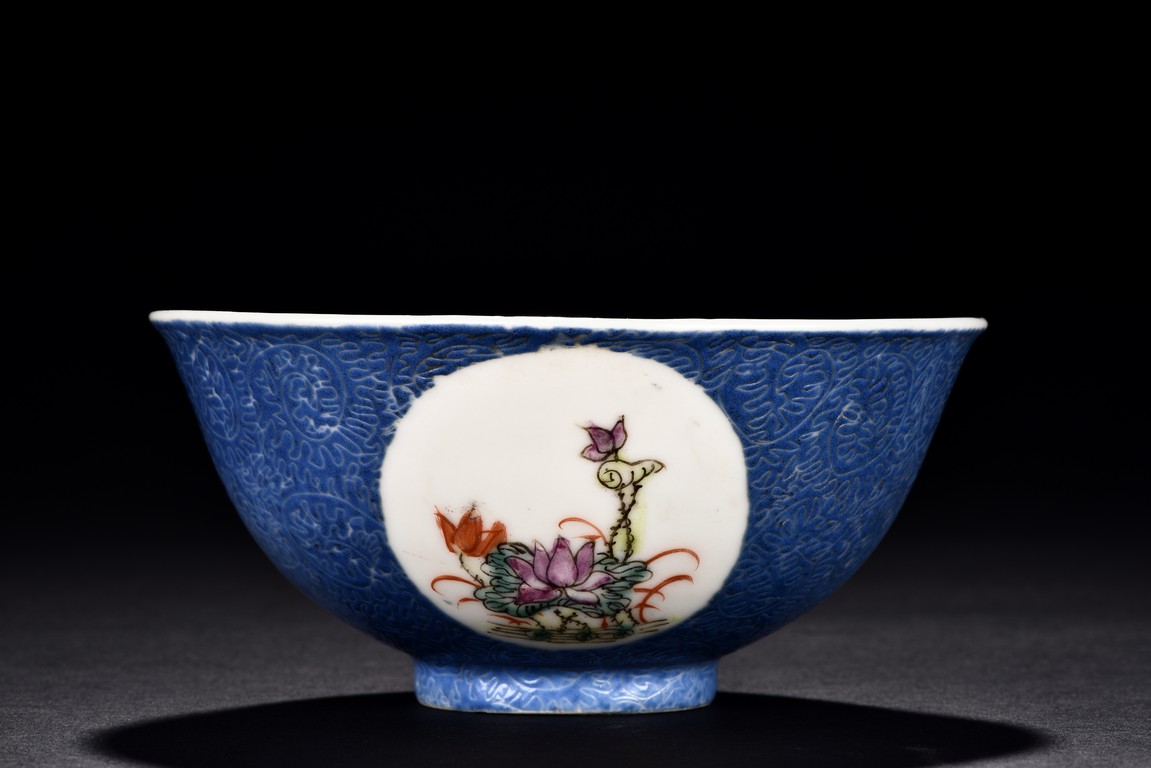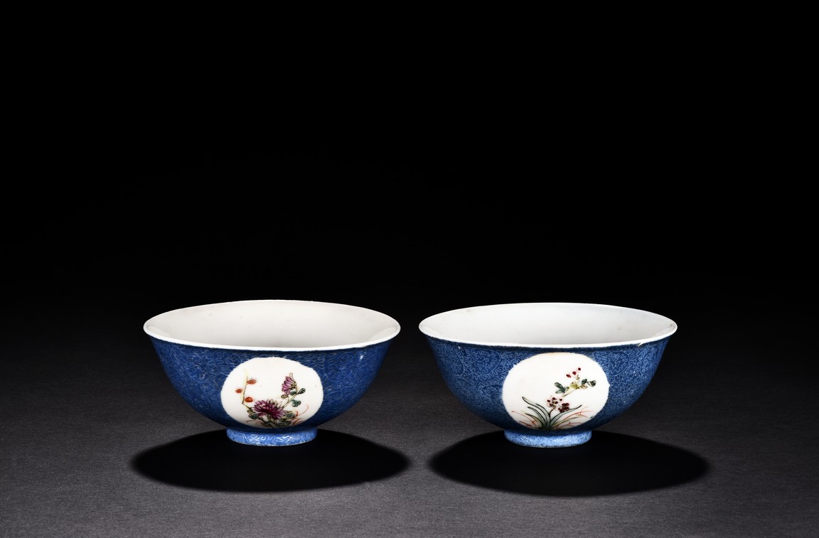 Each bowl is enamelled with three roundels enclosing lotus, orchids, and chrysanthemu, separated by blue glazed sgraffiato ground. The bottom with four character Qianlong mark. Late Qing Republic period.