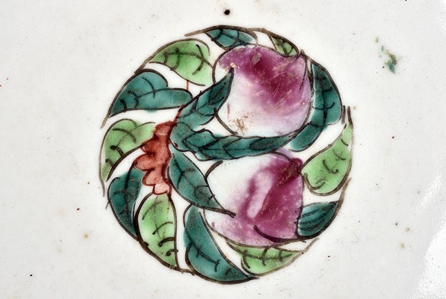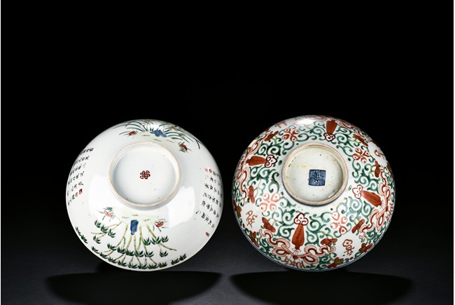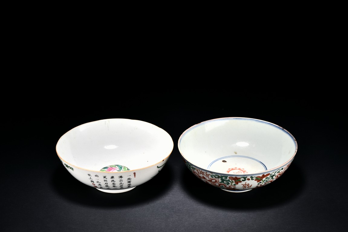Including one bowl painted with four character Ji Xiang Ru Yi interspersed with scrolling floral pattern, bottom with dynasty mark, the other with poems and bamboo, orchid, bottom with pictograph mark. Republic period.