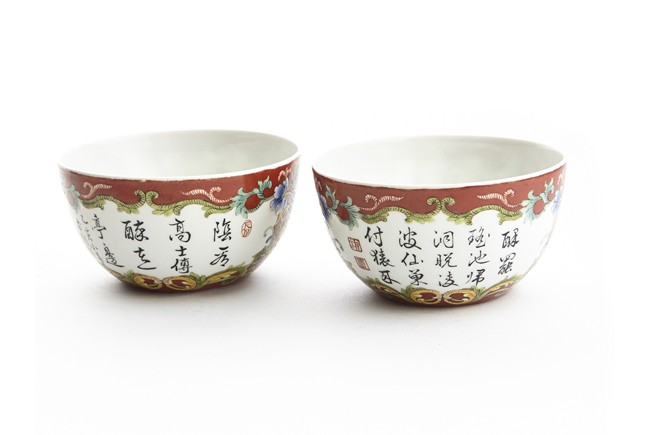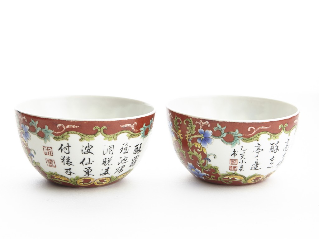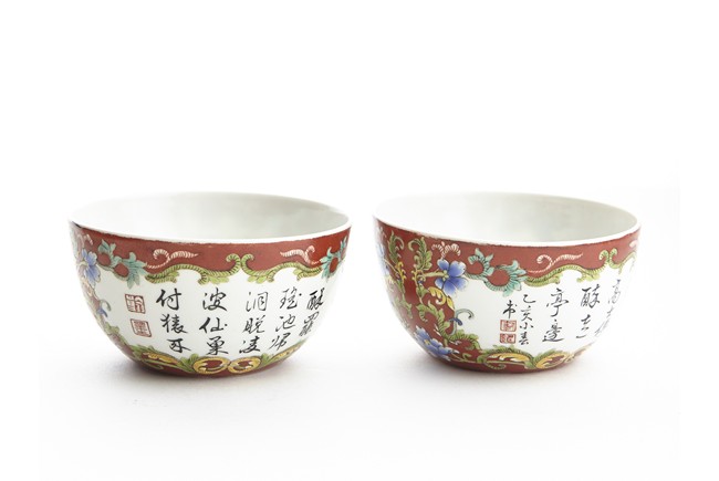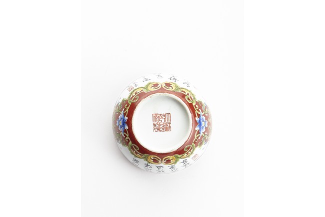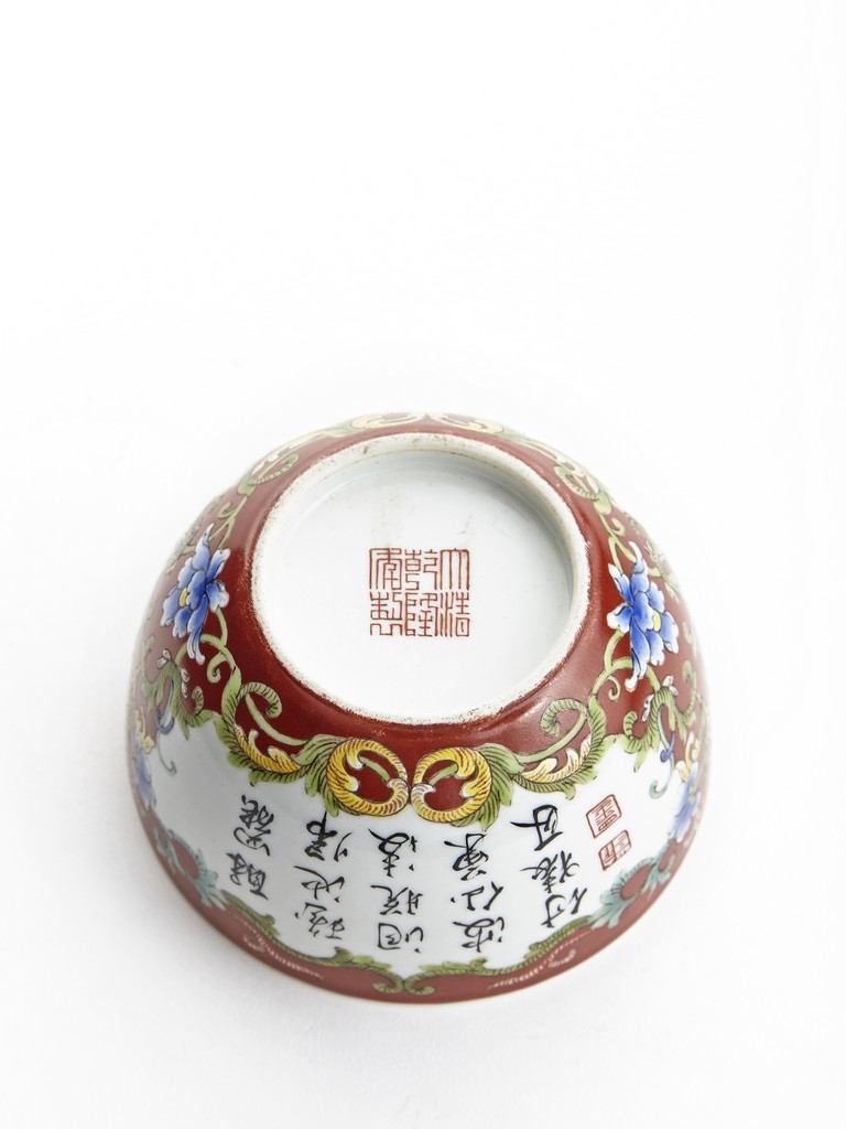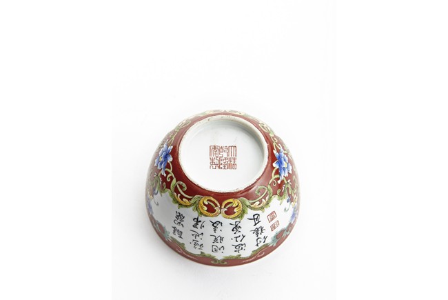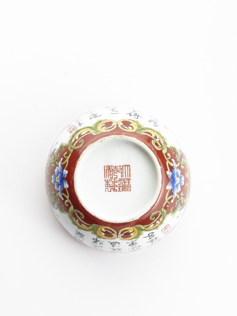 Each of rounded sides, the exterior finely enamelled with imperial poems in running script and seal marks within a delicately painted floral border, all reserved against coral red ground. The base bears six character 'QIANLONG' mark. Qing Dynasty period.
