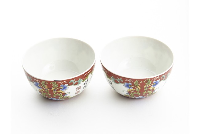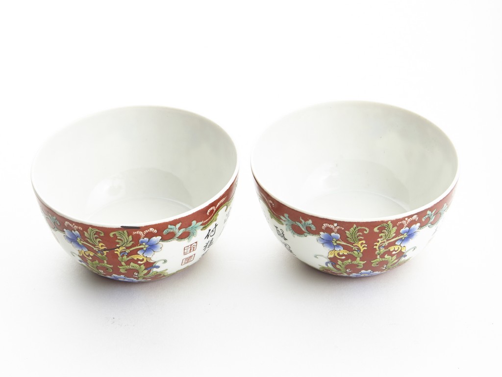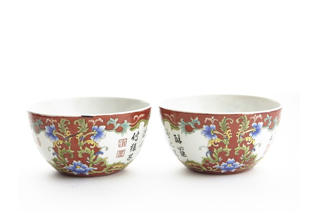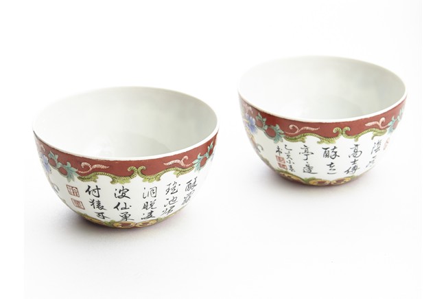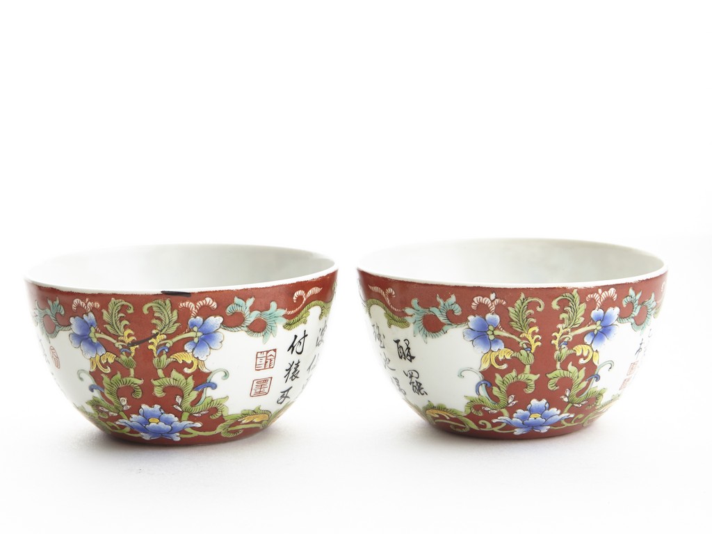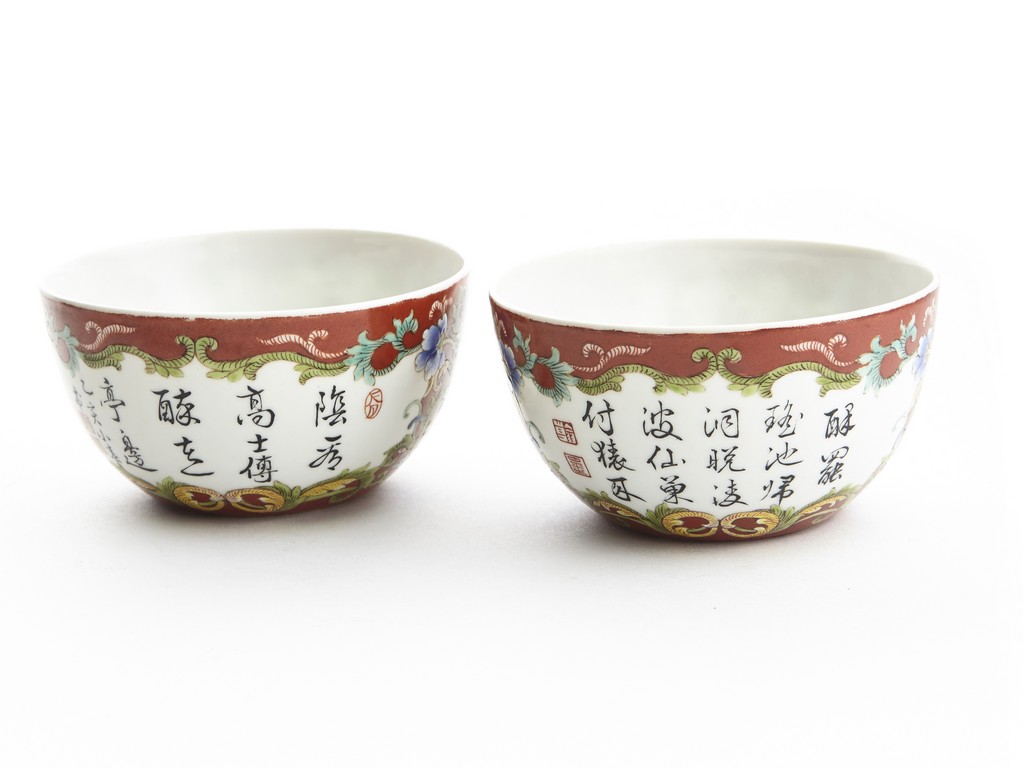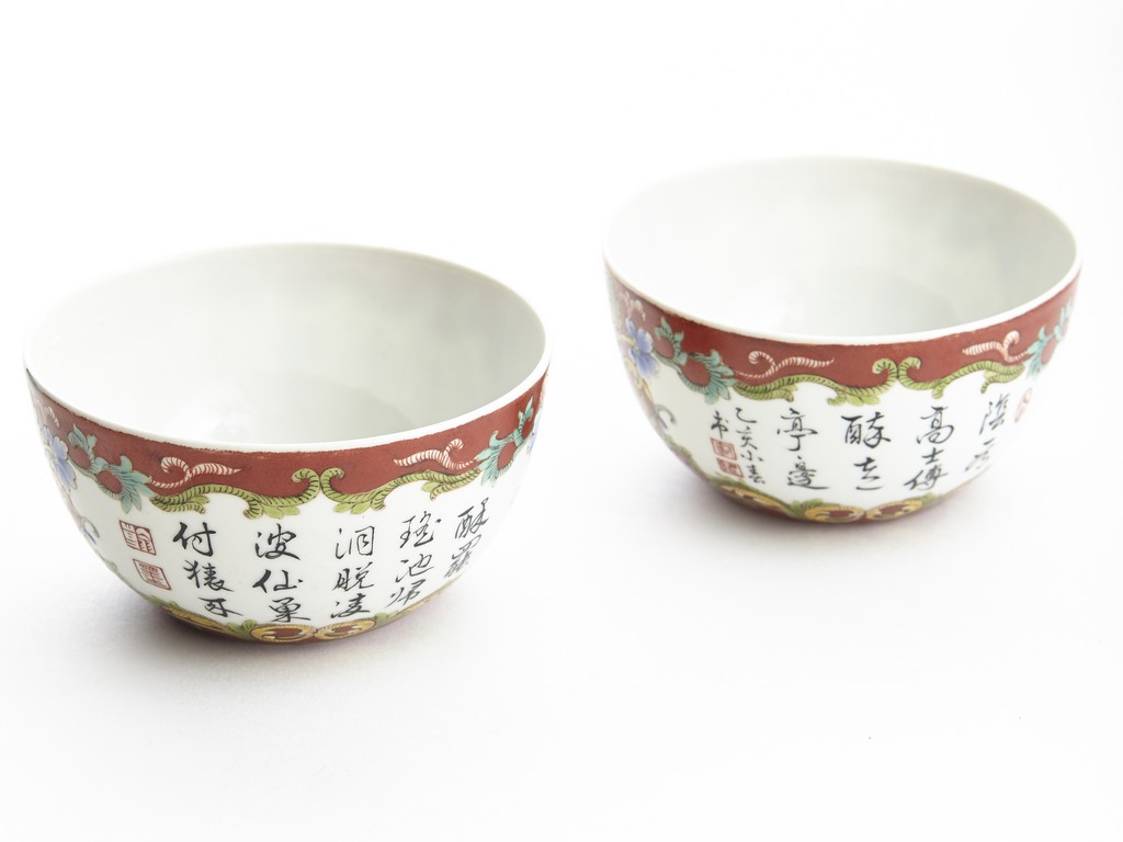 Each of rounded sides, the exterior finely enamelled with imperial poems in running script and seal marks within a delicately painted floral border, all reserved against coral red ground. The base bears six character 'QIANLONG' mark. Qing Dynasty period.