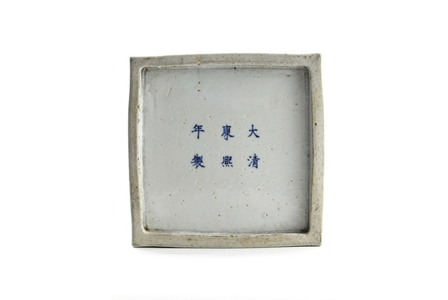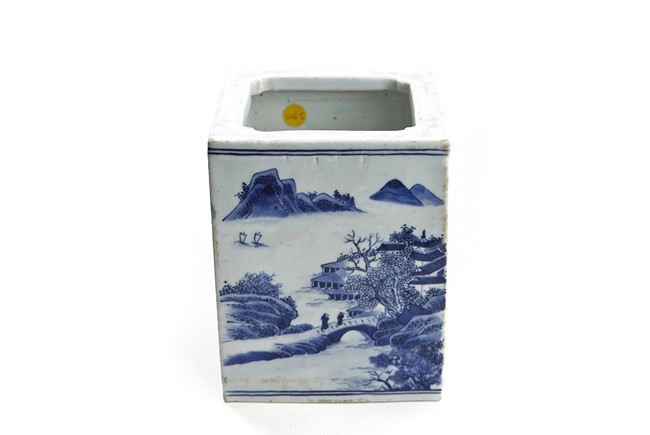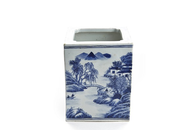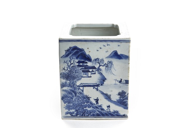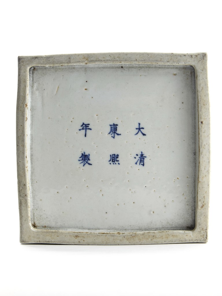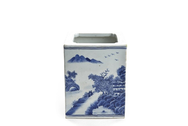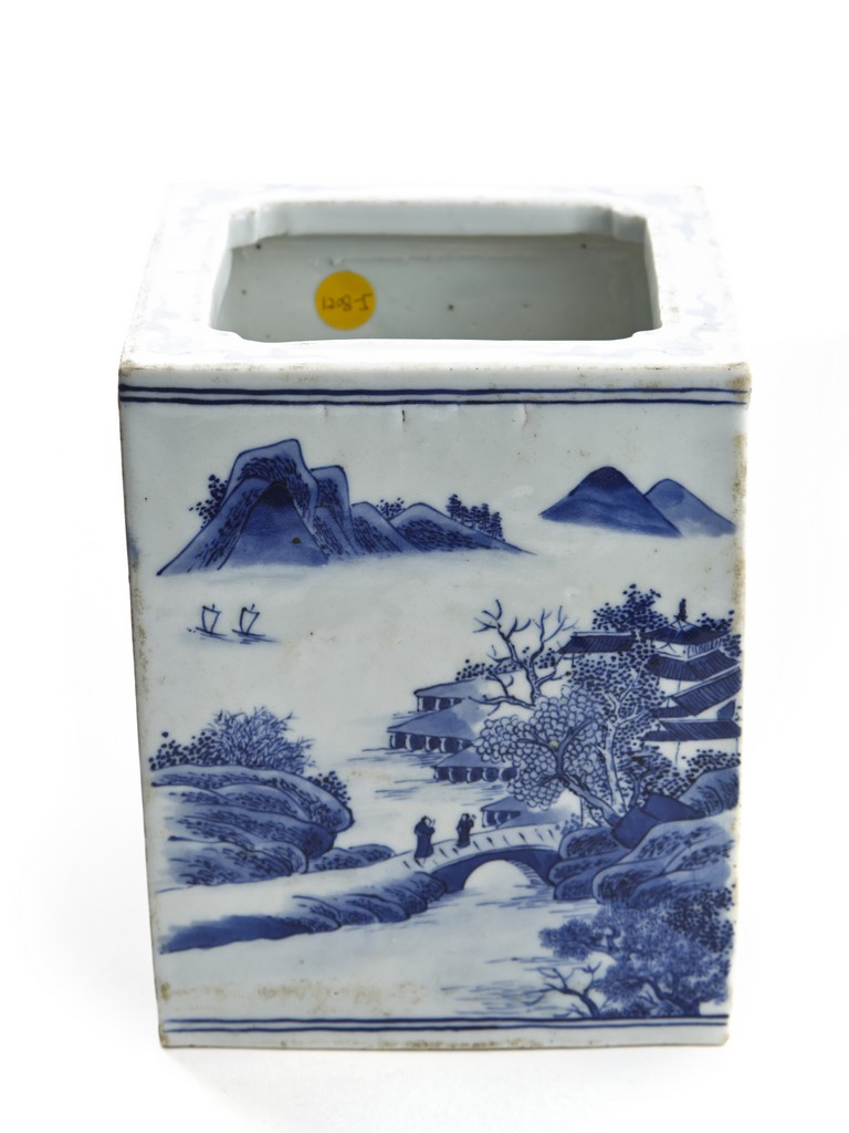 Of well potted and square section, each side finely decorated with landscape, depicting scholars on riverbank among various trees and towering mountains in foreground. The base with six character Kangxi mark. Qing Dynasty period.