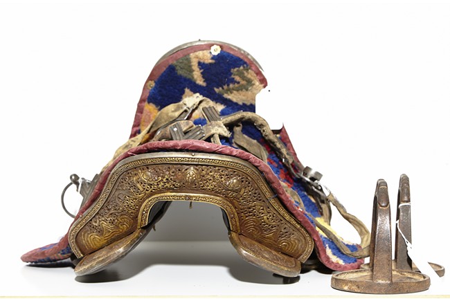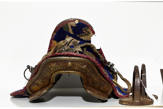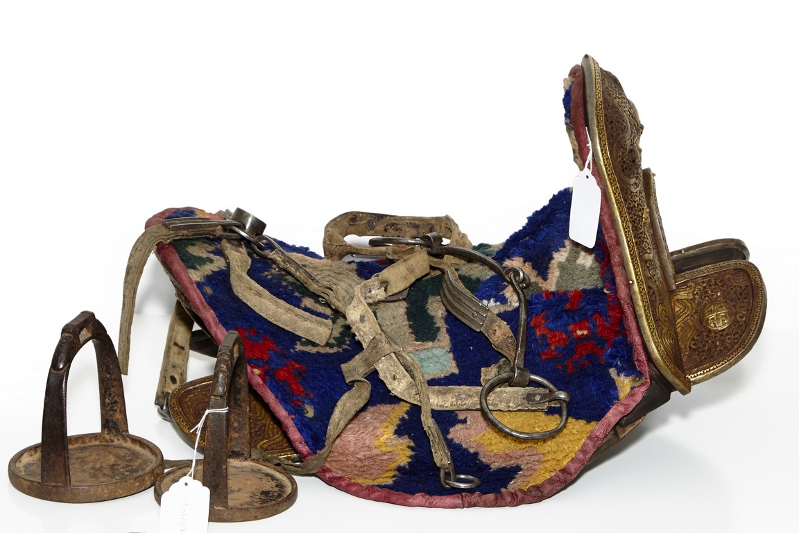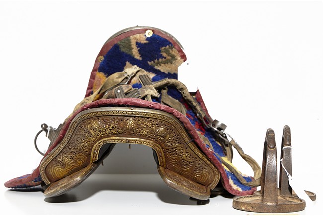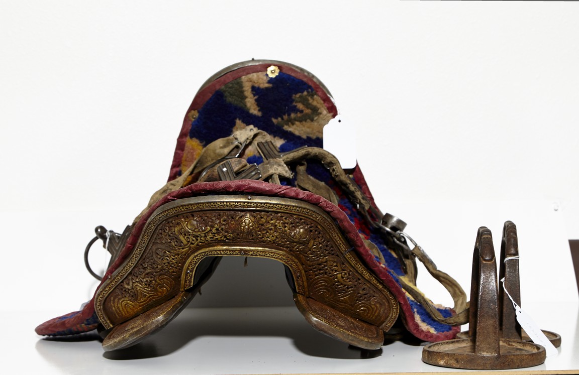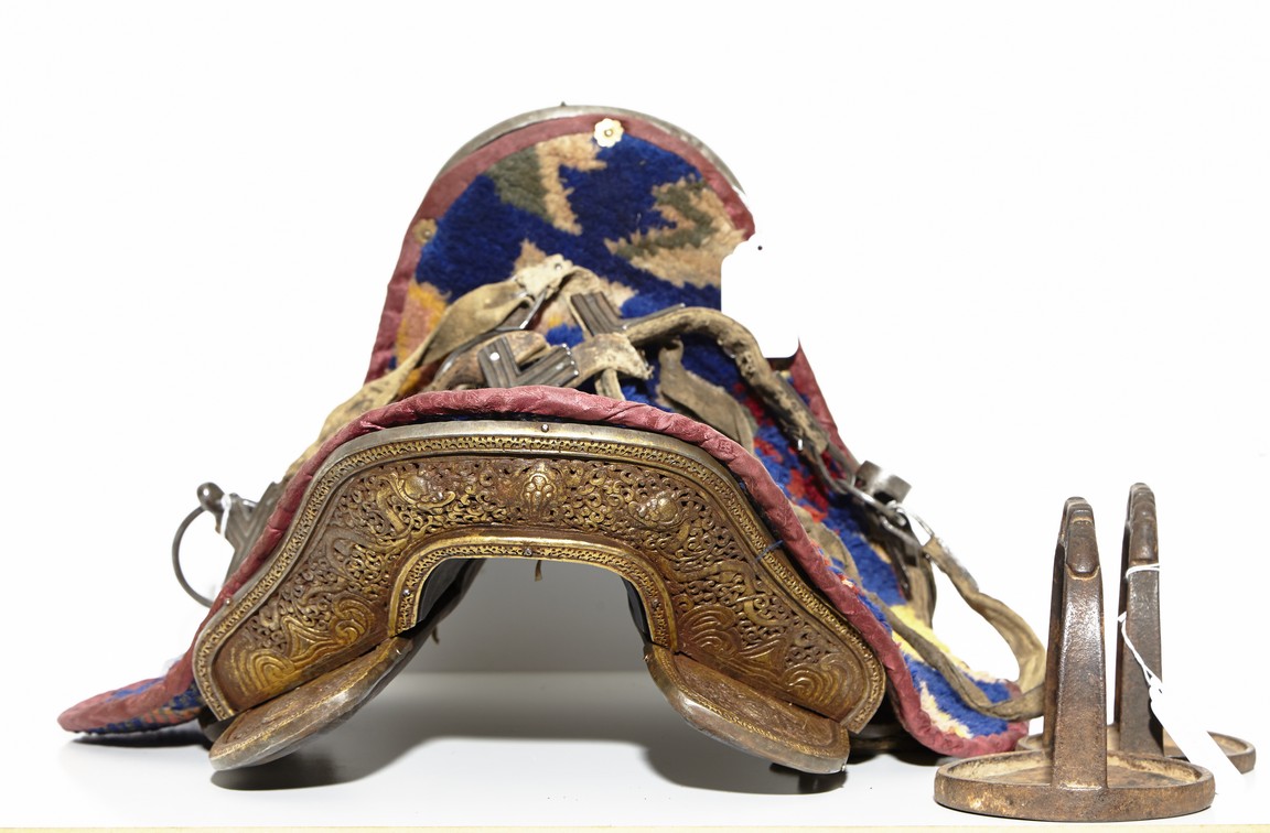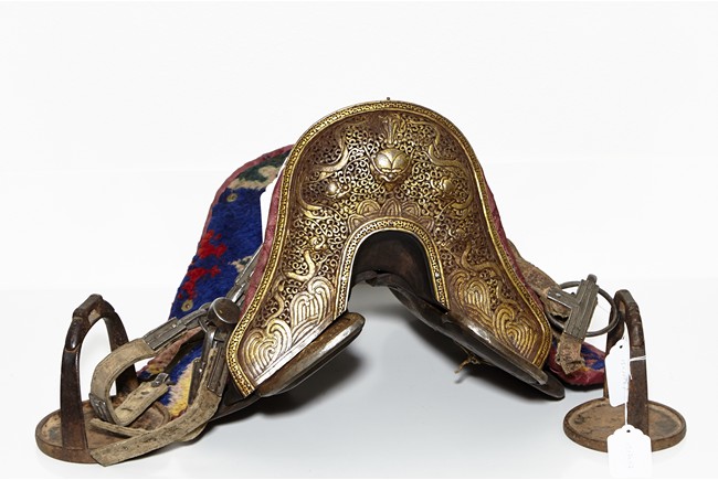 The horse saddle is covered on top with cloth, the front depicts a pair of dragons confronting a sacred mountain at center amidst ocean wave patterns and auspicious clouds, the back depicts two flying dragons confronting against a mythical beast mask amidst a similar setting, all finely gilt. With straps and two buckles. Qing Dynasty period.