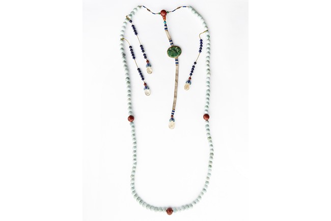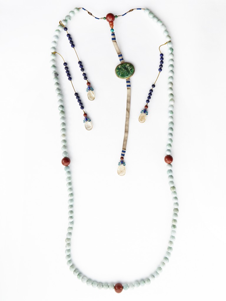 Composed of 108 carved jadeite beads spaced by four carved agate beads, with three strings of smaller lapis lazuli beads suspend from the necklace and each terminates with a crystal bead, along with a central string of jadeite pendant terminating with tear-shaped crystal bead. Qing Dynasty period.