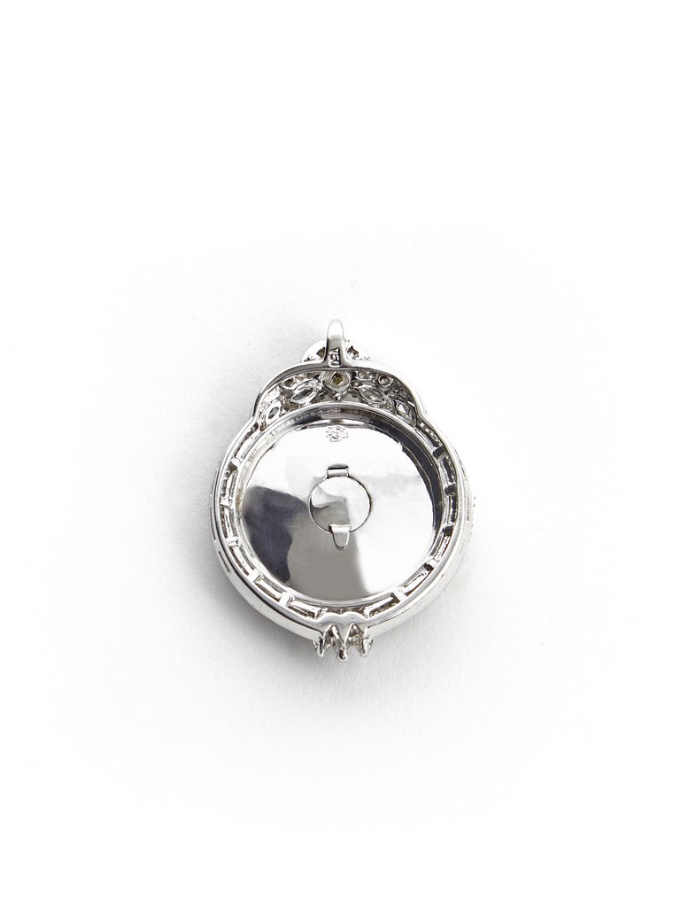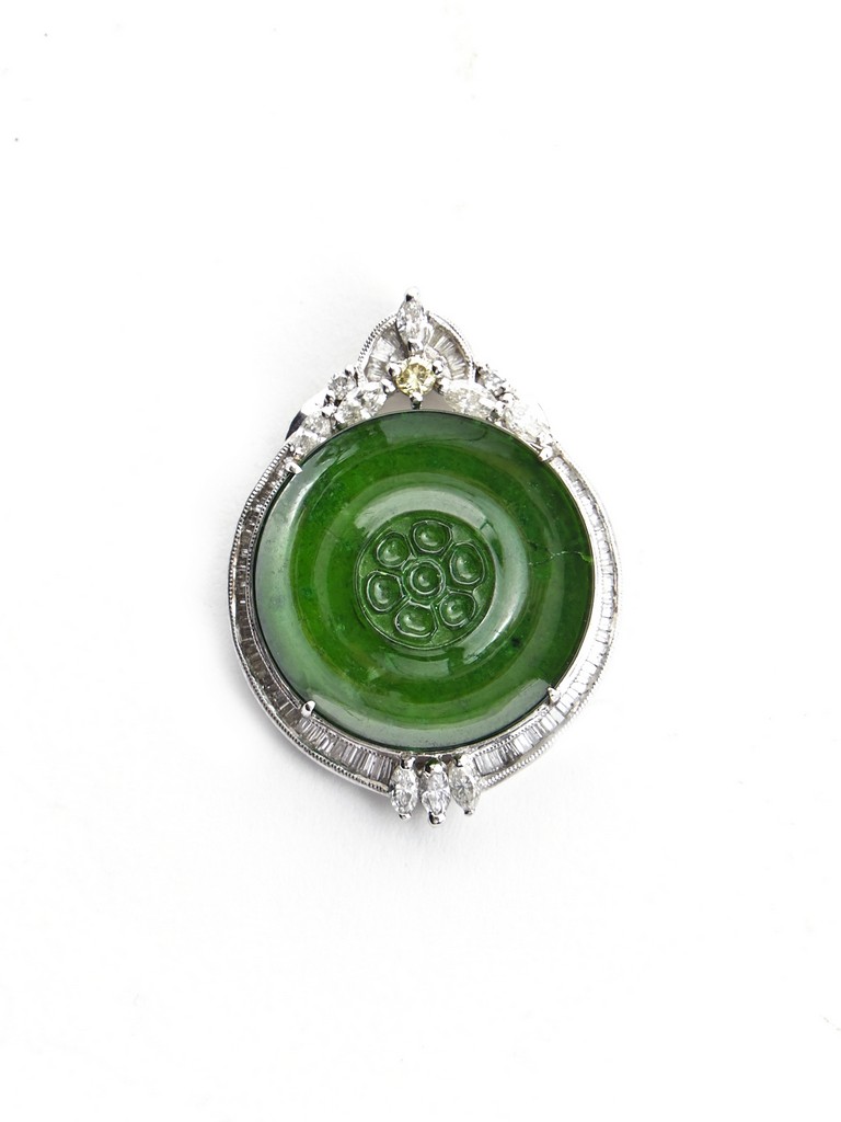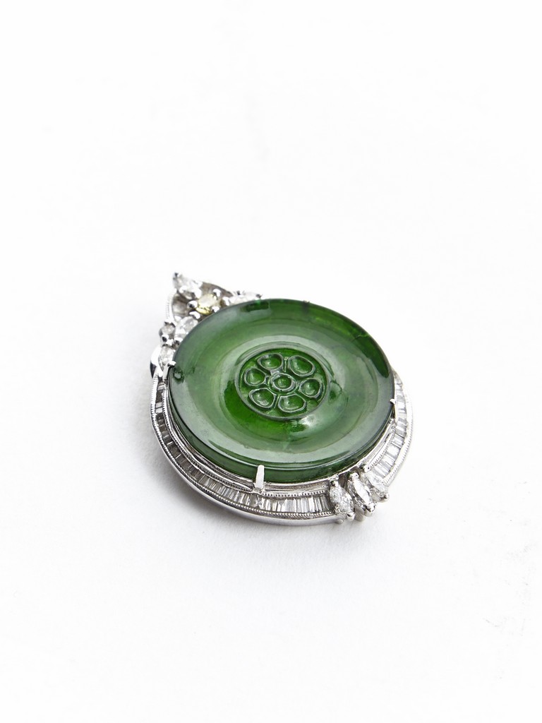 Of rich emerald green tone and excellent translucency, the pendant mounted on white gold and embellished with diamonds.