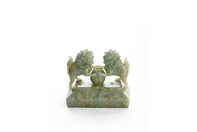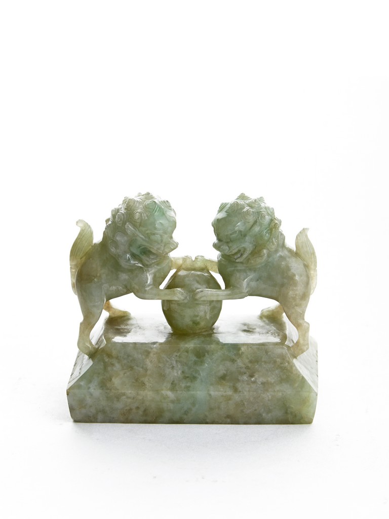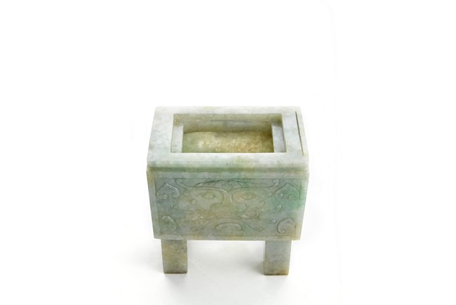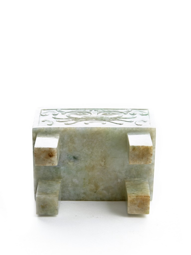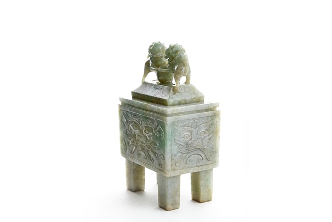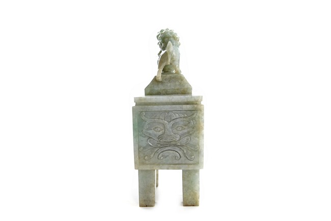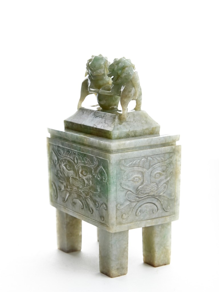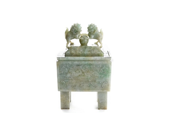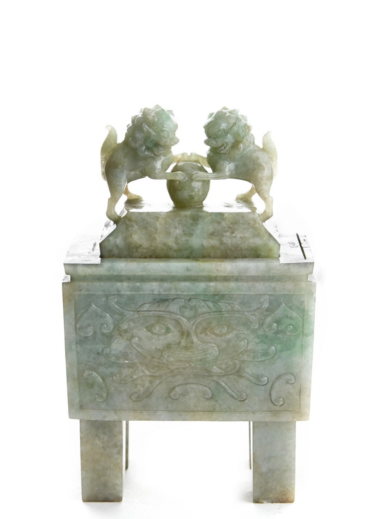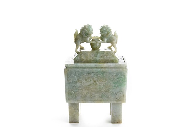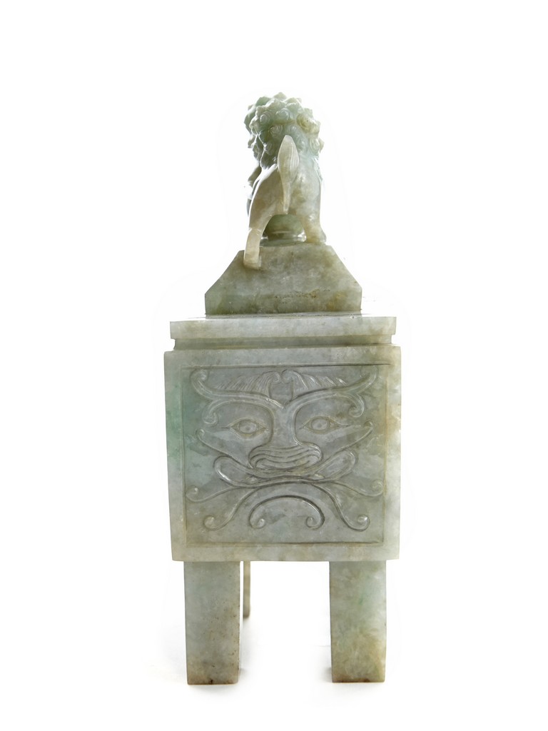 The rectangular vessel raised on four tall square feet, each side carved in shallow relief with archaistic mythical beast motifs, the cover surmounted by two openwork Buddhist lions with front paws upon a ball. Qing Dynasty period.