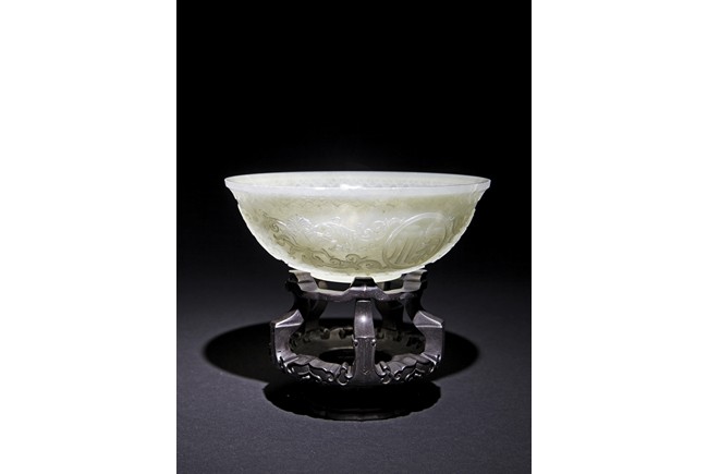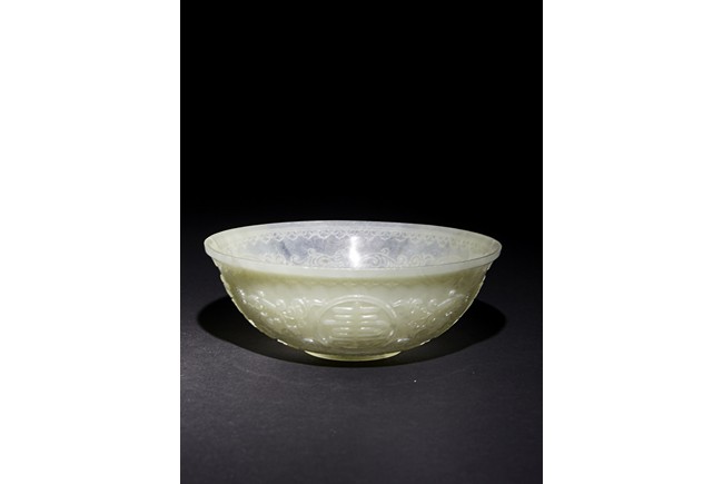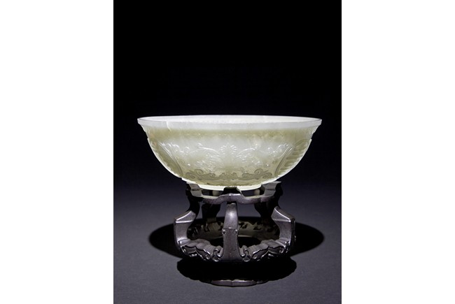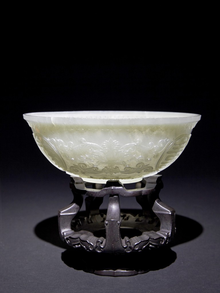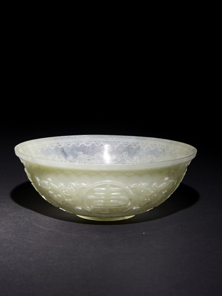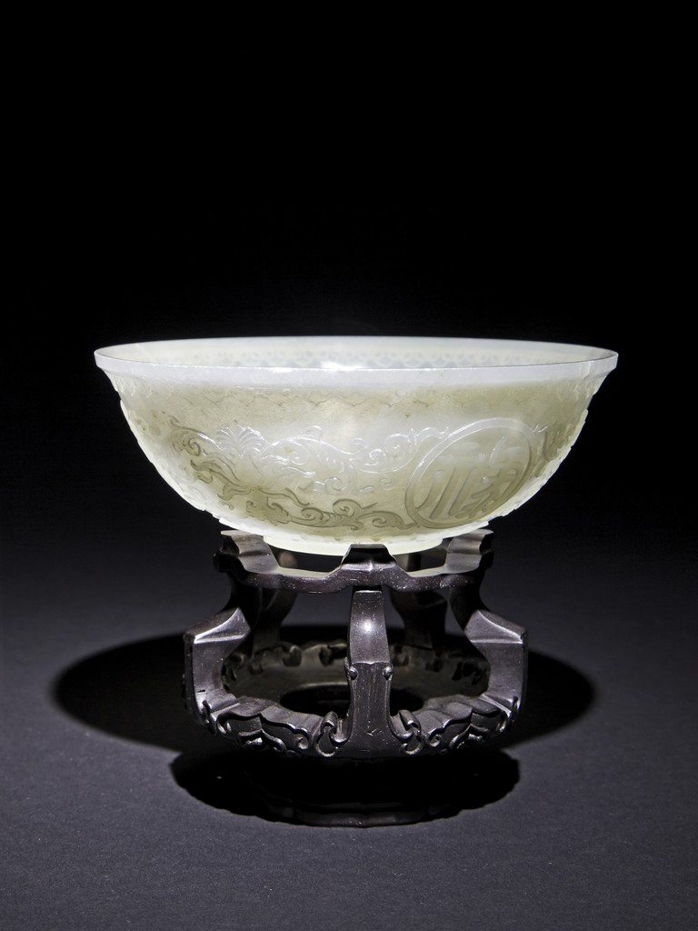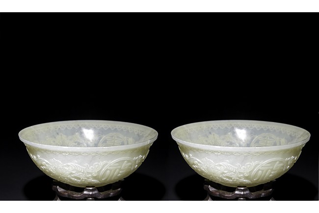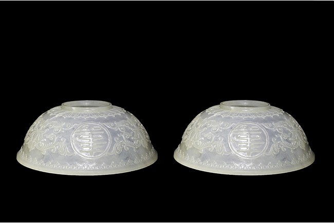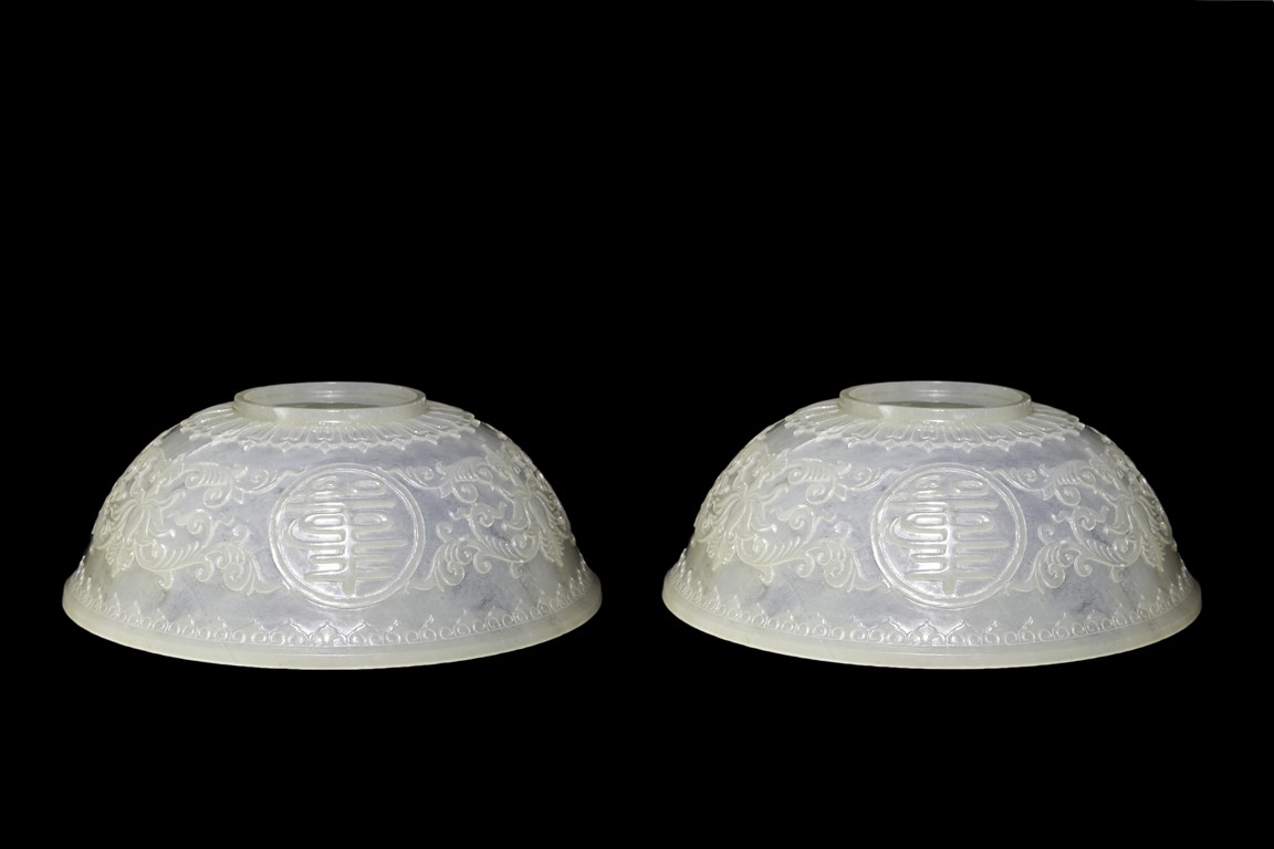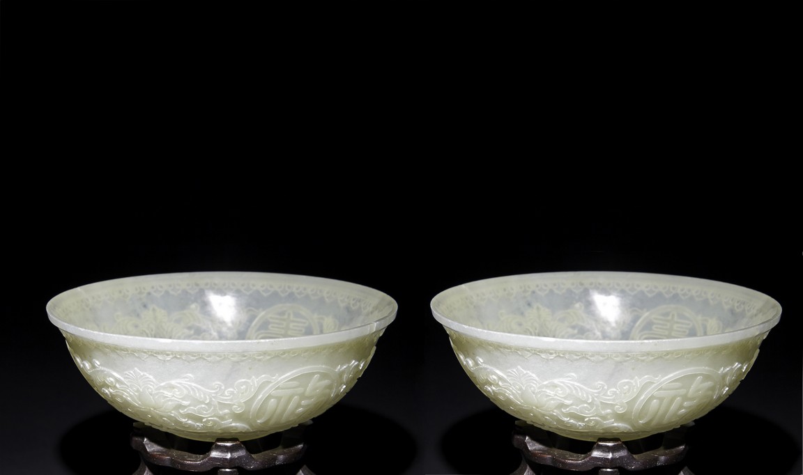 Each raised on circular foot ring, the thin side wall finely carved with auspicious character enclosed within roundel and scrolled lotus, flanked by ruyi-shaped band to the mouth rim and leave lappets to the base.