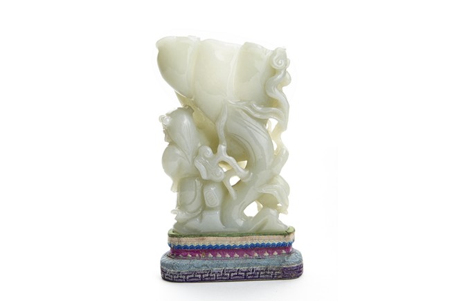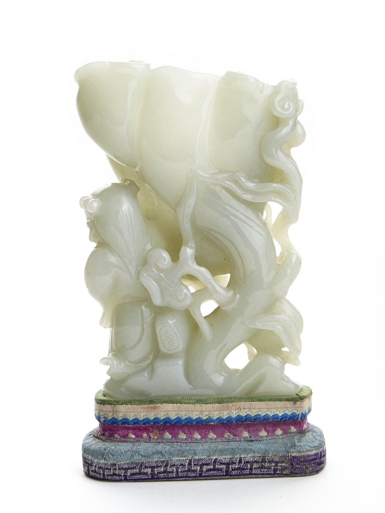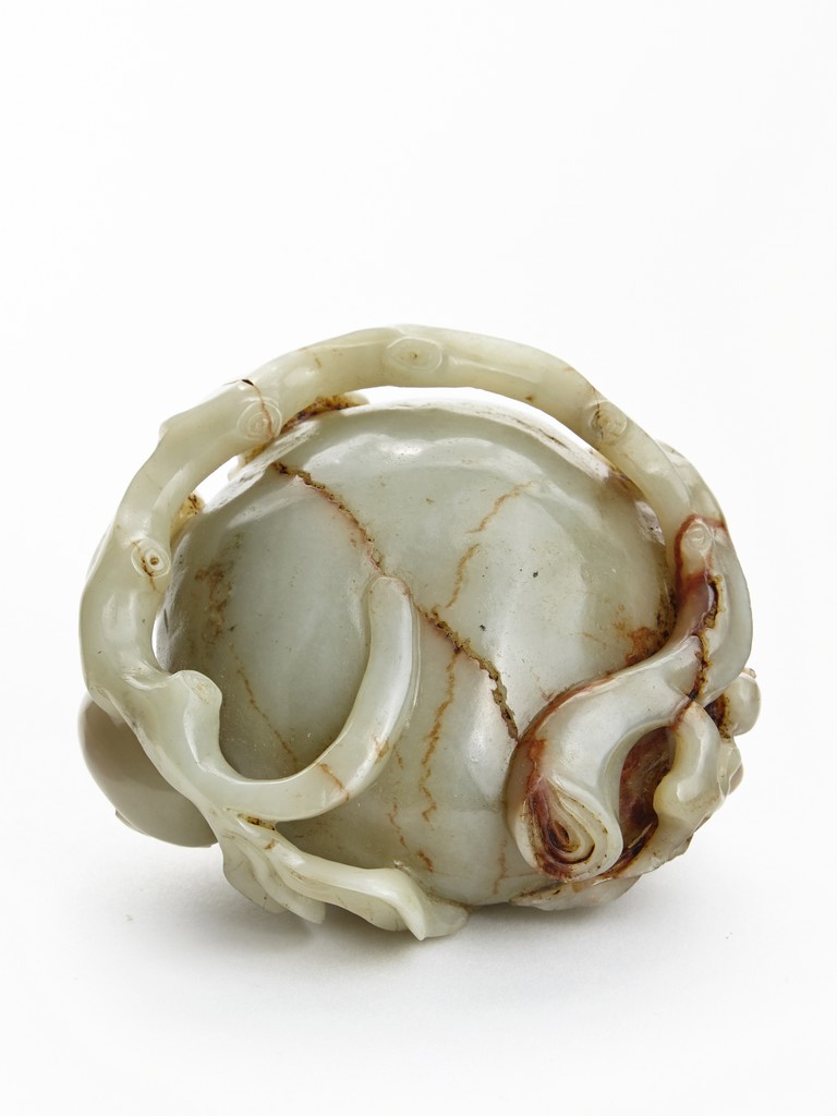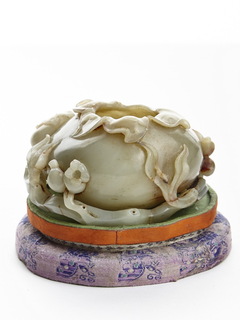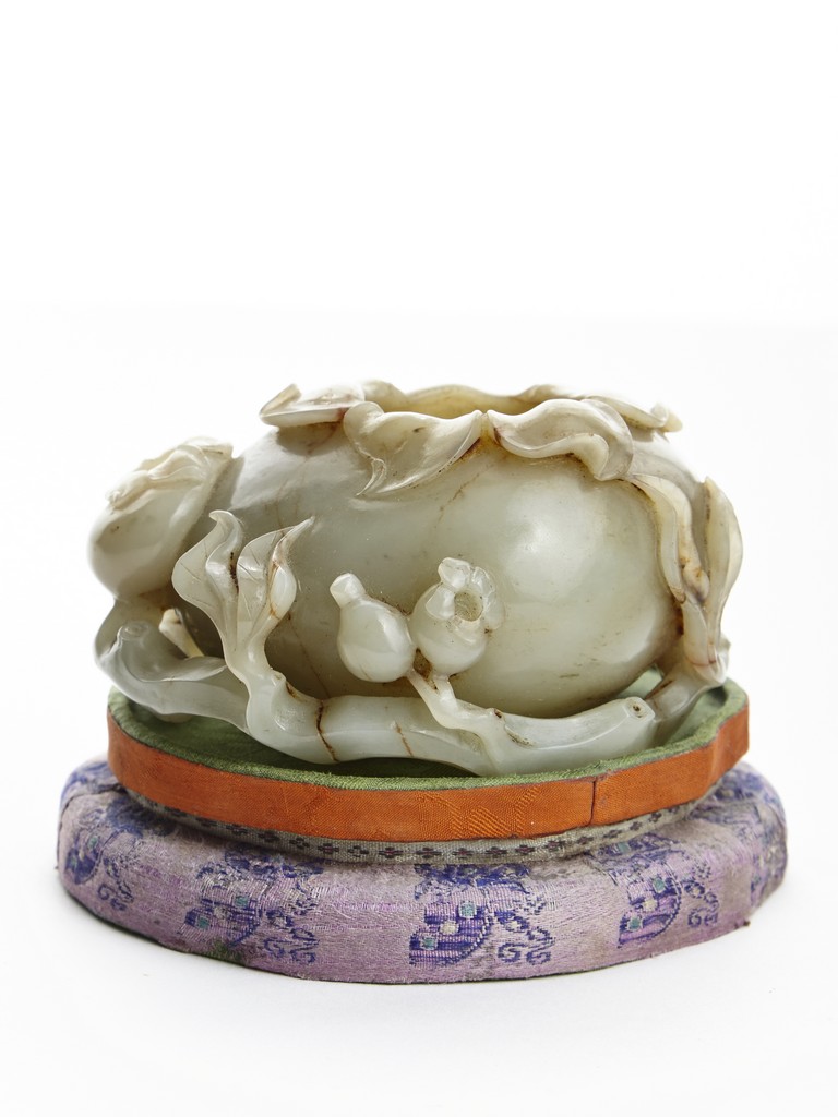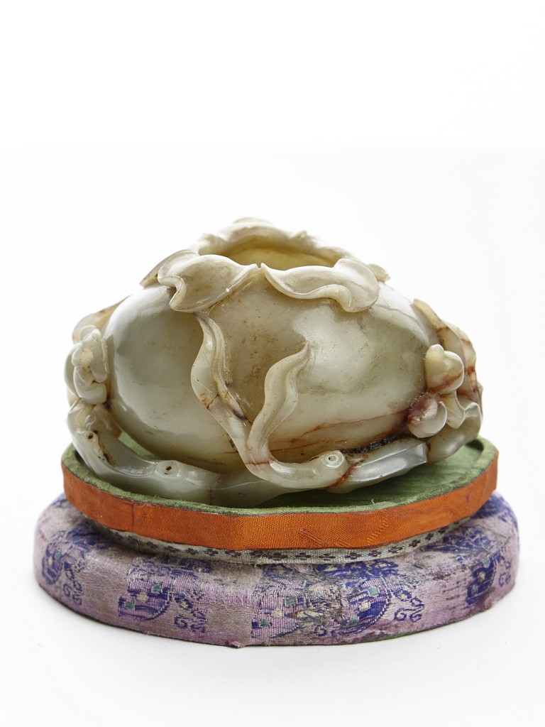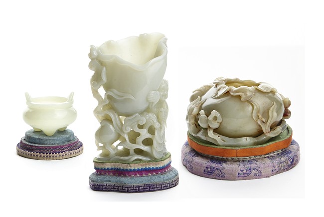 Comprising of a small white jade tripod censer of compressed globular body, the rim supporting two upright arched handles extending outward; a white jade well-hollowed flower pot modelled in magnolia form, supported on gnarled branches with lingzhi and peaches, above a young boy holding a string of coins on one hand; a celadon jade waterpot of peach form surrounded by gnarled flowering branches, the stone with dark russet veins. Qing Dynasty period.