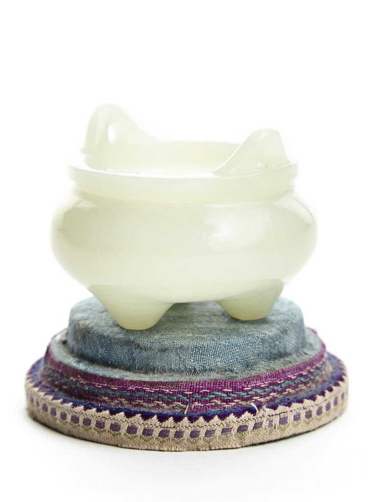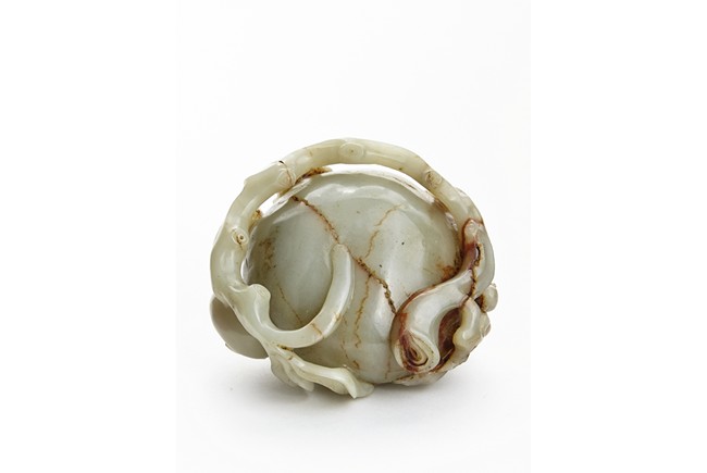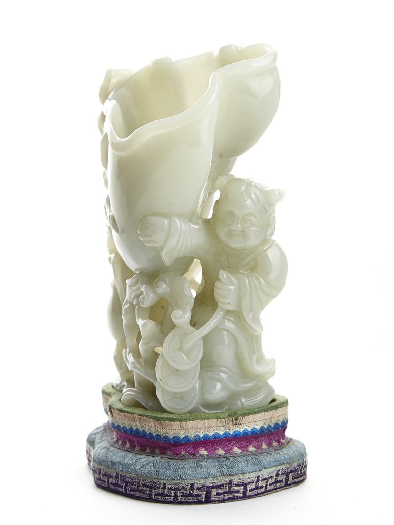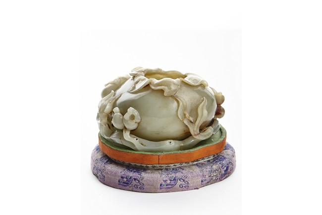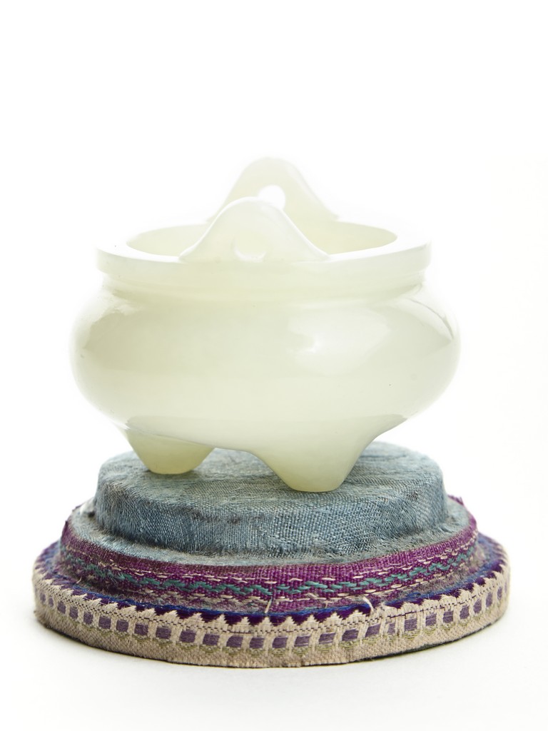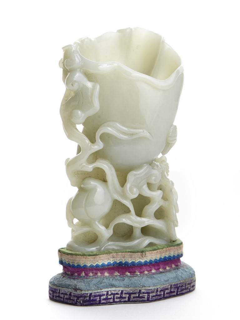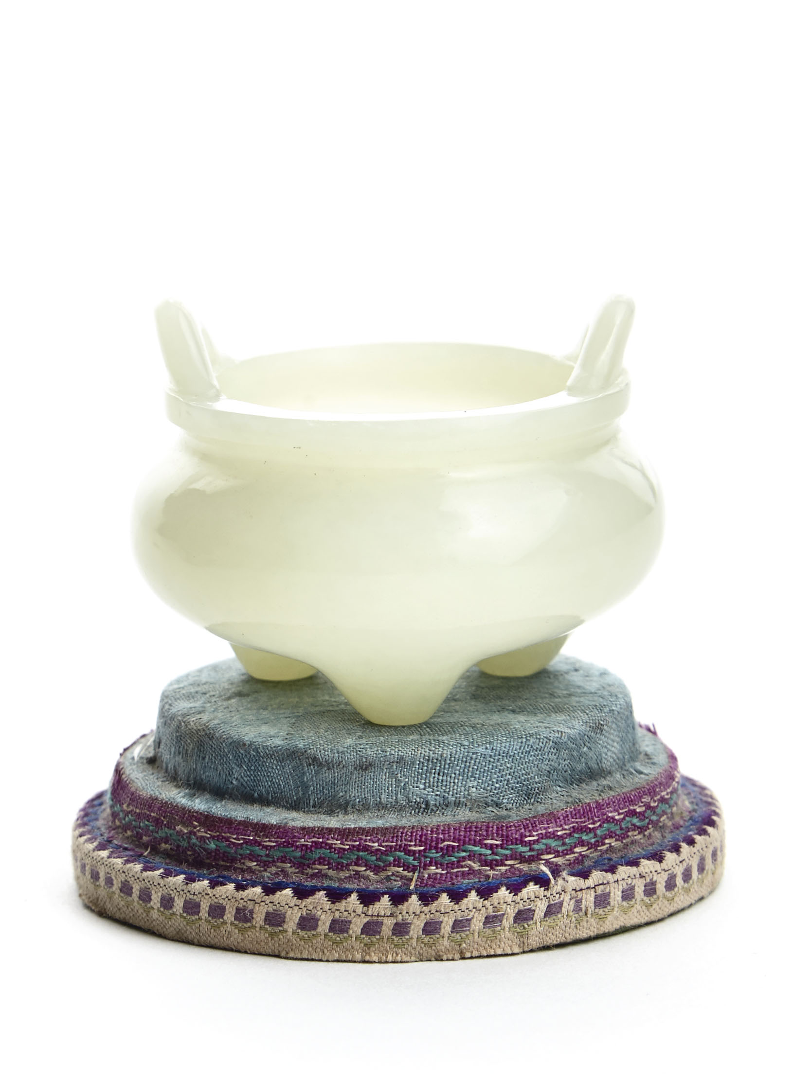 Comprising of a small white jade tripod censer of compressed globular body, the rim supporting two upright arched handles extending outward; a white jade well-hollowed flower pot modelled in magnolia form, supported on gnarled branches with lingzhi and peaches, above a young boy holding a string of coins on one hand; a celadon jade waterpot of peach form surrounded by gnarled flowering branches, the stone with dark russet veins. Qing Dynasty period.