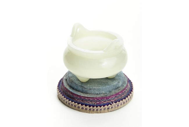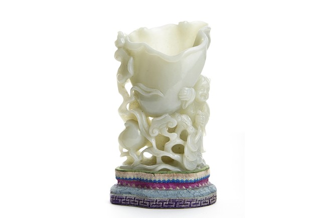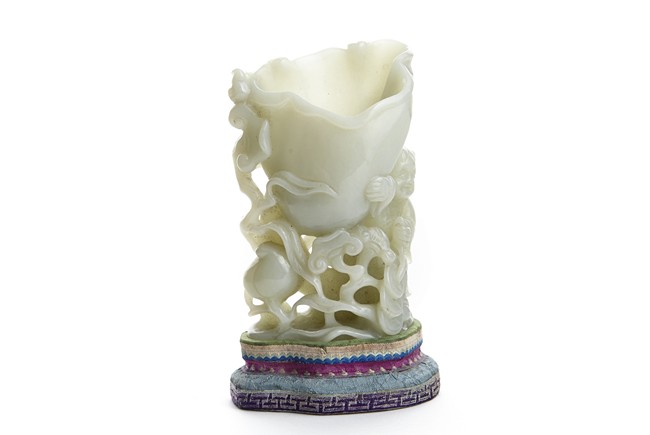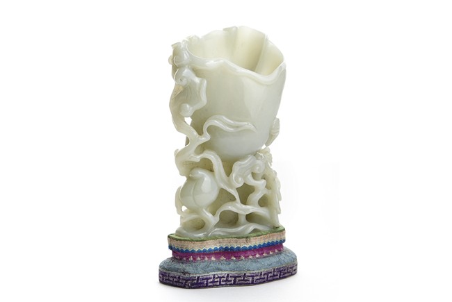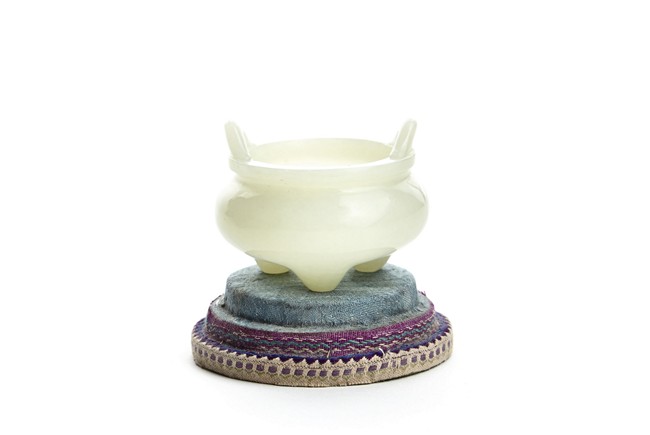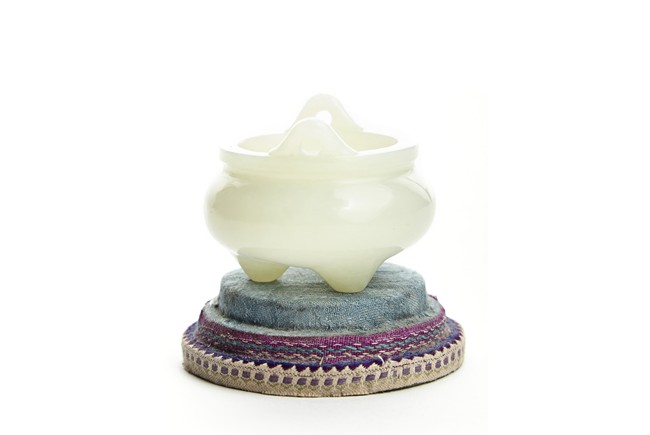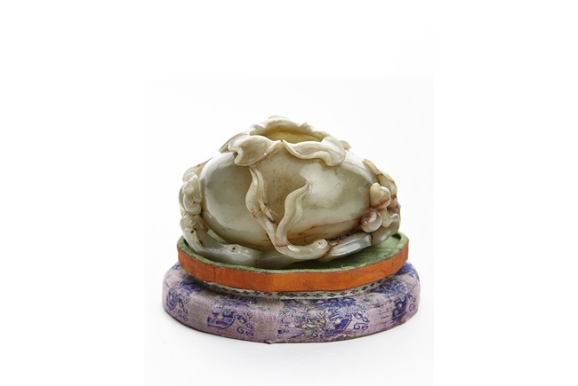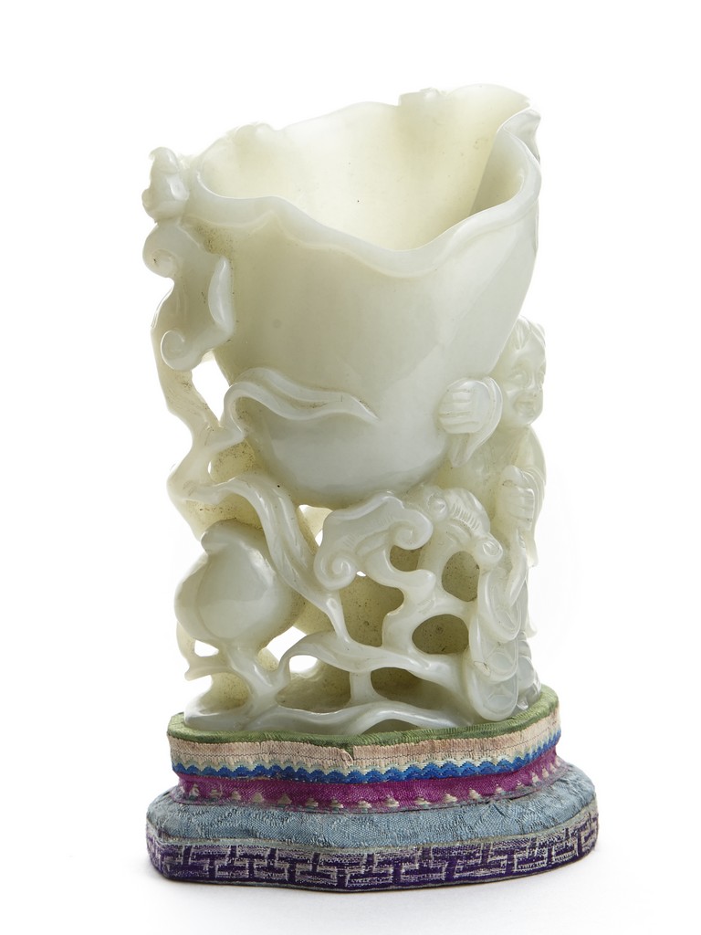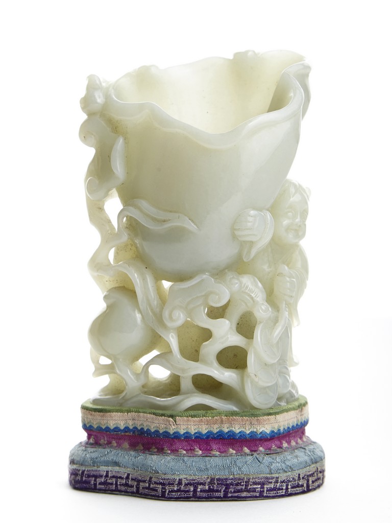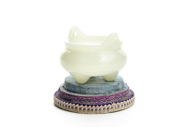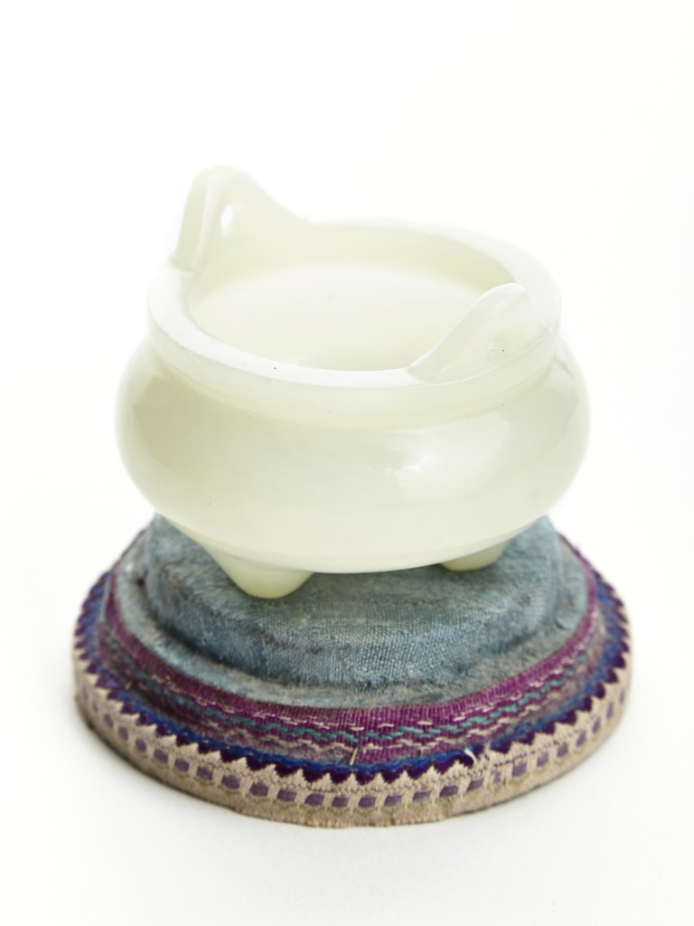 Comprising of a small white jade tripod censer of compressed globular body, the rim supporting two upright arched handles extending outward; a white jade well-hollowed flower pot modelled in magnolia form, supported on gnarled branches with lingzhi and peaches, above a young boy holding a string of coins on one hand; a celadon jade waterpot of peach form surrounded by gnarled flowering branches, the stone with dark russet veins. Qing Dynasty period.