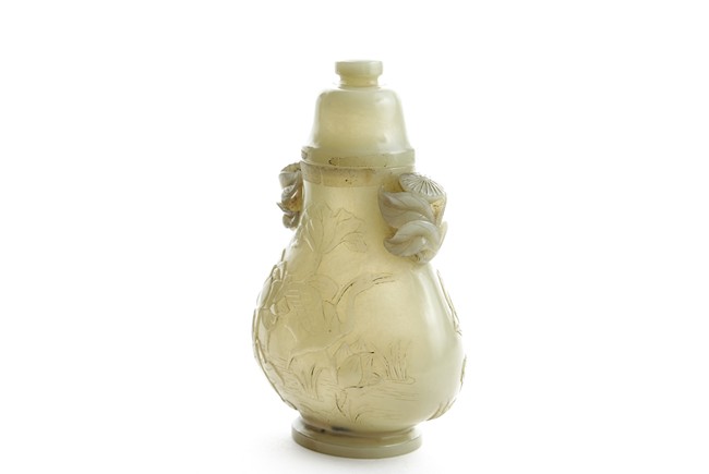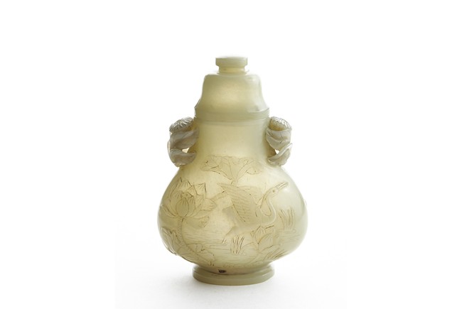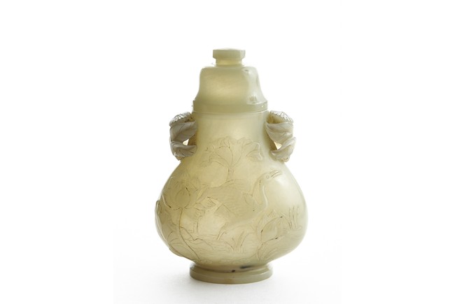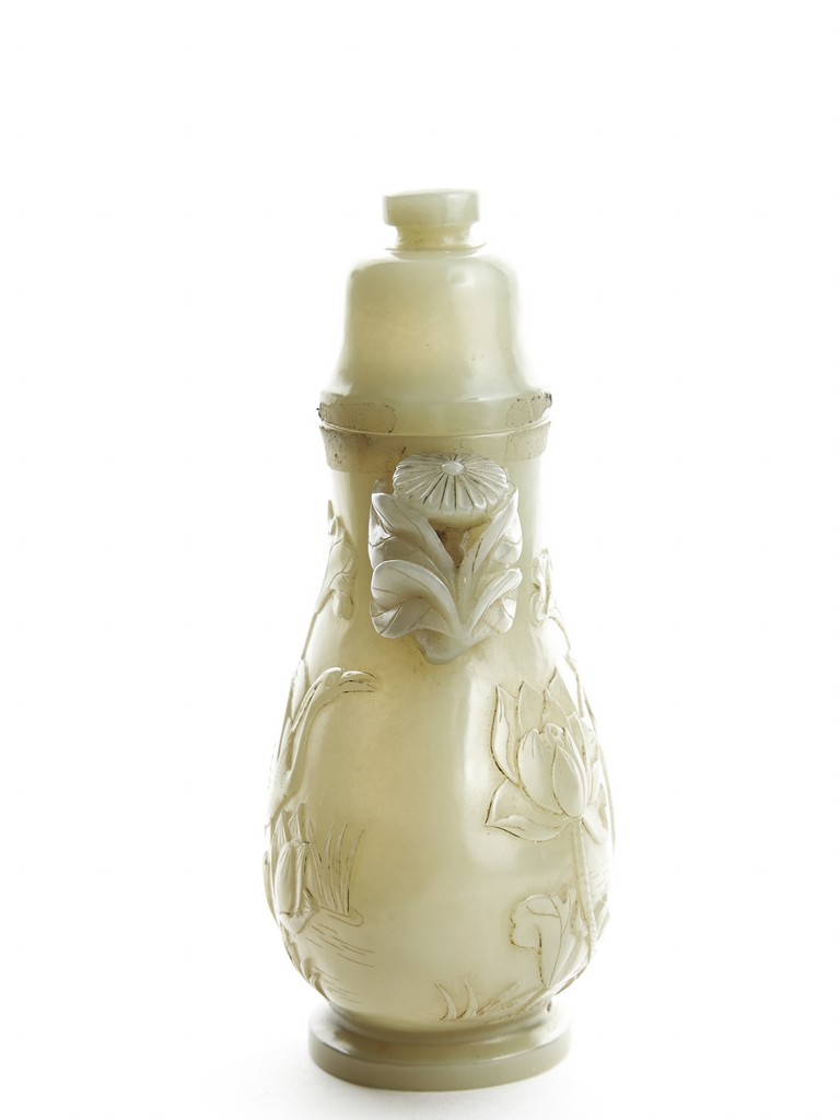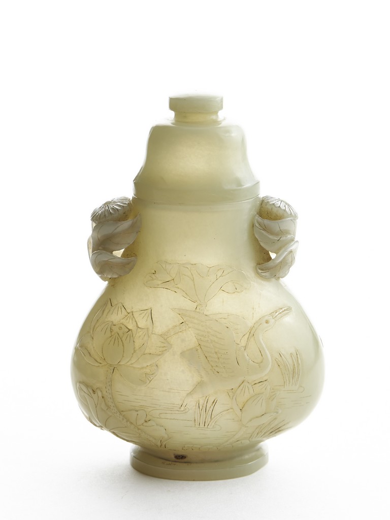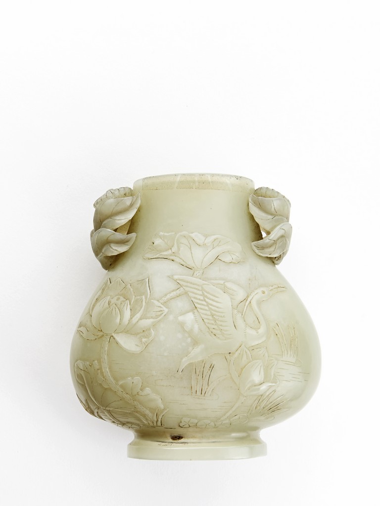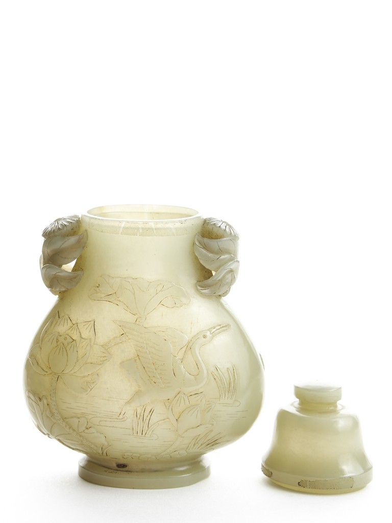 Rising from an oval foot ring, the body finely carved in shallow relief with crane ready to fly amongst tall lotus in a pond setting to the front and reverse. The neck flanked by two lotus leaf-formed handles in openwork. The cover surmounted with a button-like finial. Qing Dynasty period.
