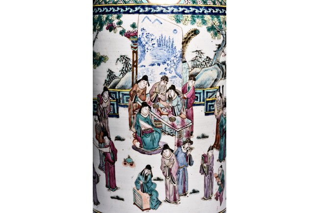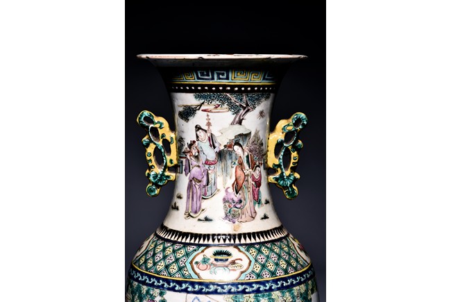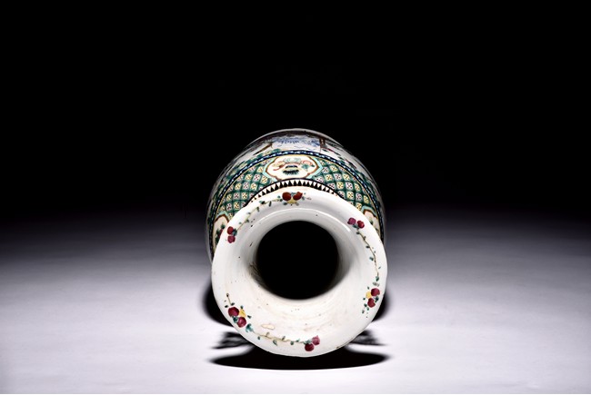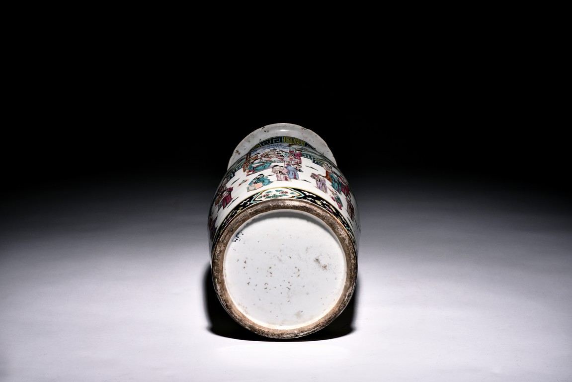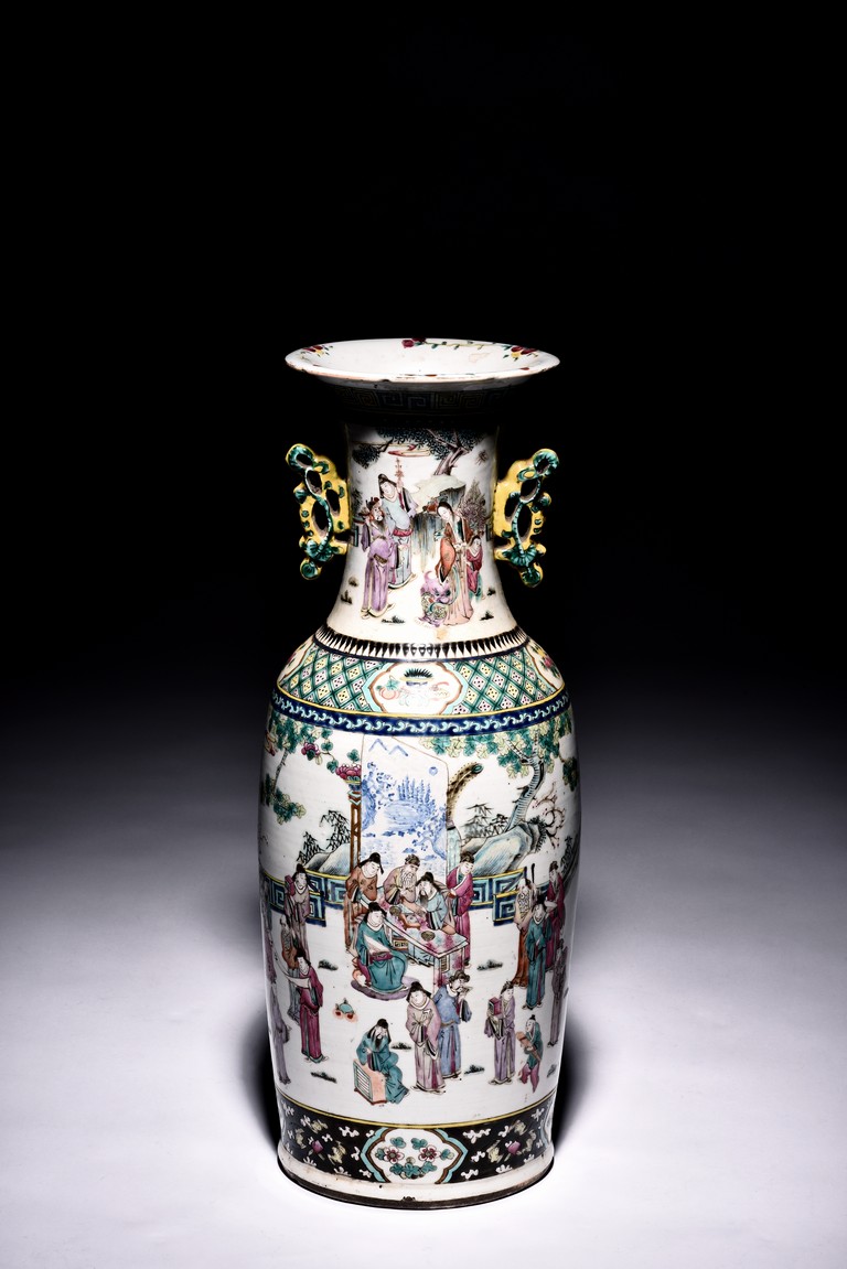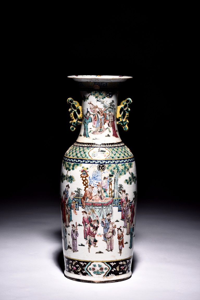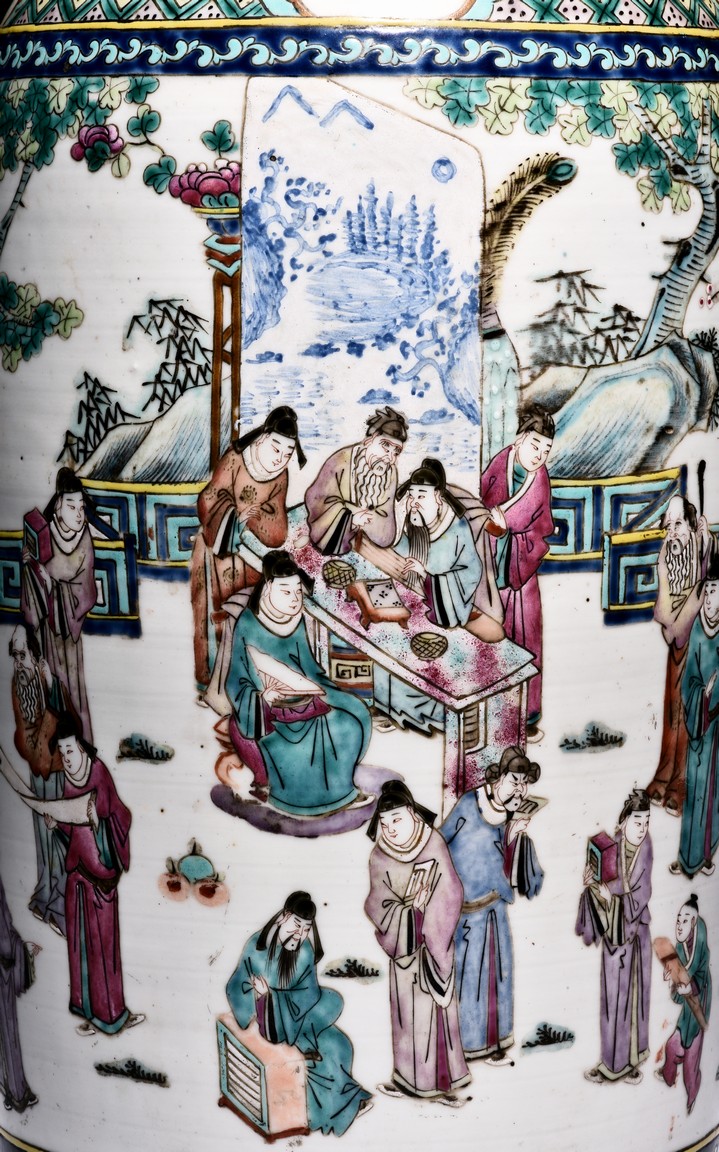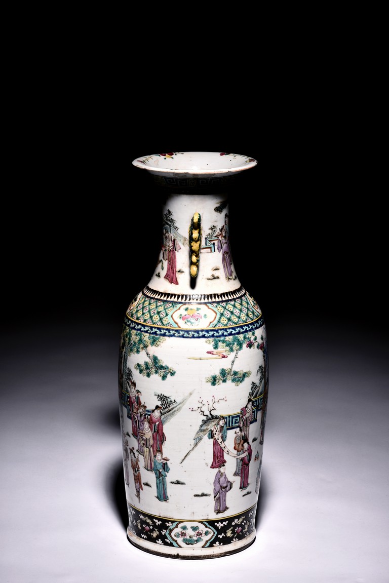 Of foliate rim, the long neck flanked by openwork handles, the body decorated with a continous scene of literai and officials engaging in conversations and scholarly lesiure in a garden setting. The neck further painted with figures of high ranking official, shoulao, and lady. Qing Dynasty period.