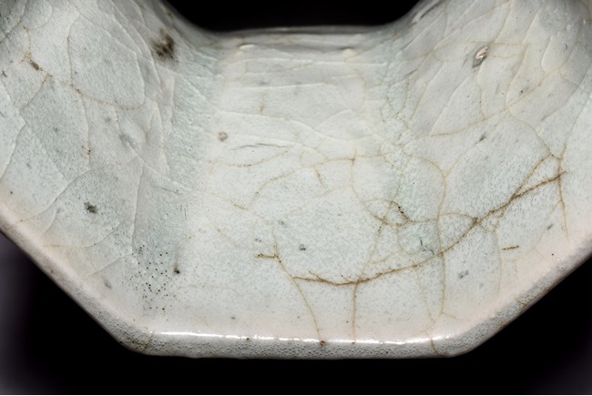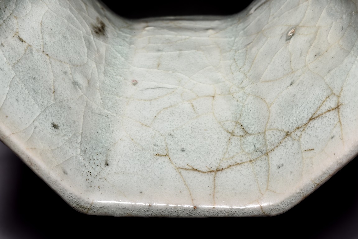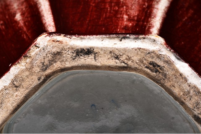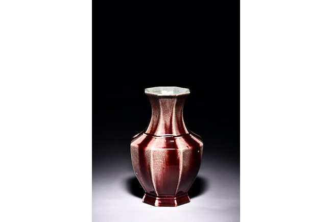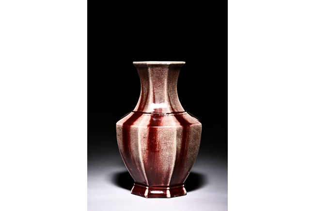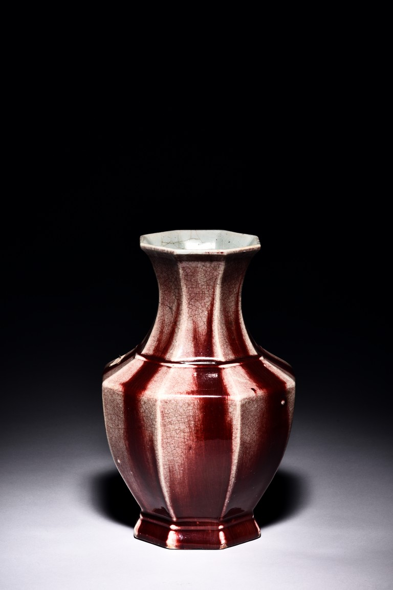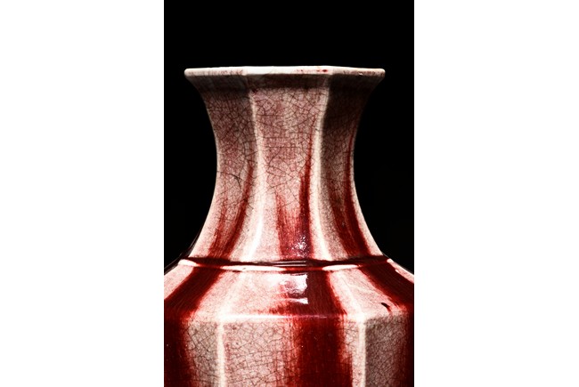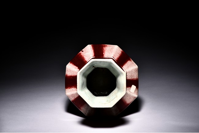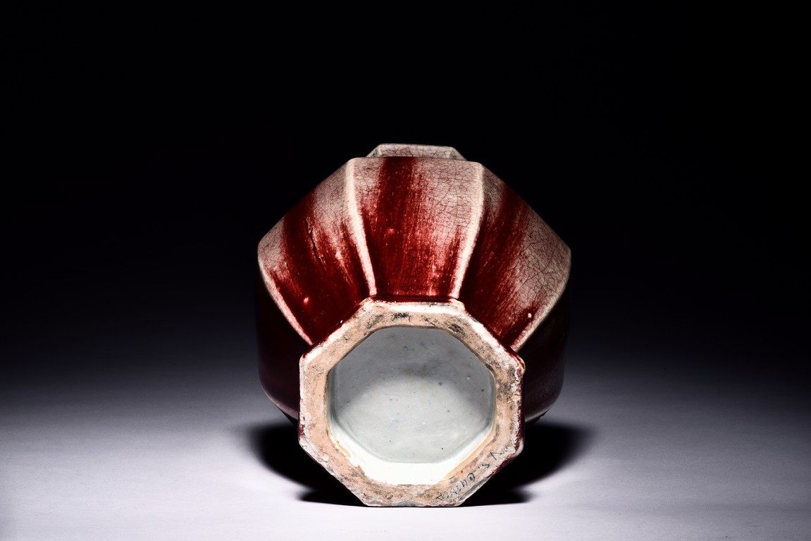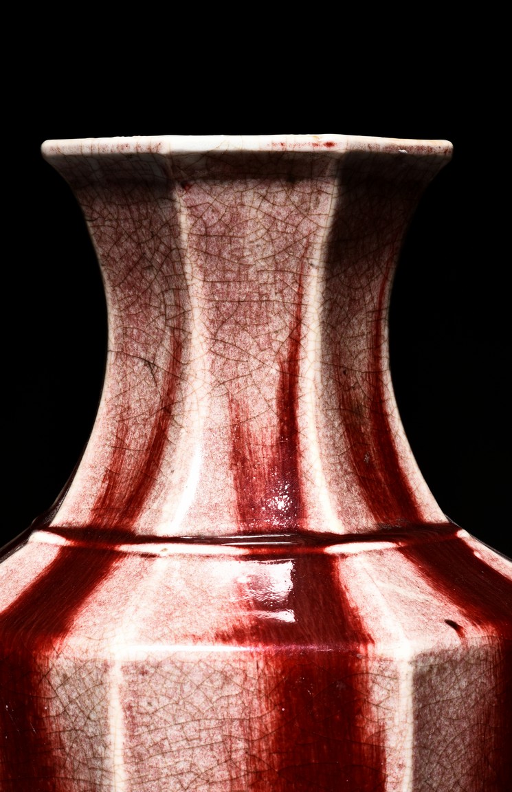 Of octagonal form, the exterior walls covered with alternating red and cream glaze suffused with networks of fine crackles. Qing Dynasty period.