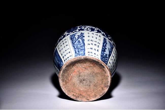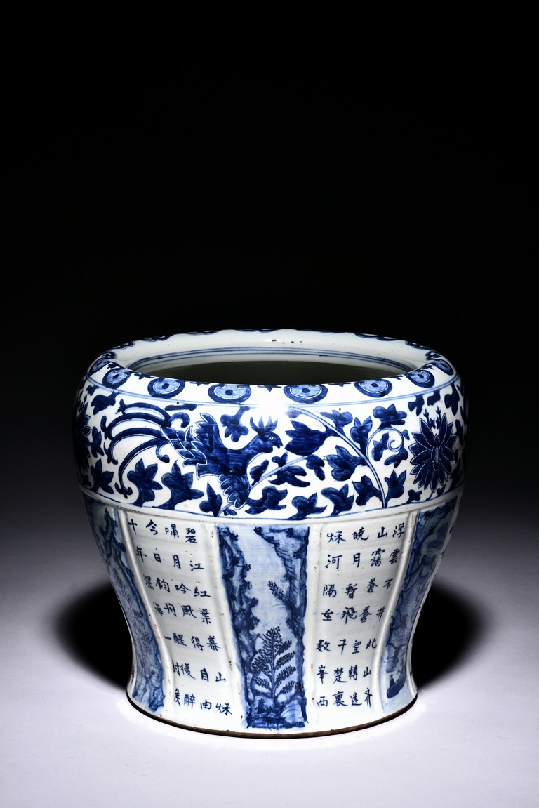 The exterior is finely painted with alternating panels of landscape and poem, with a band of phoenix and stylized scrolling floral pattern above, the inturned mouth rim decorated with a band of lingzhi pattern. Qing Dynasty period.