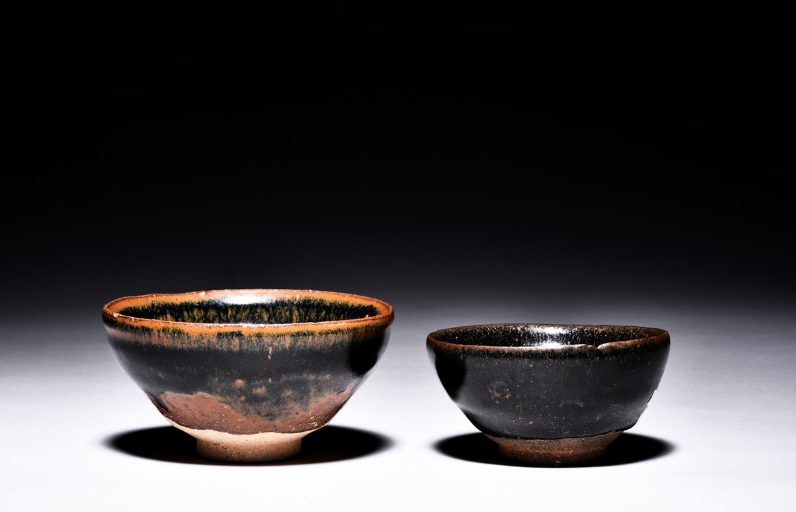 Including a bowl with rounded sides covered overall with thick black glaze, another covered with black glaze with russet markings along the mouth rim. Both bottom unglazed revealing the buff body. Song Dynasty period.