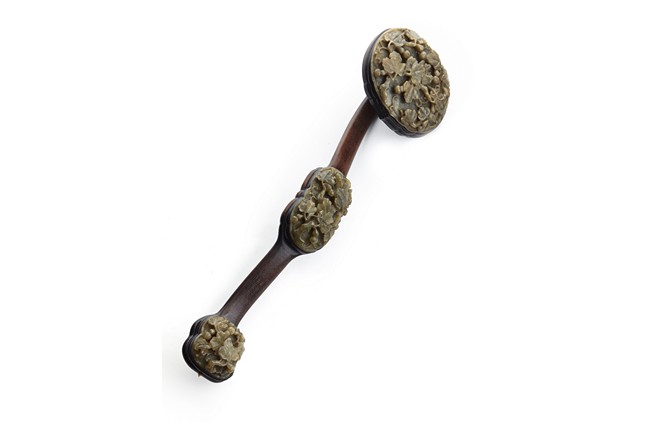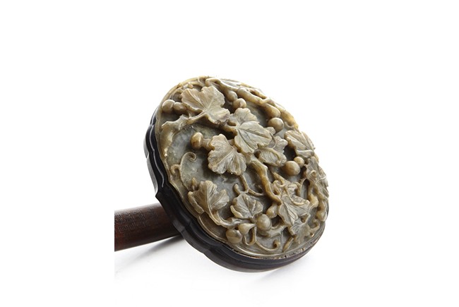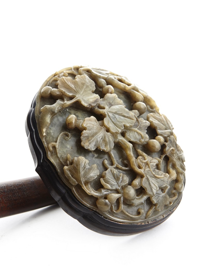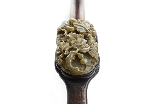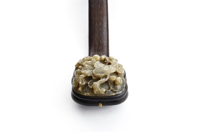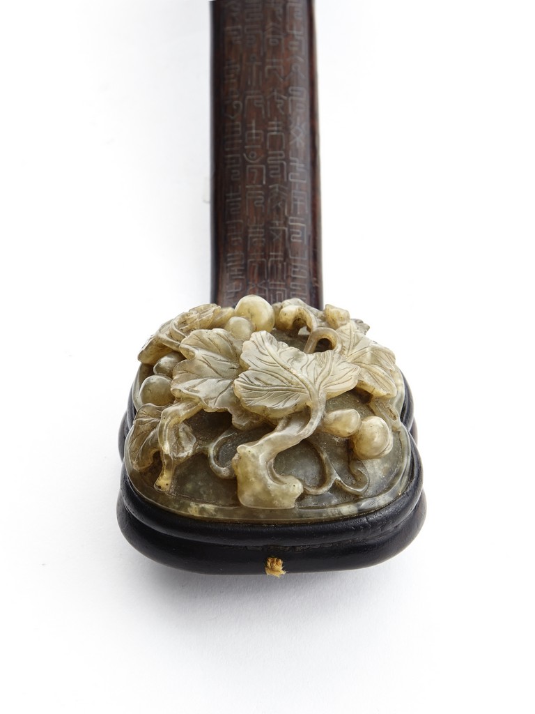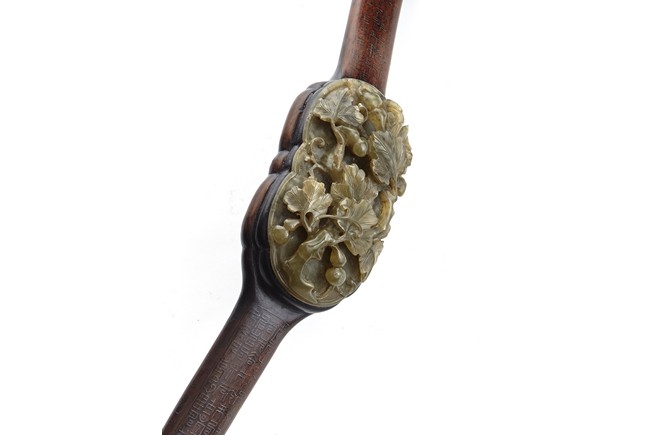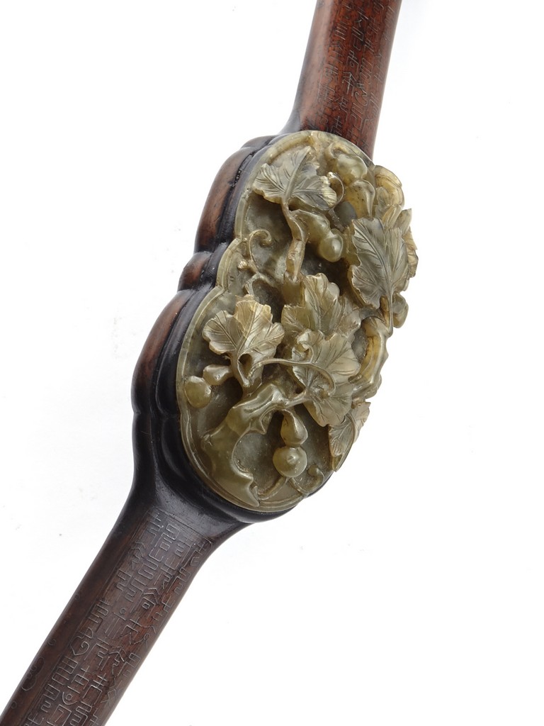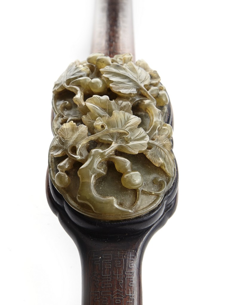 The ruyi head is finely carved with a celadon jade plaque depicting a leafy gourd branch in relief, the hardwood shaft finely inlaid in silver wire with inscription, the lower end further inset with a panel depicting leafy gourd. Qing Dynasty period.