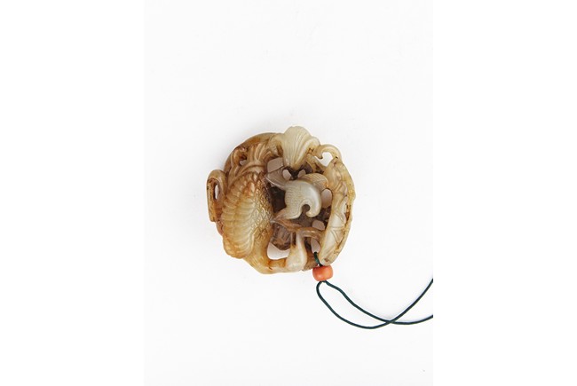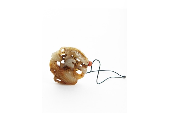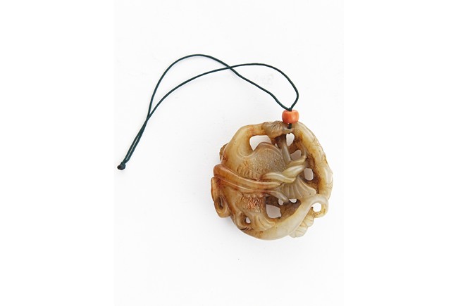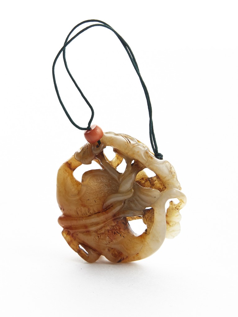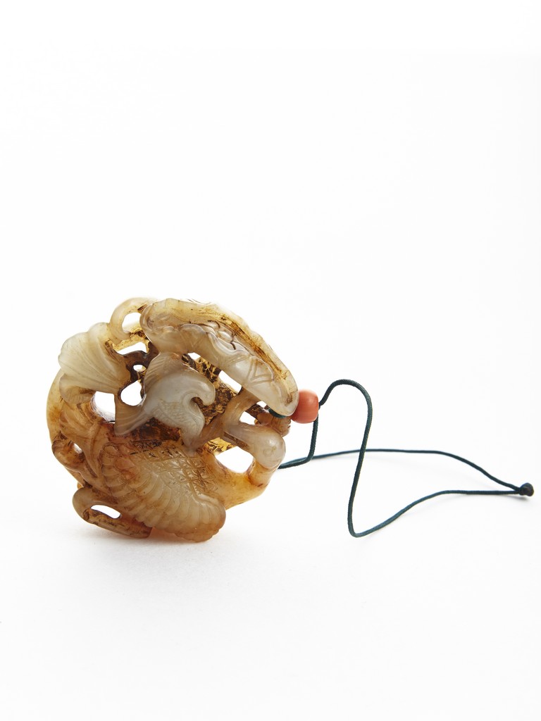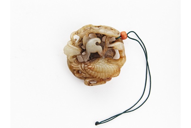 Of round form, reticulated in openwork with a wild goose chased by a hawk against a ground of lotus leaves and blossoms, the stone of white tone with extensive russet area. Ming Dynasty period.