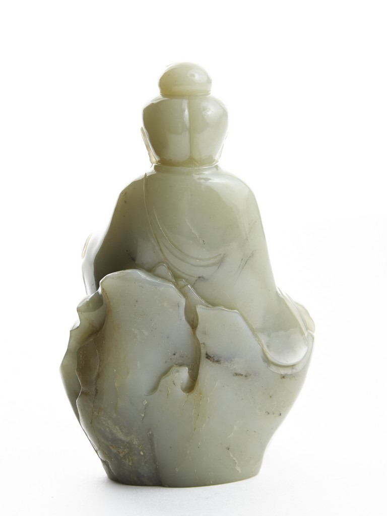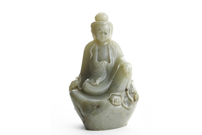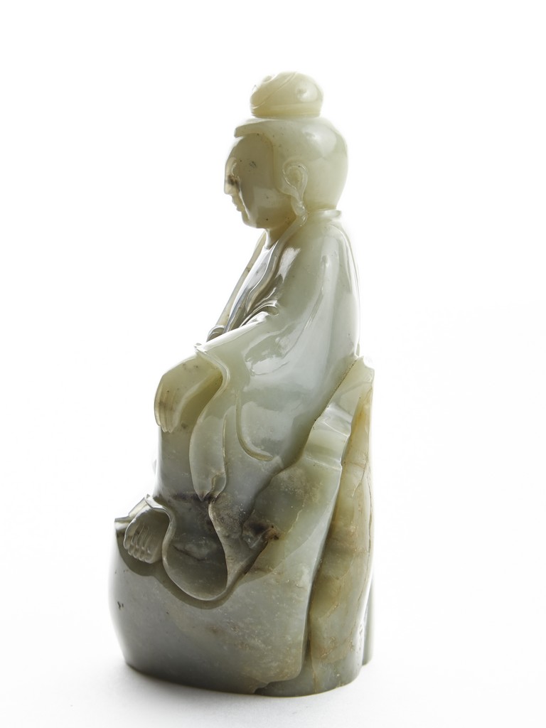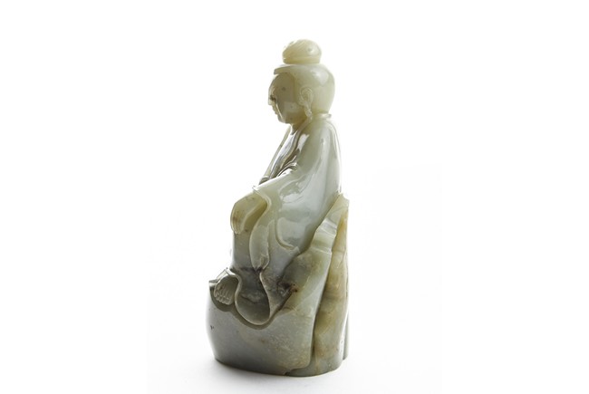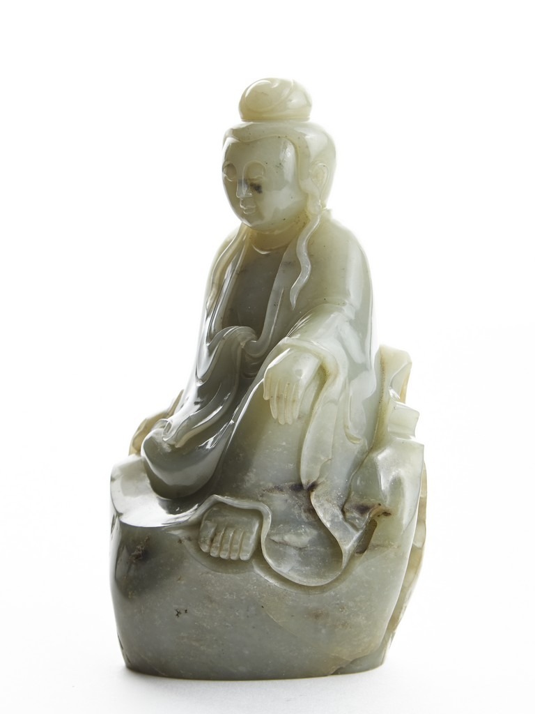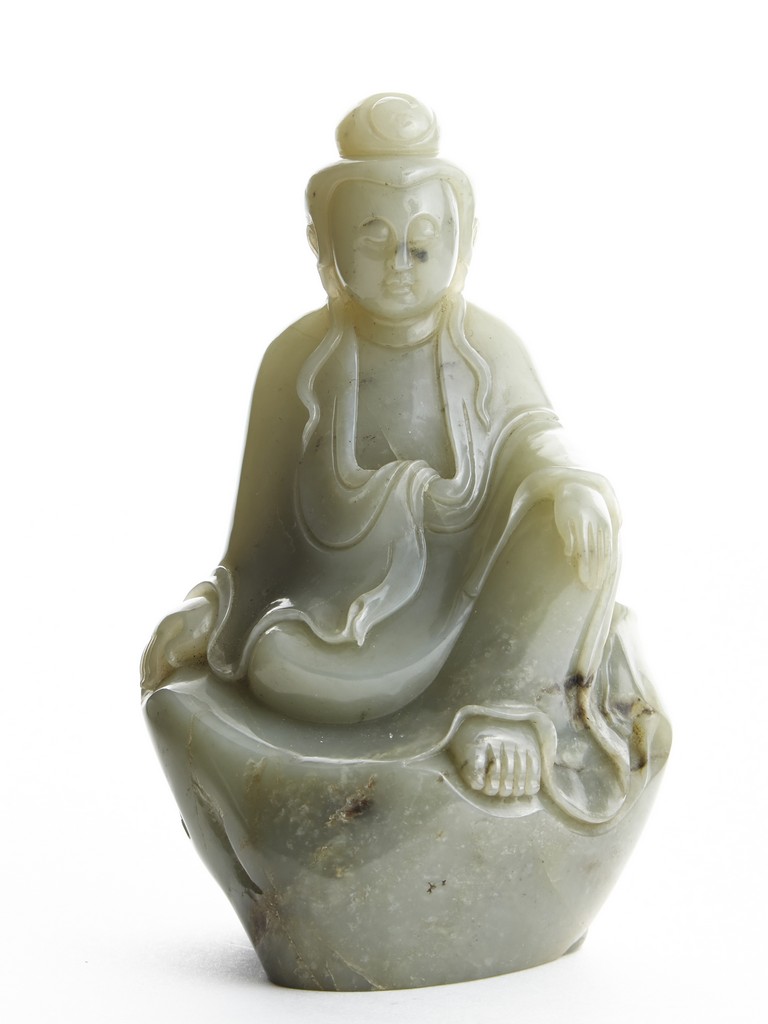 Carved with a seated Guanyin figure with left hand rested on raised knee, wearing long and voluminous robe, the face with meditative expression with eyes closed, her hair tied into a topknot. Qing Dynasty period.