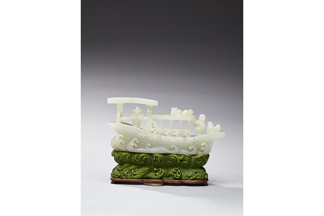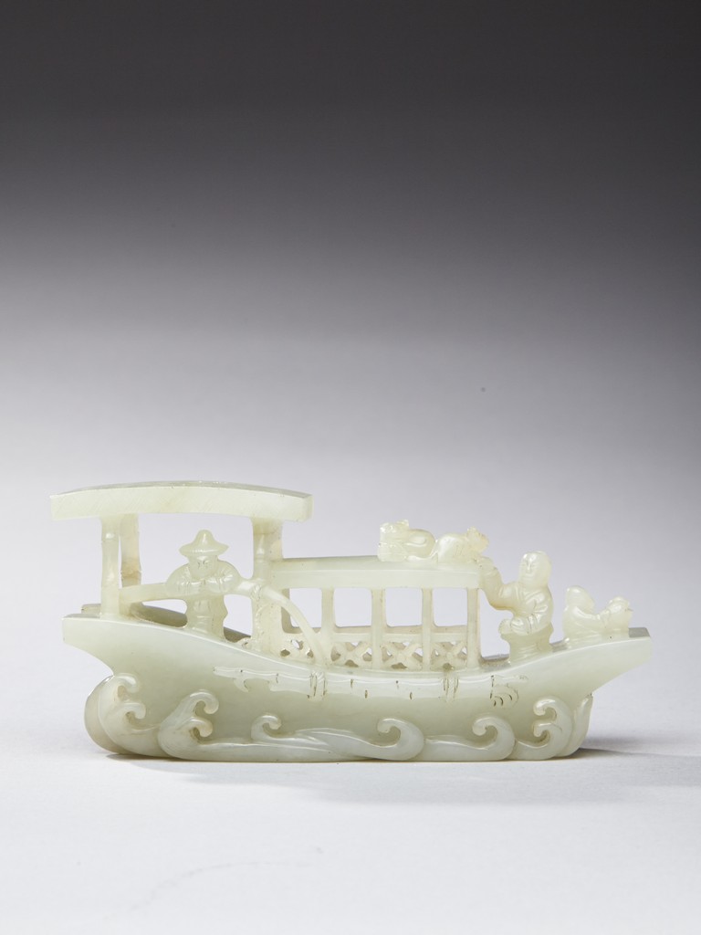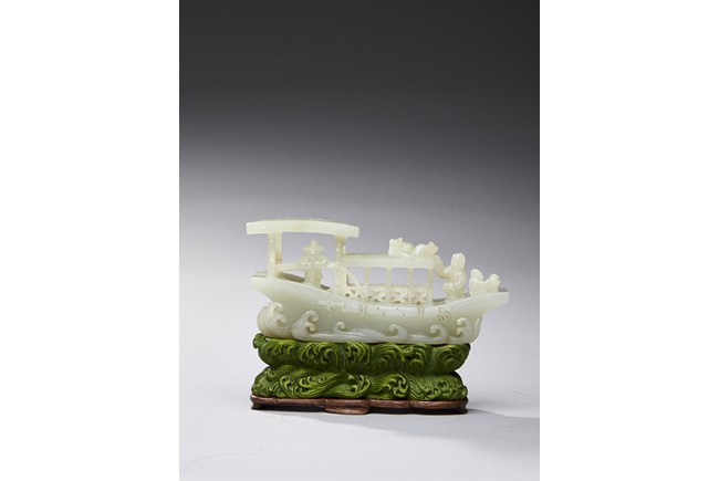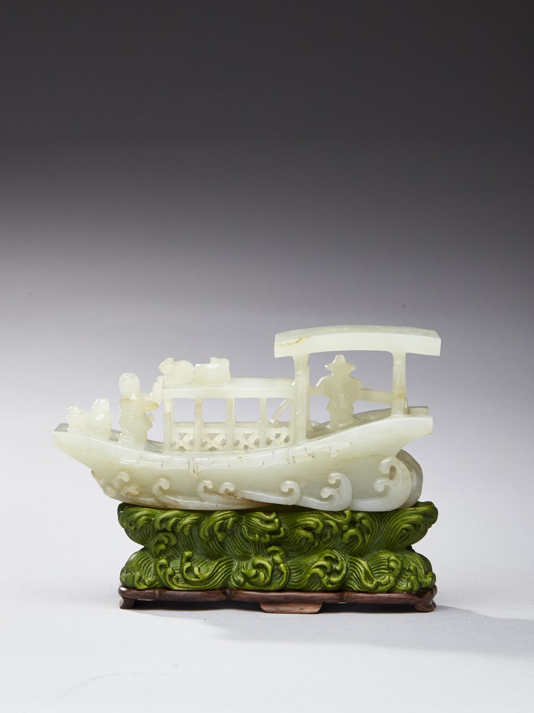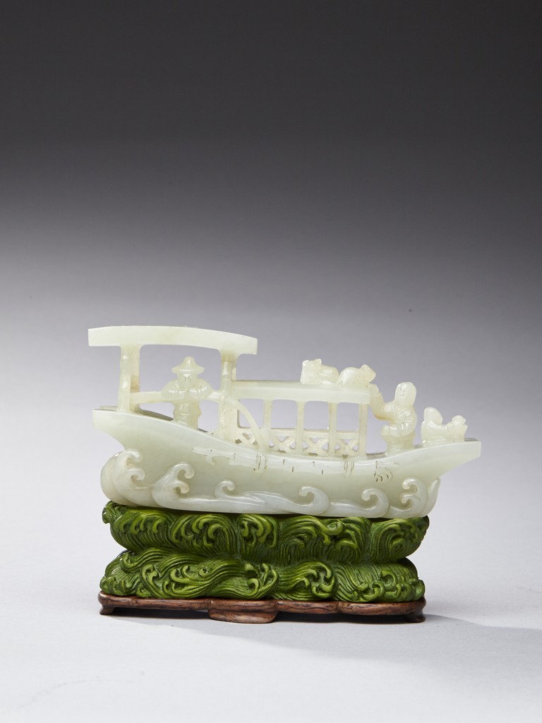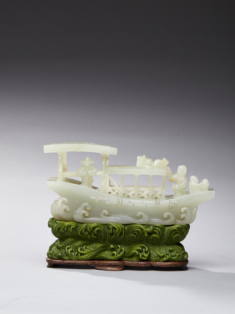 The boat is carved and pierced with reticulated windows and incised roof, carrying three passengers and two pets on the roof, all above cresting waves. The hardwood stand is further painted and carved as turbulent waves. Qing Dynasty period.
