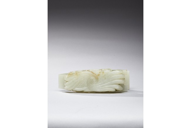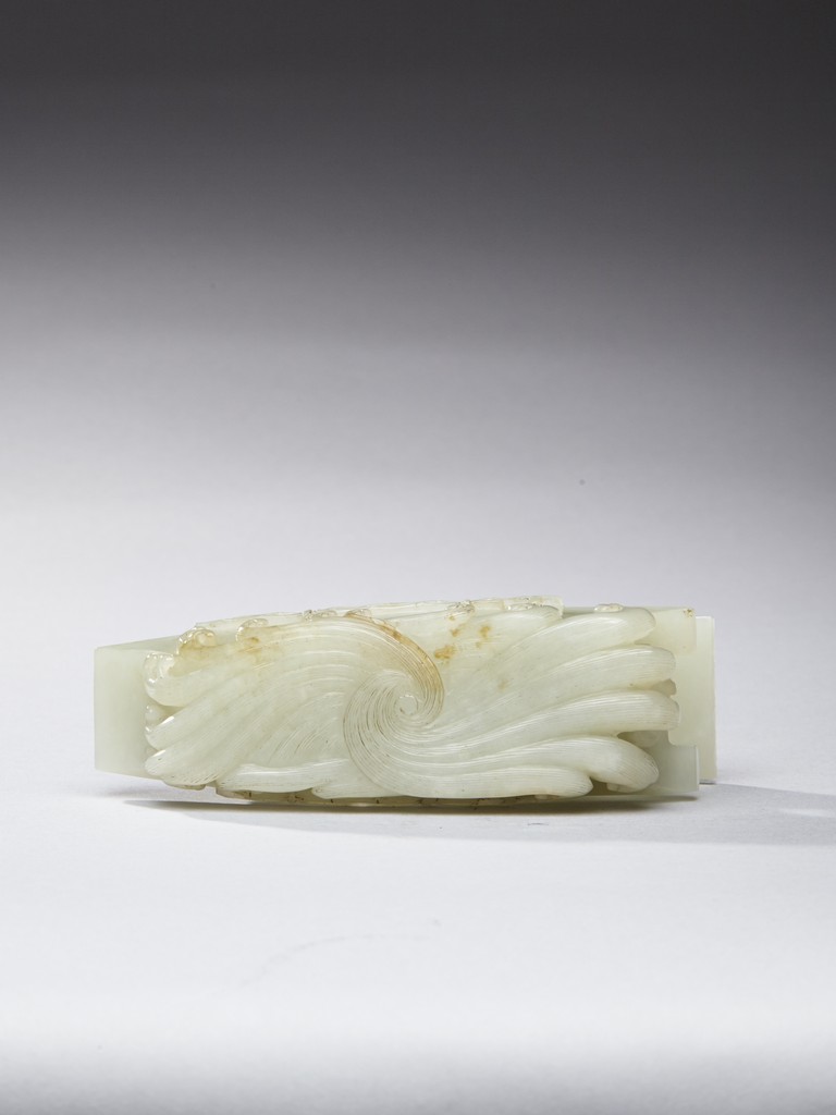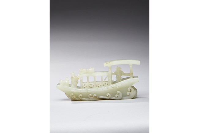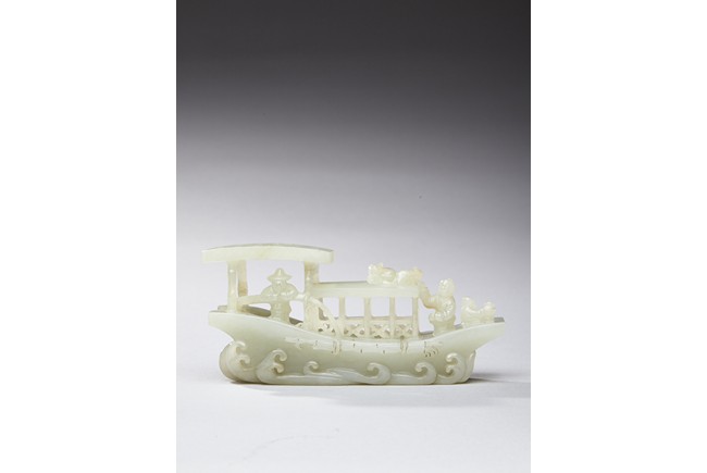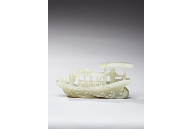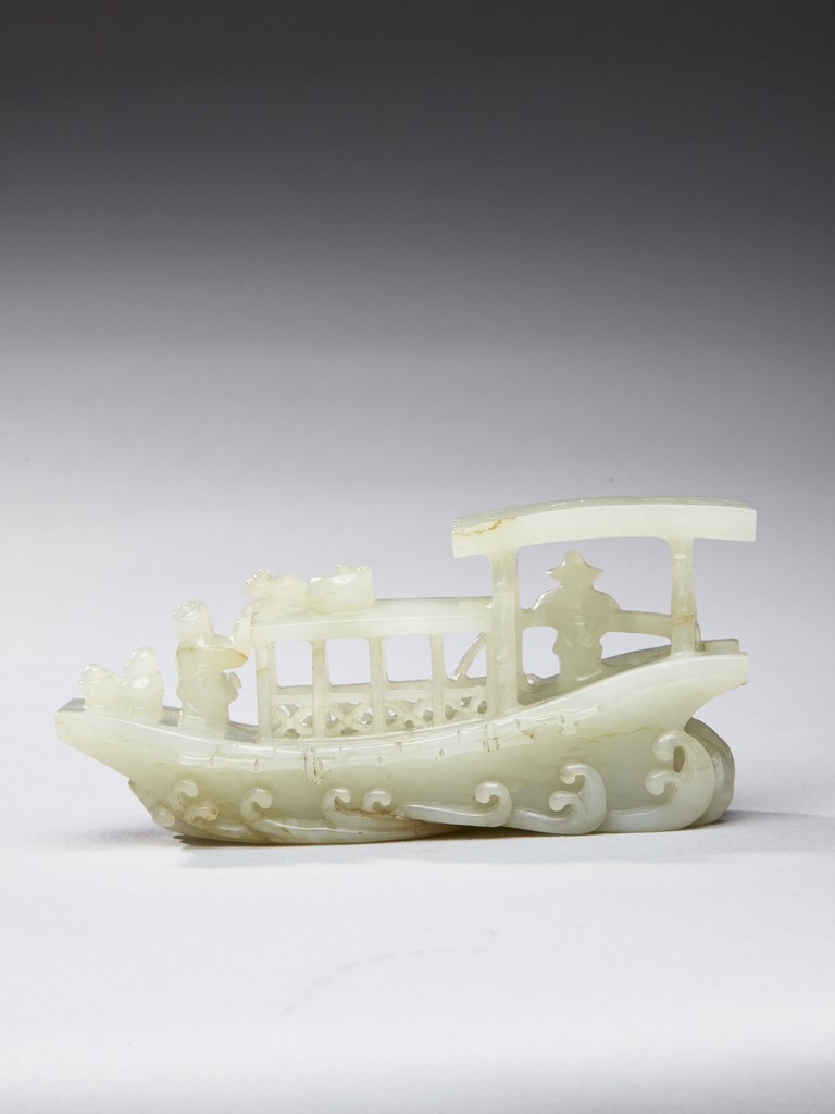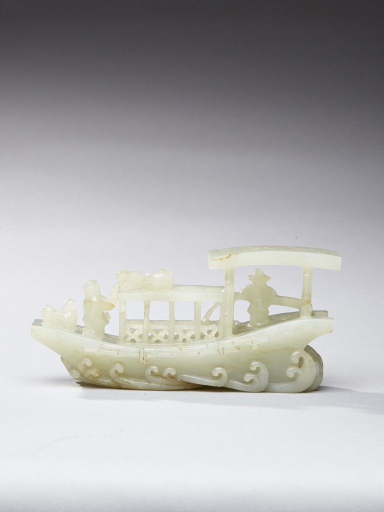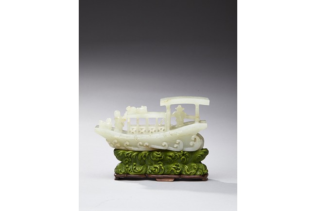 The boat is carved and pierced with reticulated windows and incised roof, carrying three passengers and two pets on the roof, all above cresting waves. The hardwood stand is further painted and carved as turbulent waves. Qing Dynasty period.