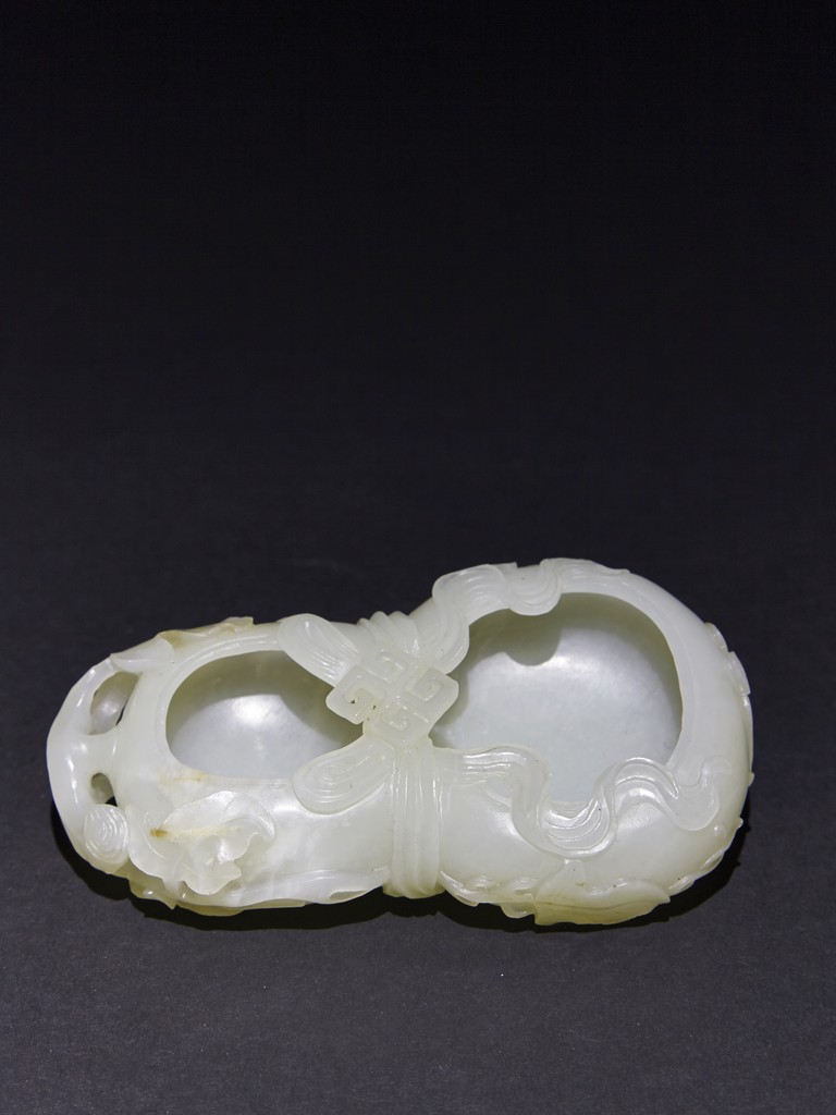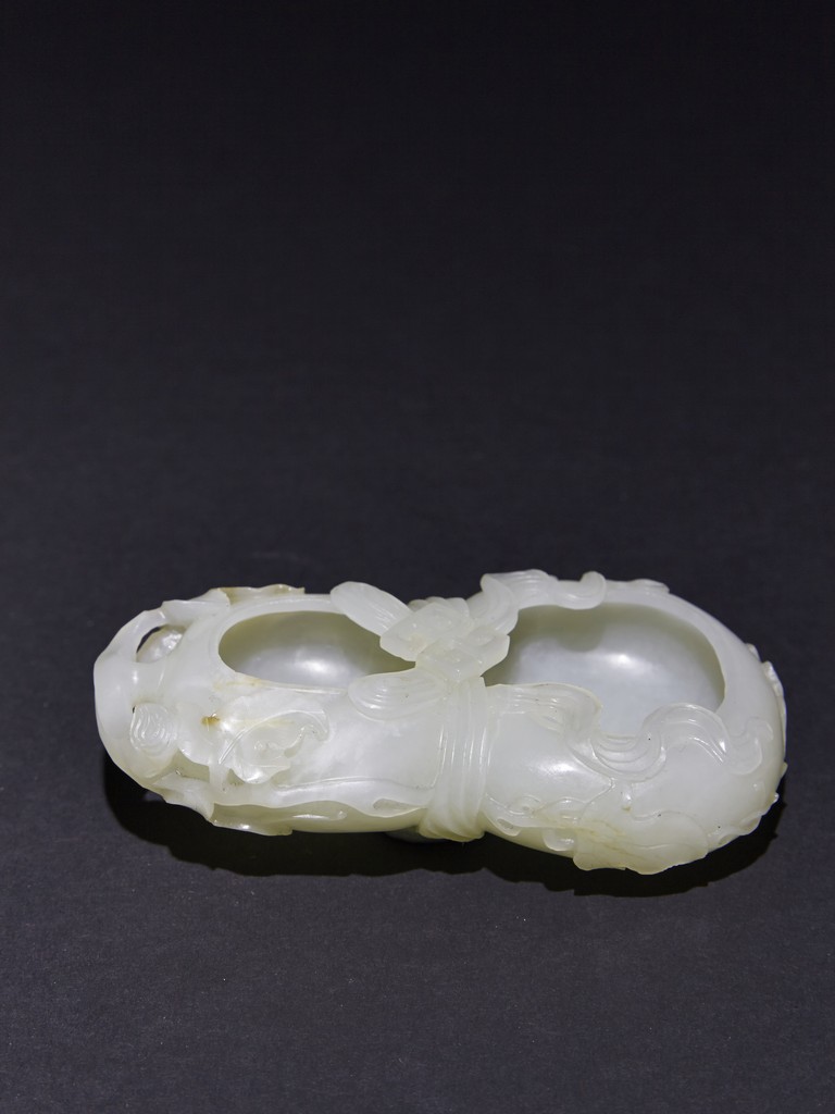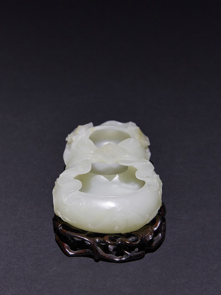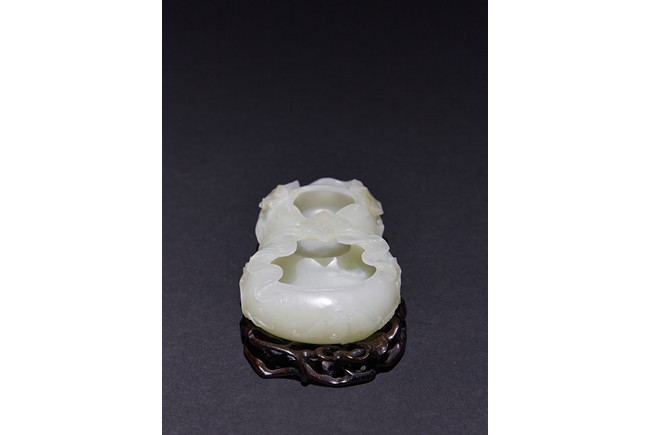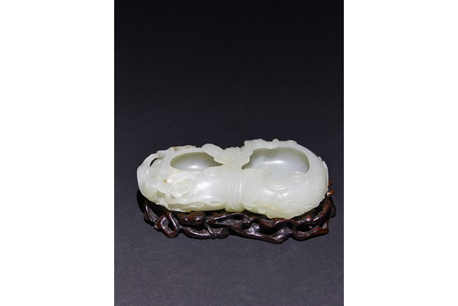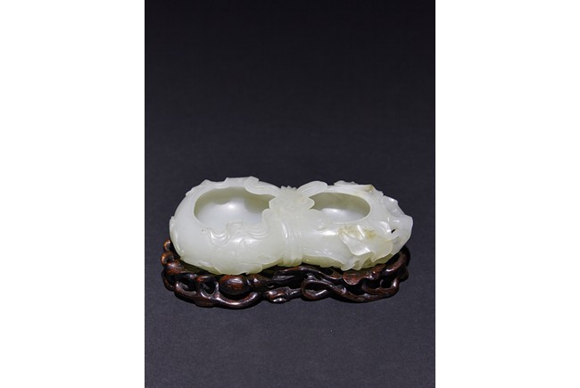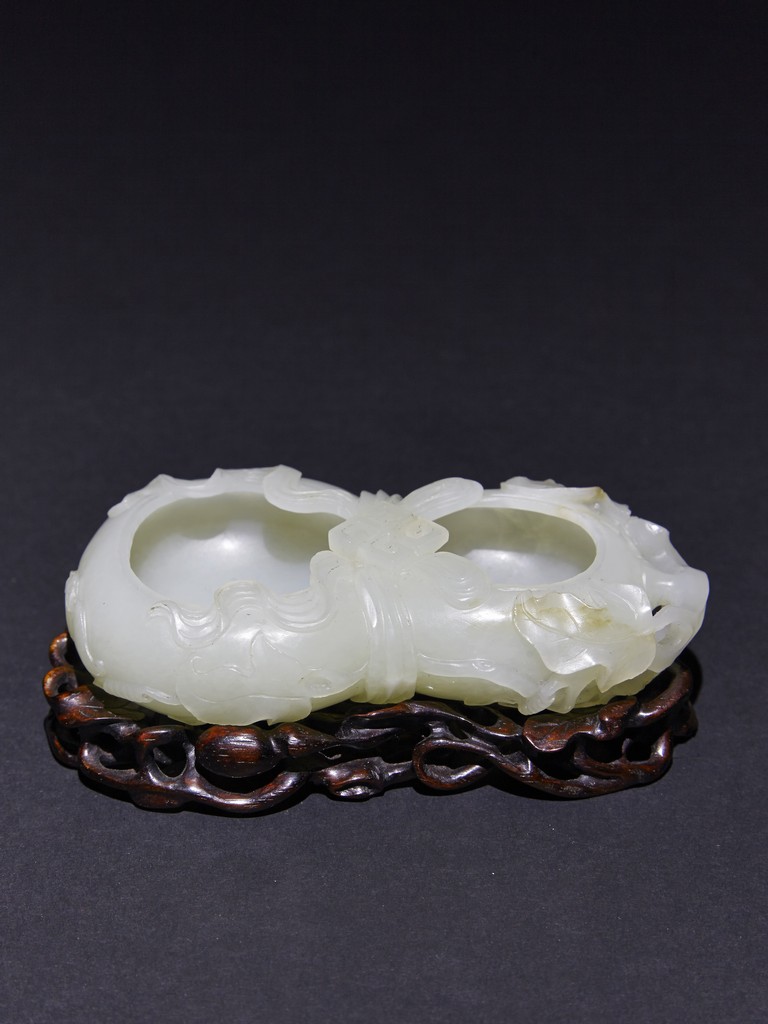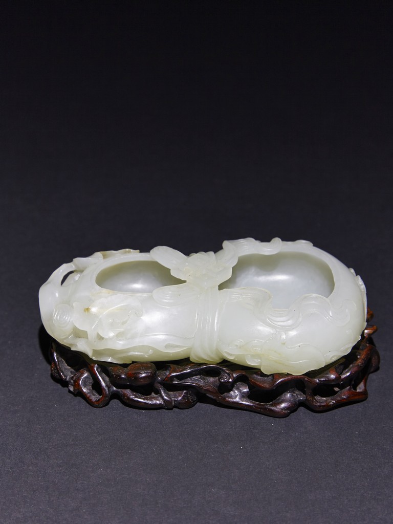 The washer is carved in the form of well-hollowed double gourd borne on openwork leafy branches to one side in high relief, the other side with auspicious bat, with sash tied across center, all supported on pierced hardwood stand. Qing Dynasty period.
