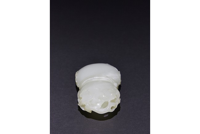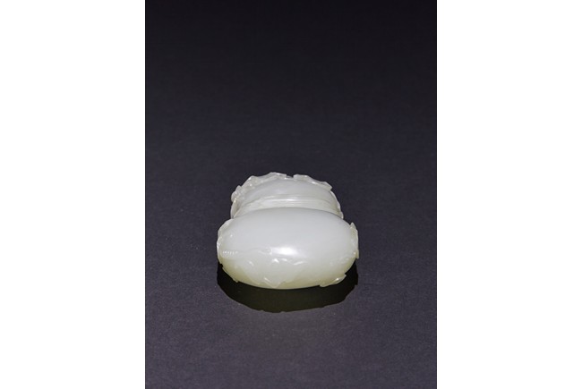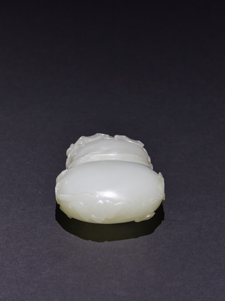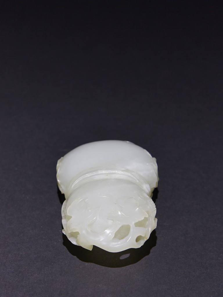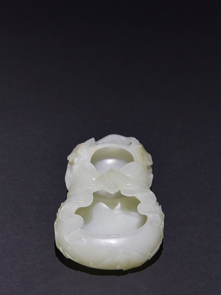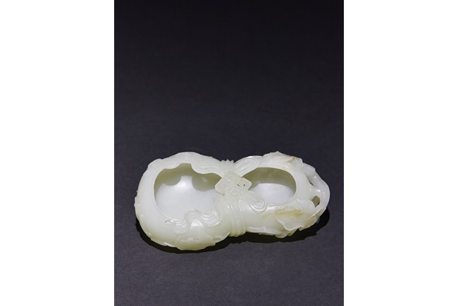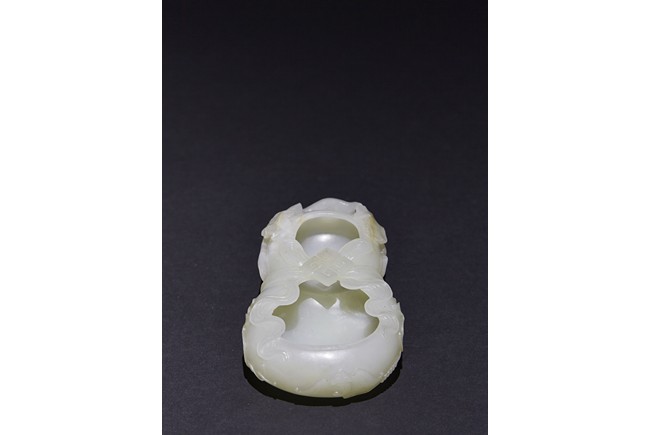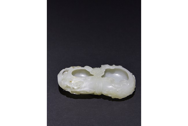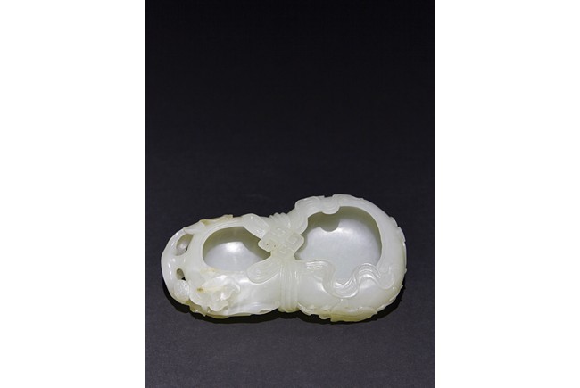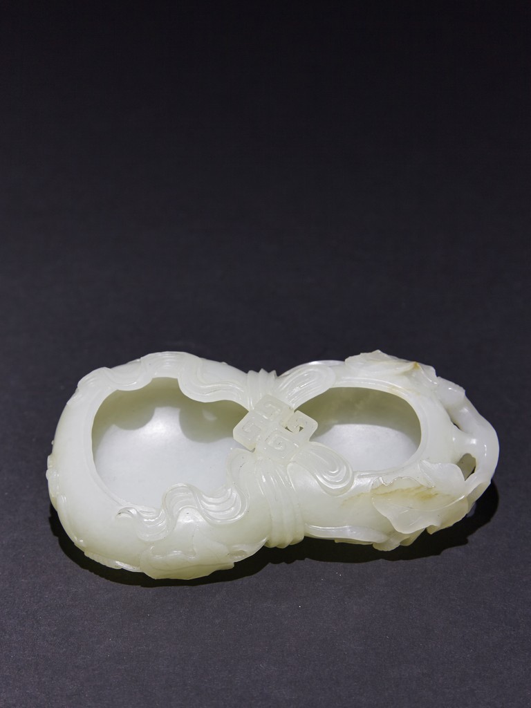 The washer is carved in the form of well-hollowed double gourd borne on openwork leafy branches to one side in high relief, the other side with auspicious bat, with sash tied across center, all supported on pierced hardwood stand. Qing Dynasty period.
