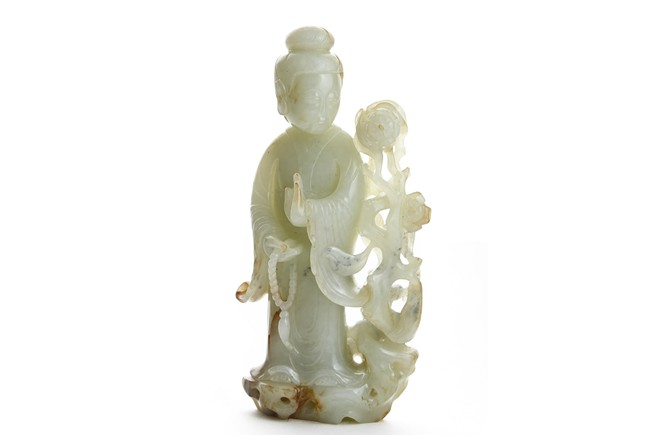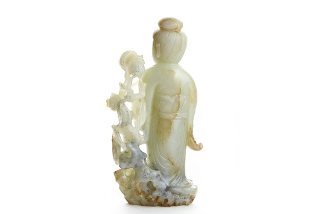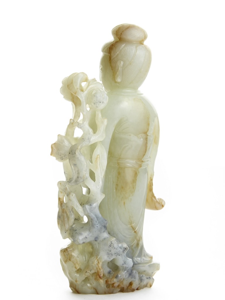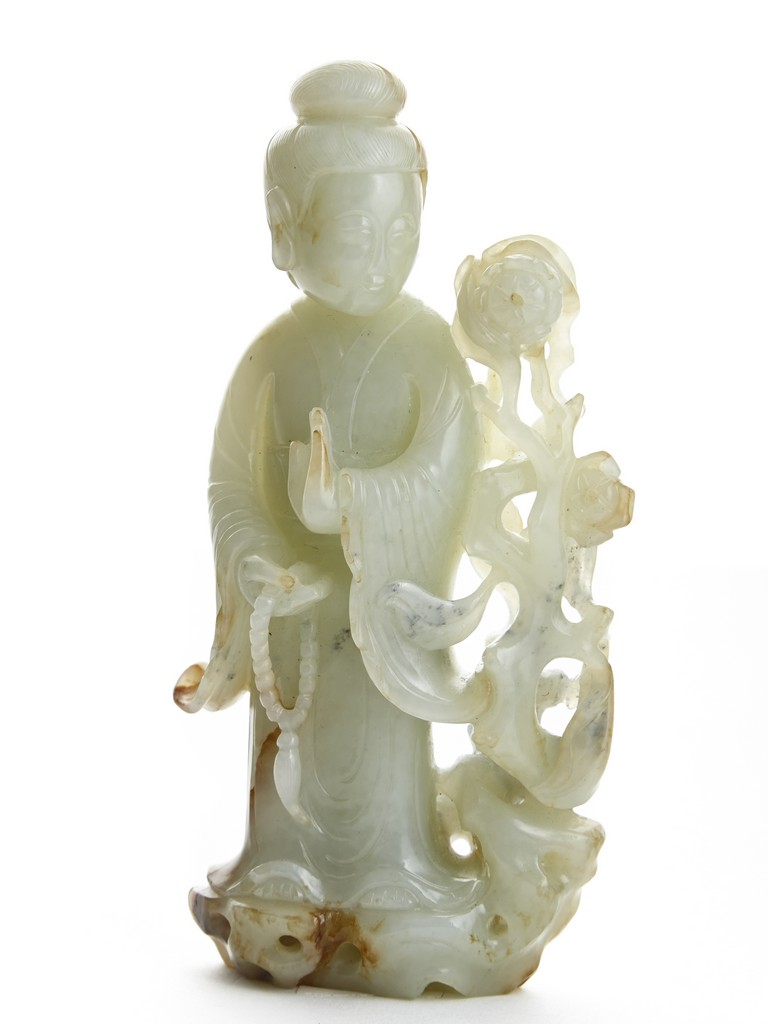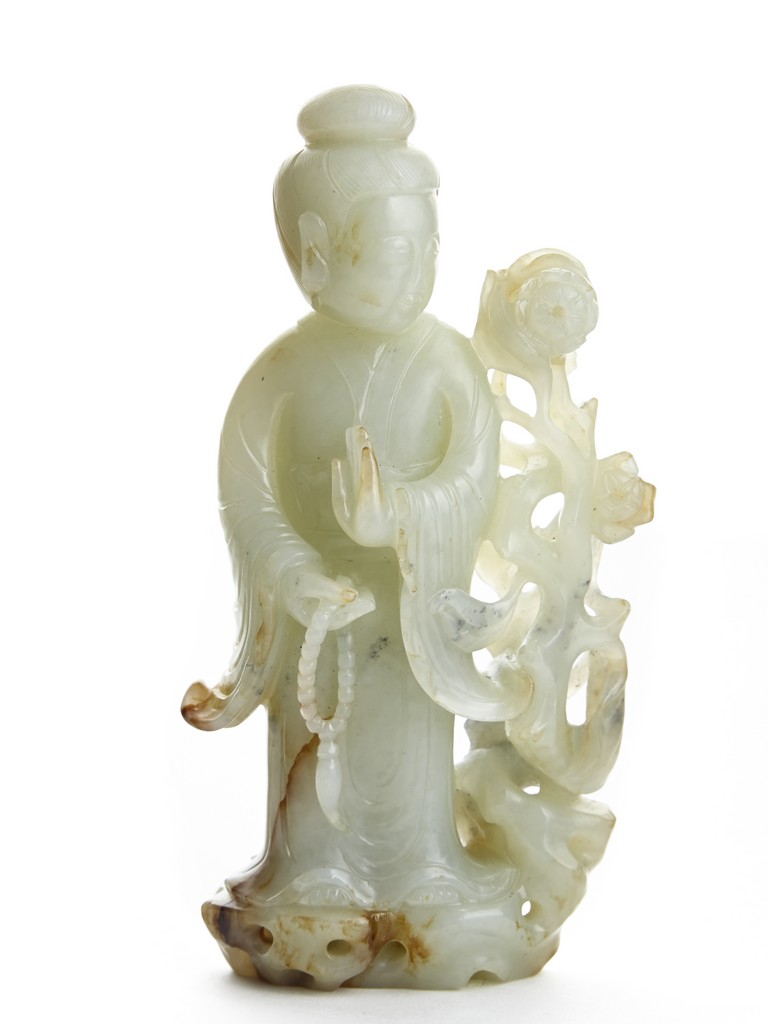 The figure is carved standing by a openwork rockwork issuing chrysanthemum flower, his right hand holding rosary beads, wearing long robe falling in elegant folds, head slightly turned to side, face with serene expression and hair highly detailed with incised lines. The stone is of white tone with russet veins. Qing Dynasty period.