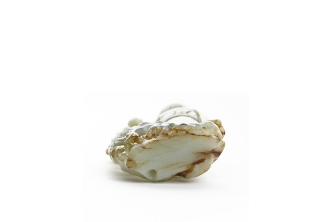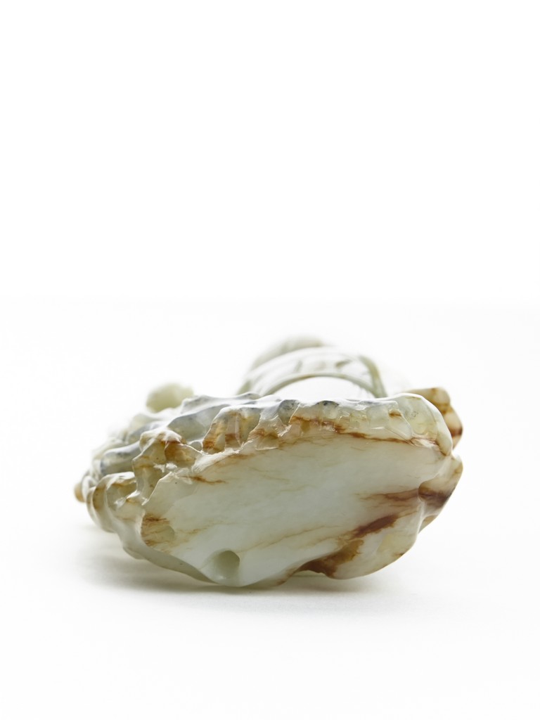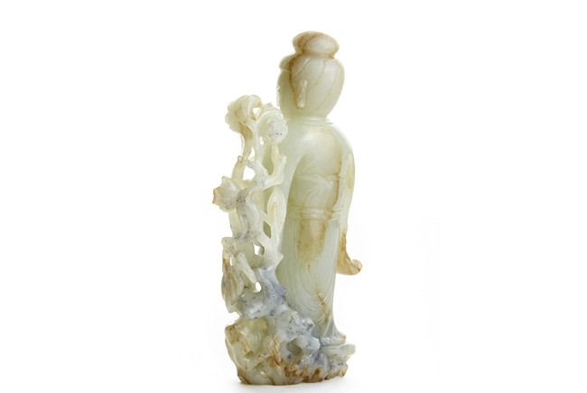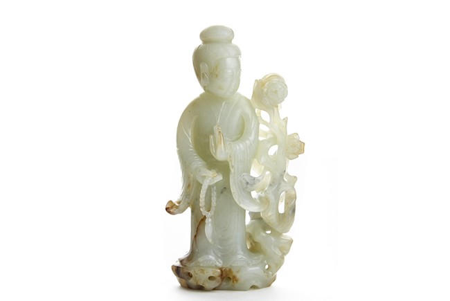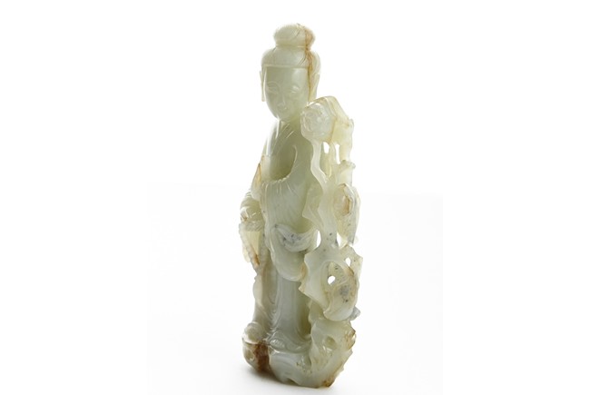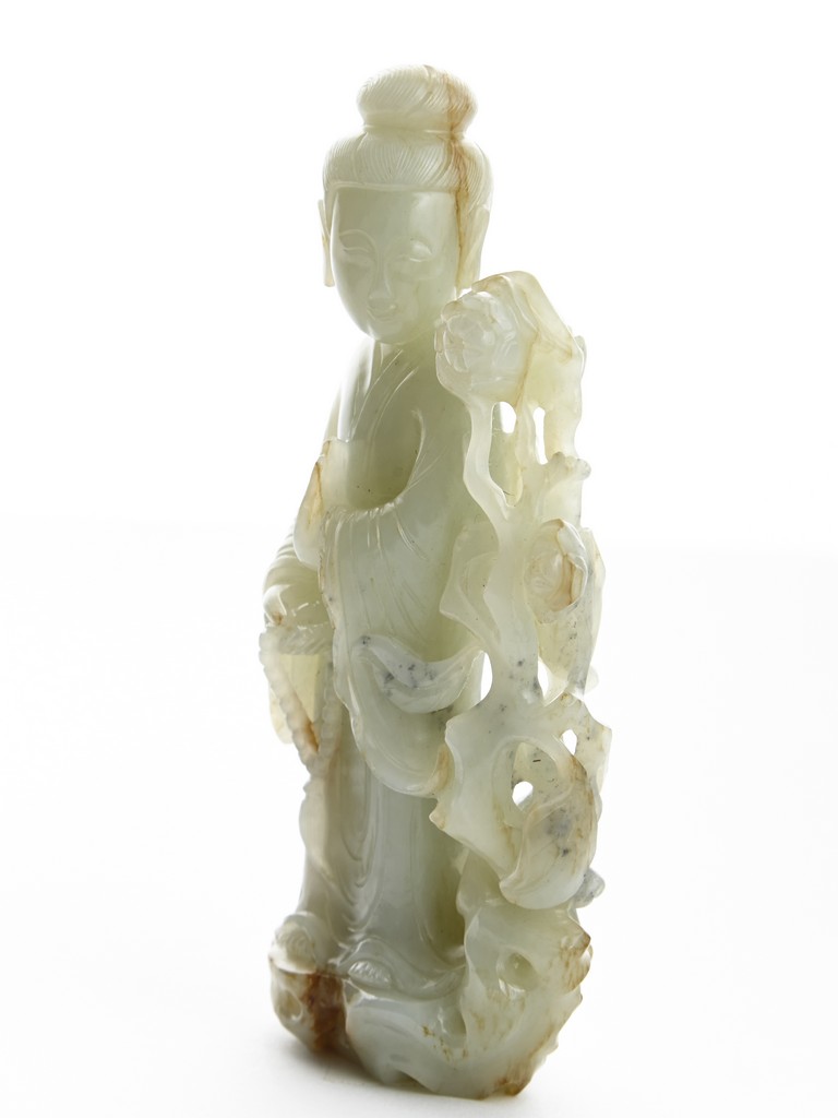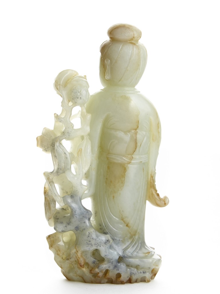 The figure is carved standing by a openwork rockwork issuing chrysanthemum flower, his right hand holding rosary beads, wearing long robe falling in elegant folds, head slightly turned to side, face with serene expression and hair highly detailed with incised lines. The stone is of white tone with russet veins. Qing Dynasty period.