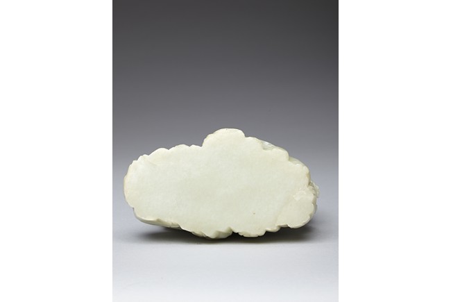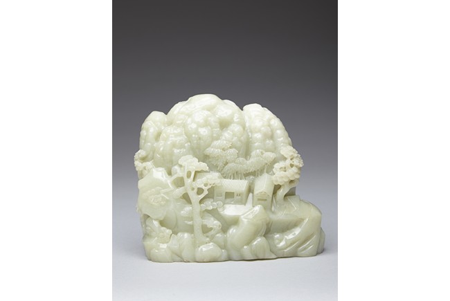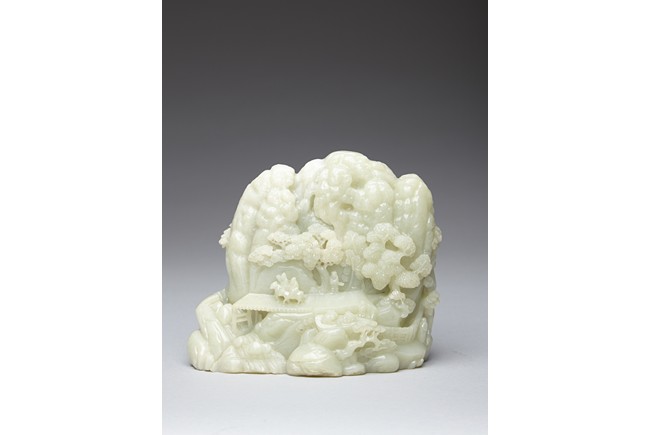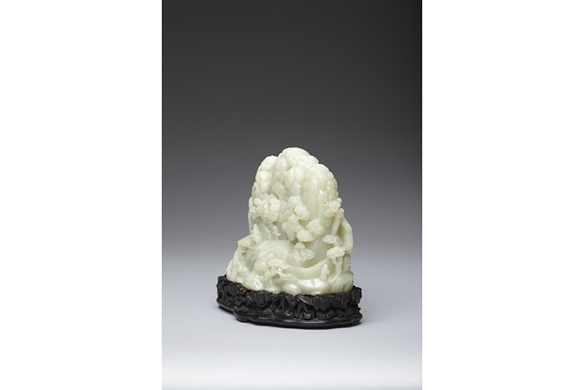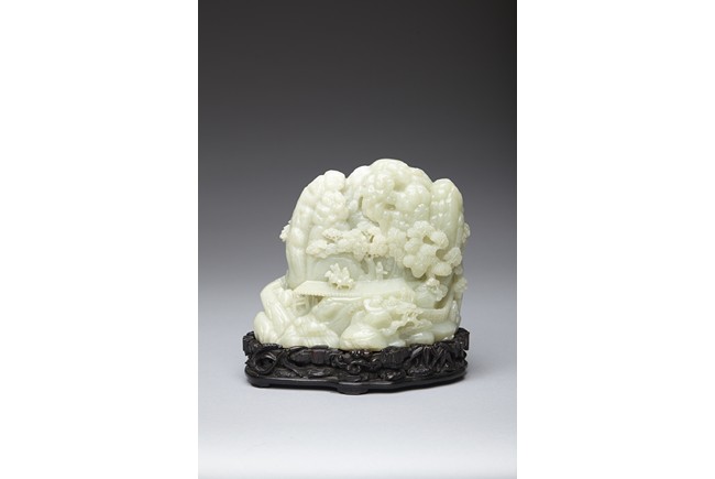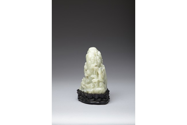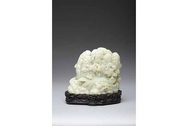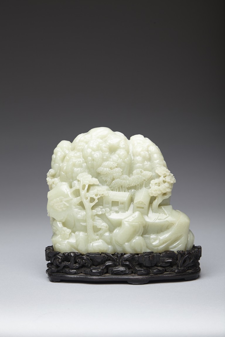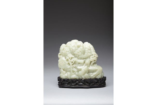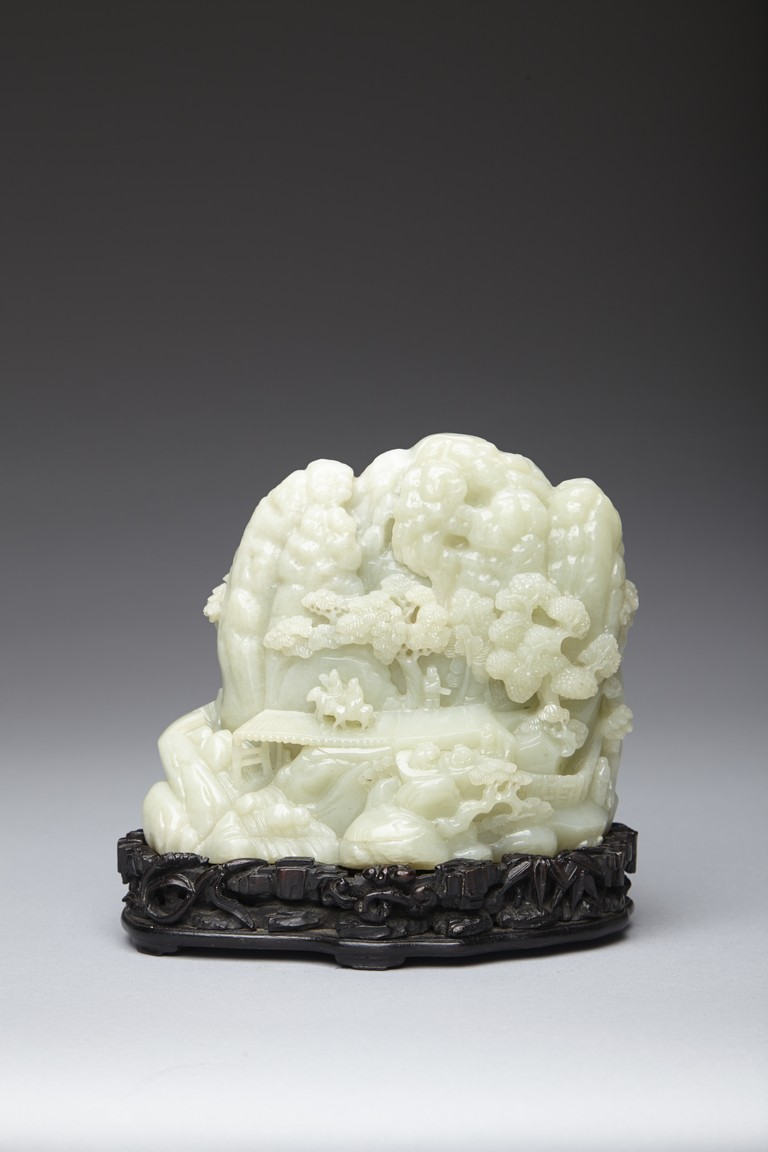 The jade boulder is carved to the front with departure of two scholars upon horse on a bridge above flowing stream and a figure under tall pine tree, all set within a deep mountain landscape, with dwelling and fence under the rocky mountain, the reverse further carved with dwellings nestled among wutong and pine trees on a rocky mountain. The carved zitan base depicting lingzhi and rocky outcrops. Qing Dynasty period.