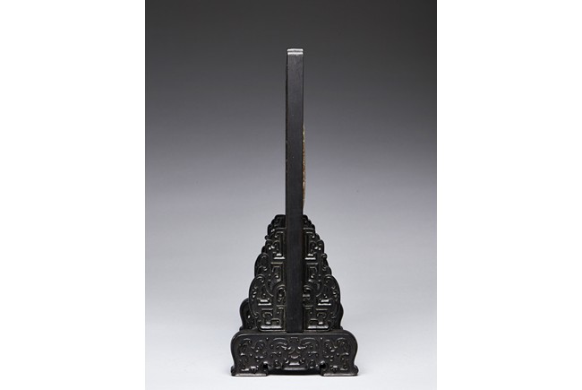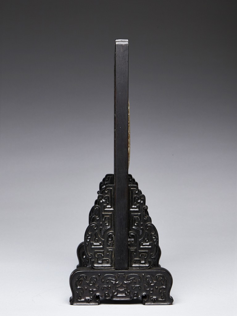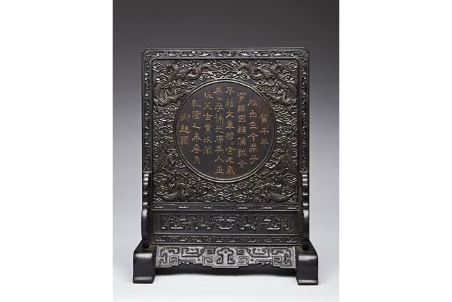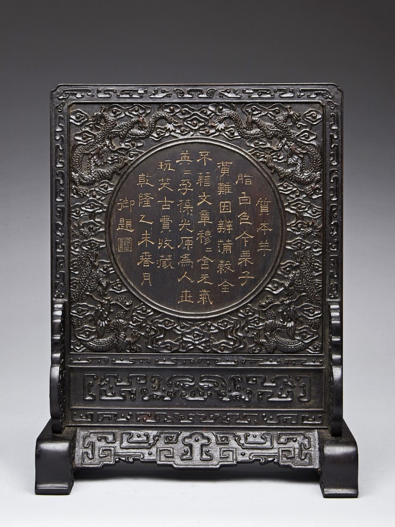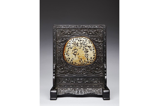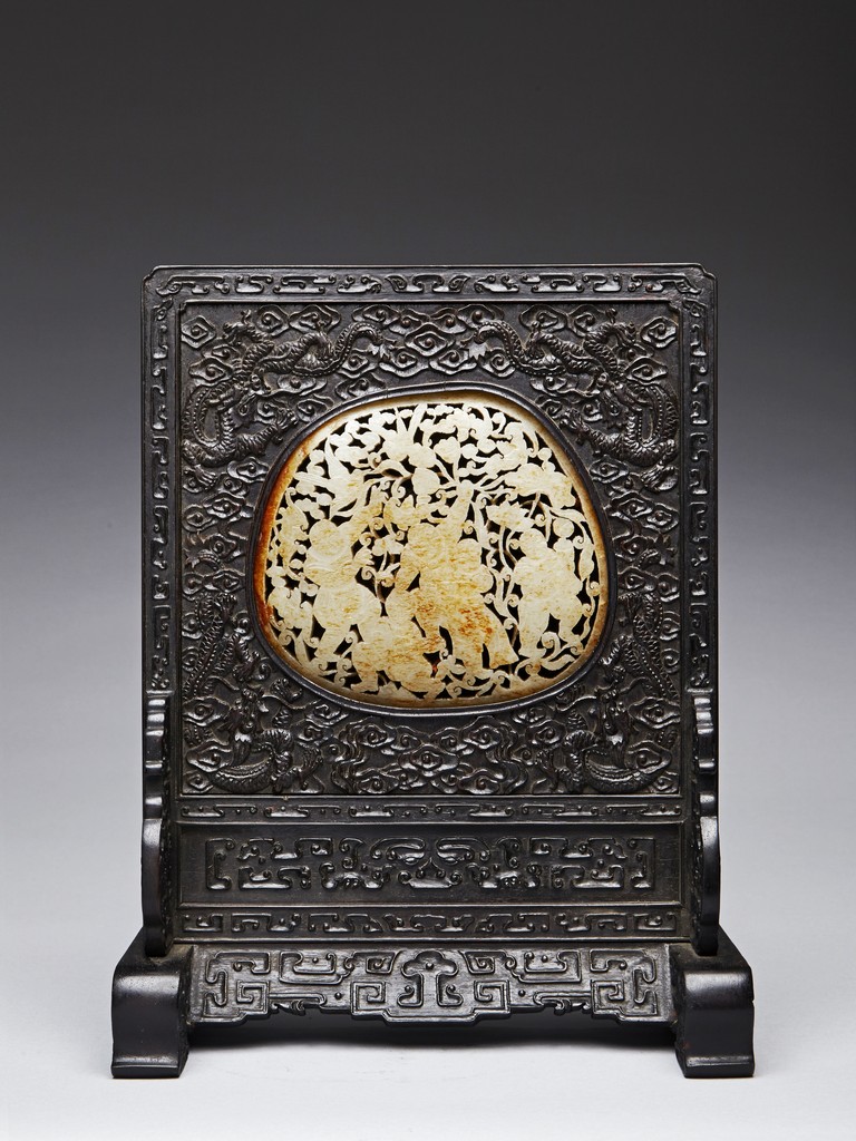 The rounded reticulated white jade plaque finely and deeply carved with children playing together reserved on floral scrolls background, set into a zitan stand finely carved with dragons in flight amongst auspicious cloudsthe apron carved with archaistic scrolls, the back inscribed with imperial poem and seal mark in gilt.