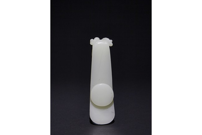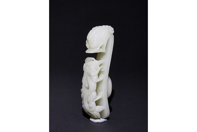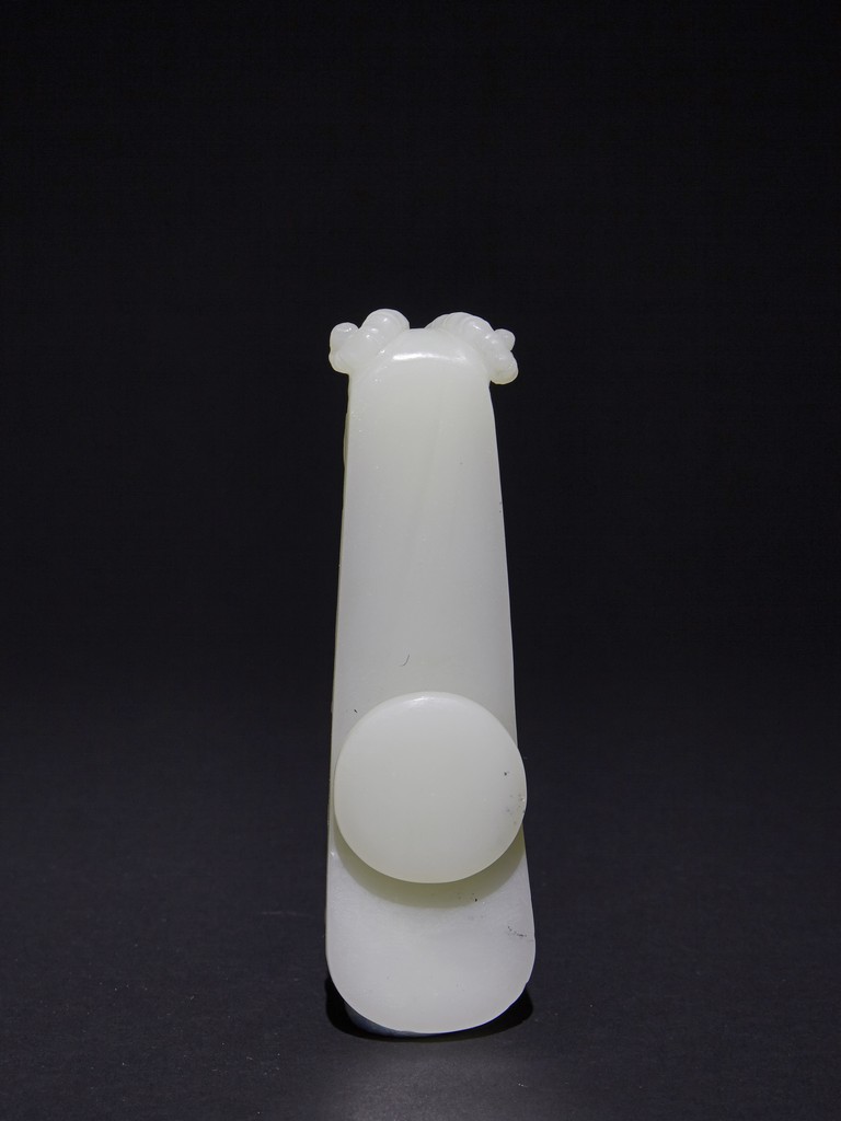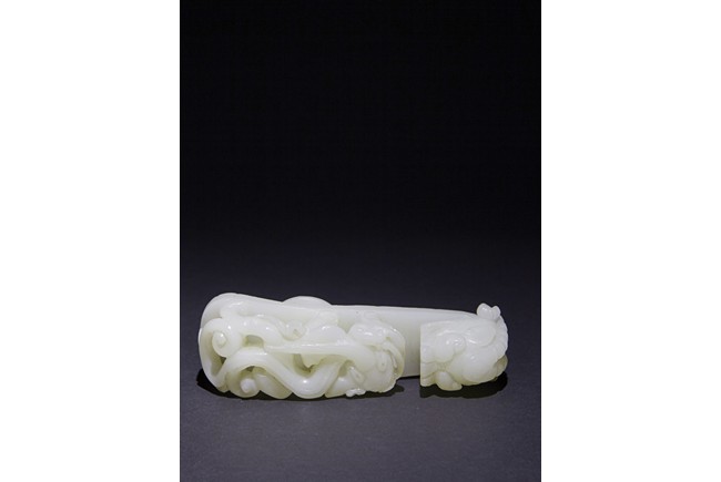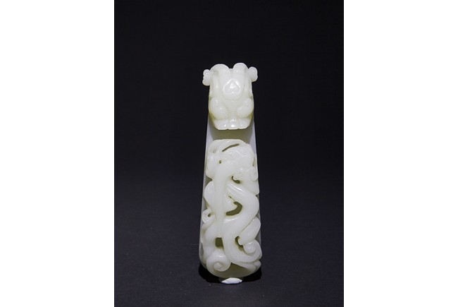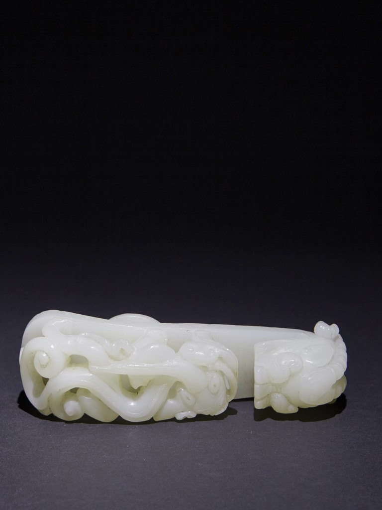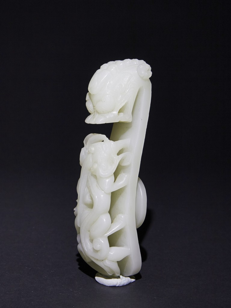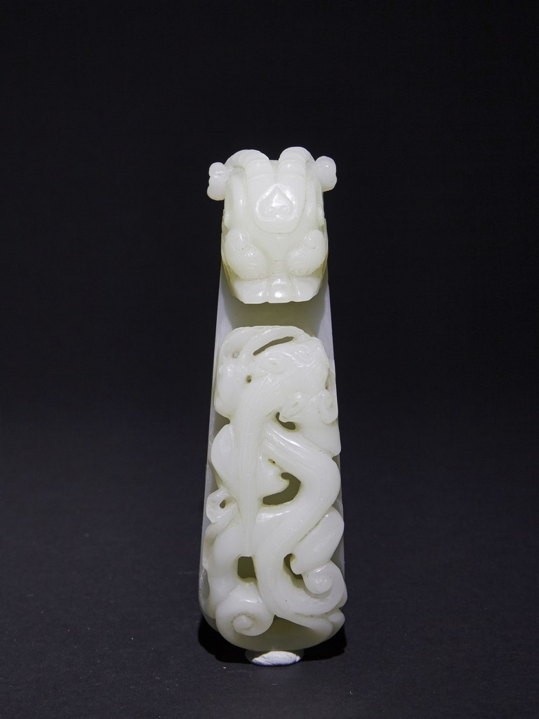 carved with a dragon head terminal facing a chilong on the arched stem with twisted body, a flat circular button on the underside.