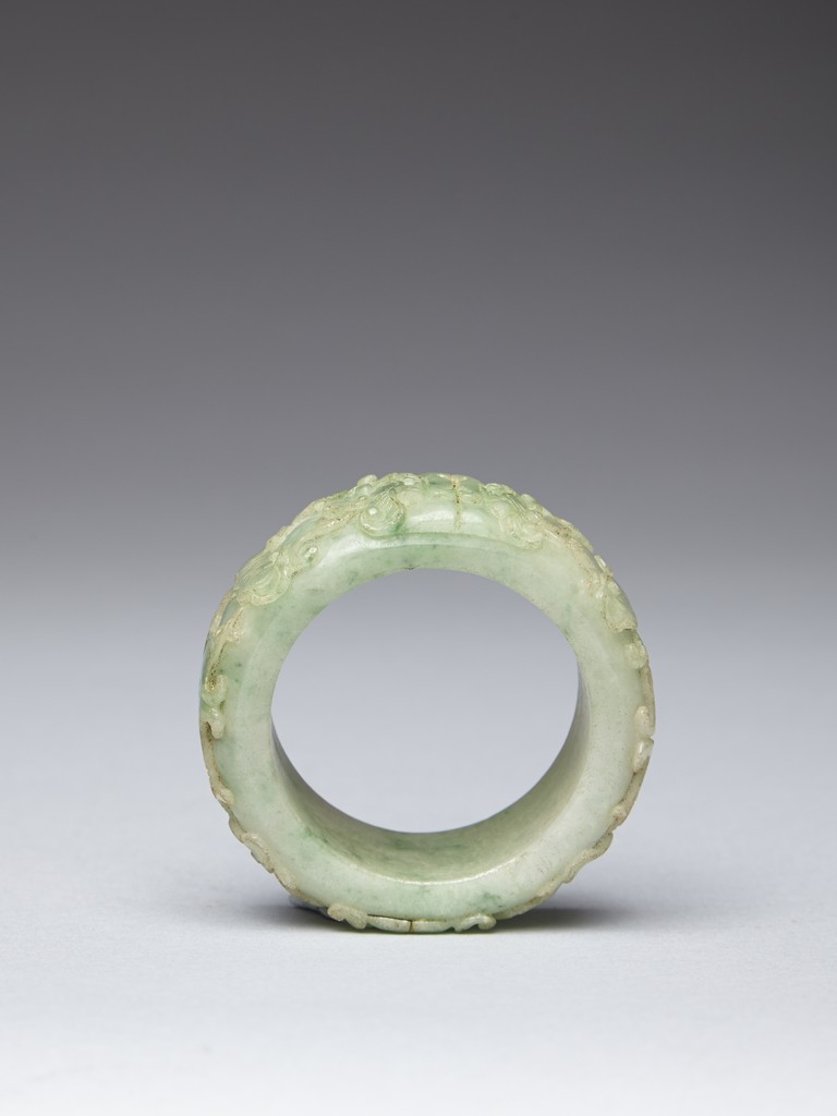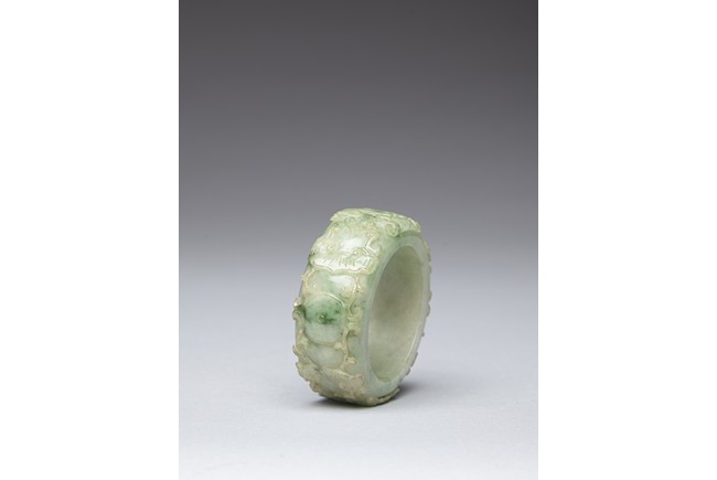 The jadeite bangle is finely carved to the exterior with scrolled floral pattern and ruyi heads. Qing Dynasty period.