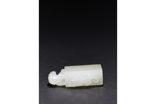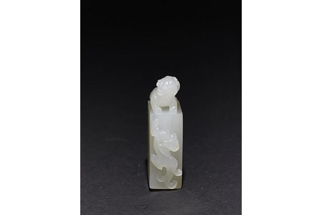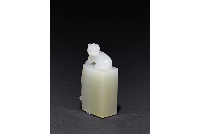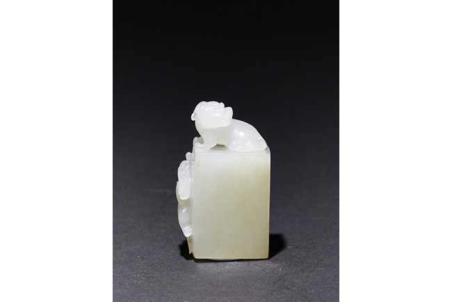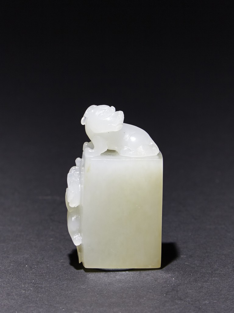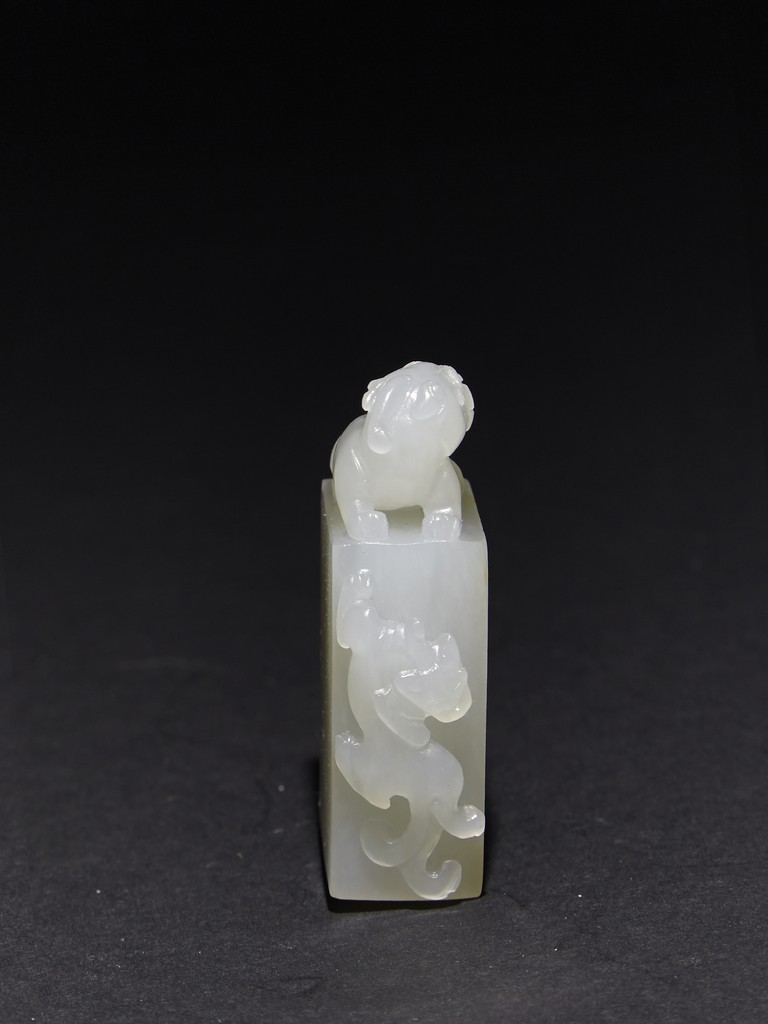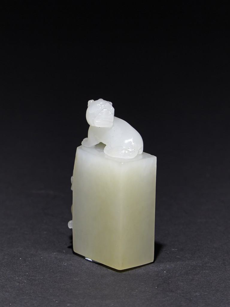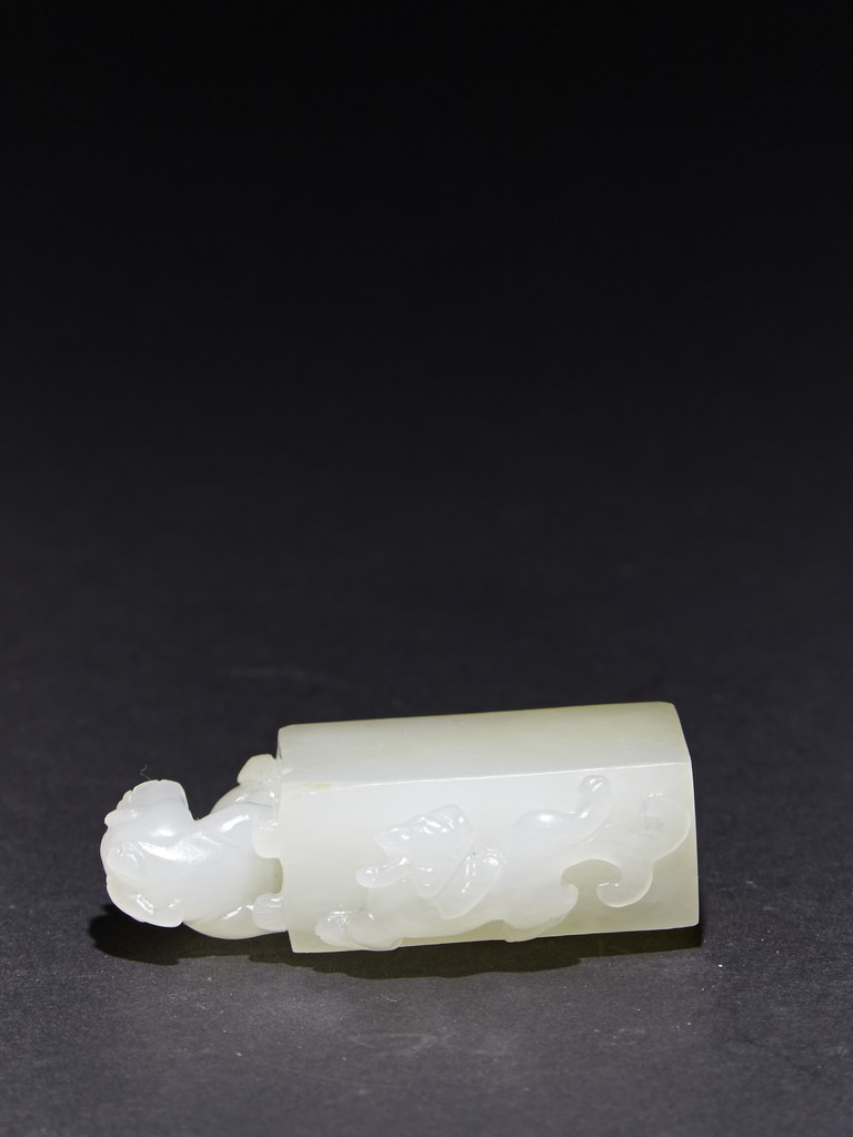 Of rectangular form, the seal is surmounted with a recumbent Buddhist lion with head turned back, the side carve with a twisting chilong, all finely executed in high relief. The stone is of even translucent white tone. Qing Dynasty period.