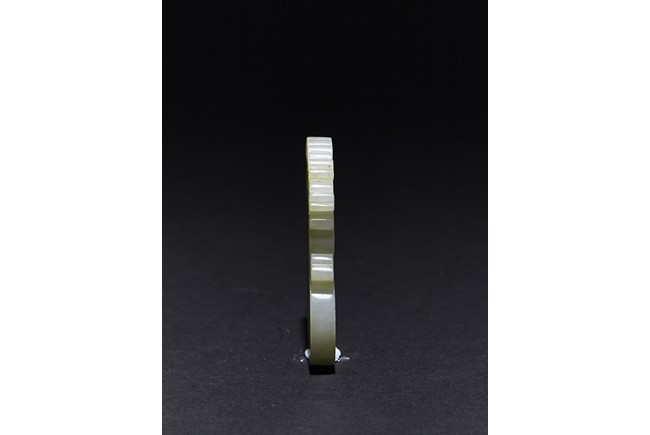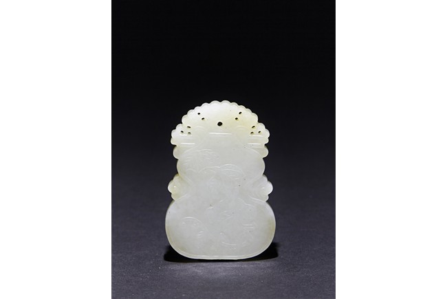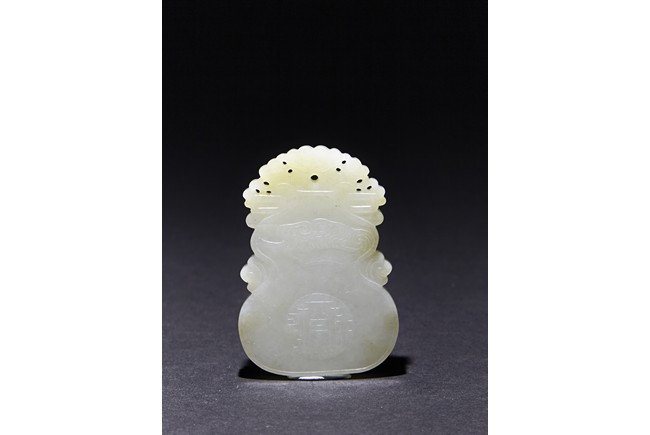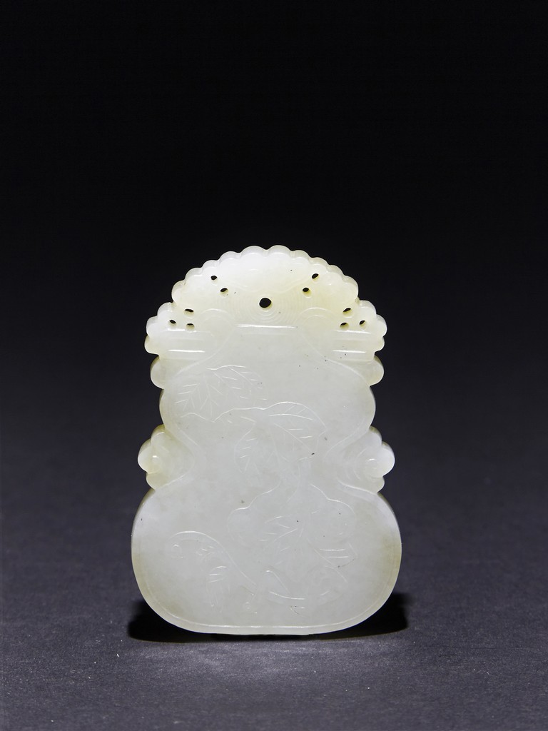 Of double gourd form, the pendant is carved in shallow relief with leafy branch to one side, the other side with lingzhi and auspicious medallion. Qing Dynasty period.