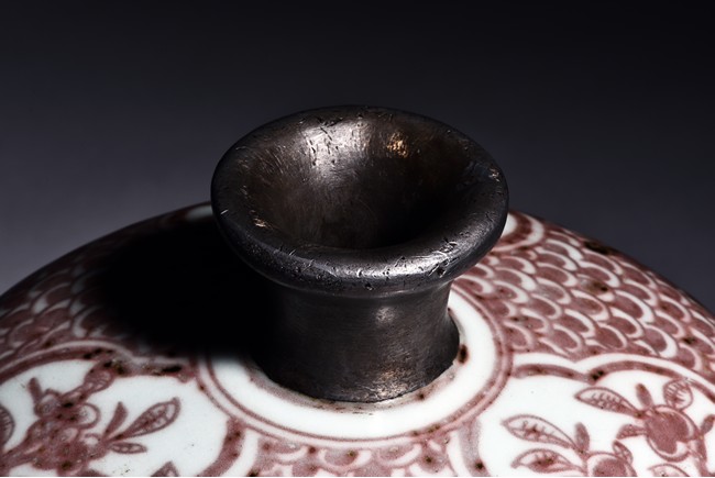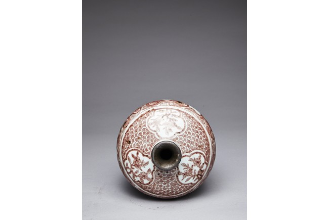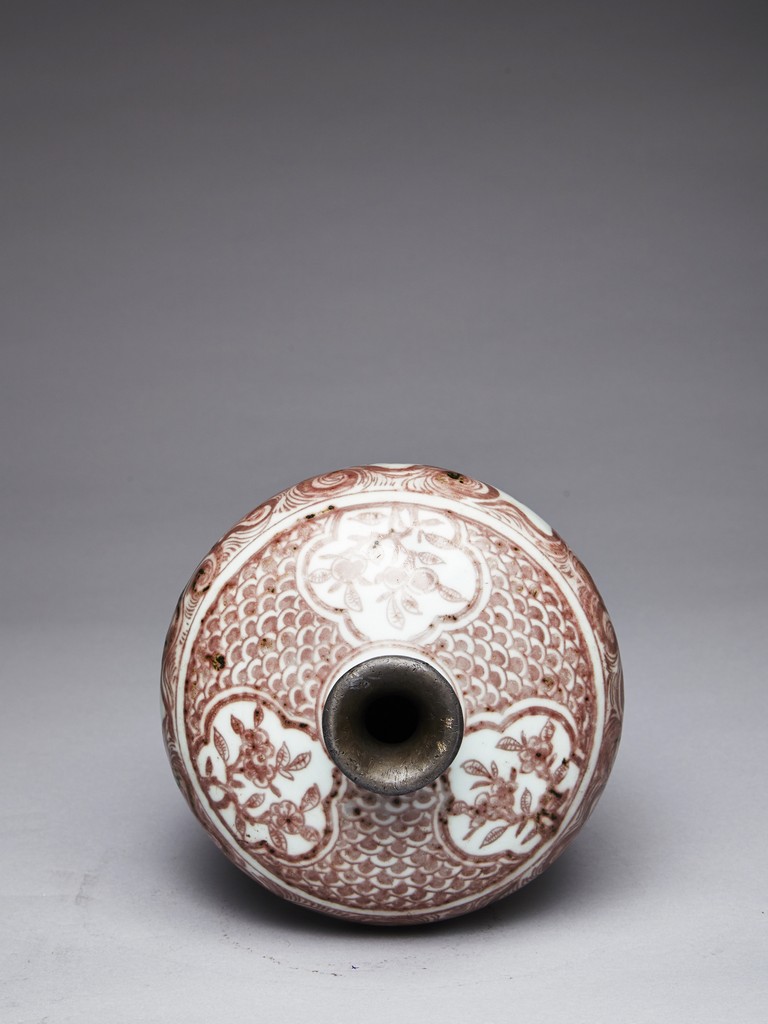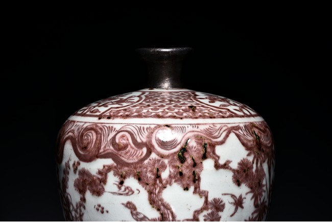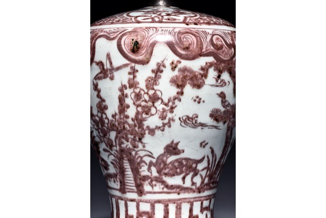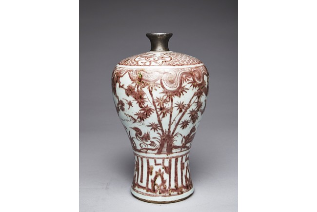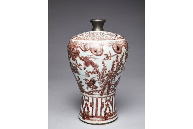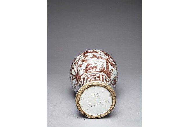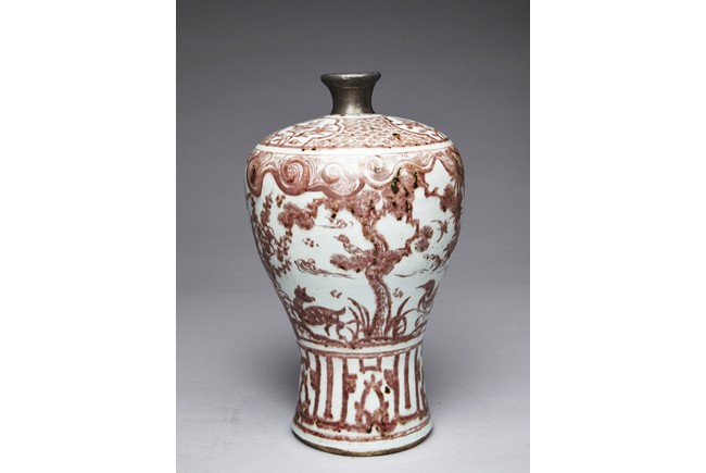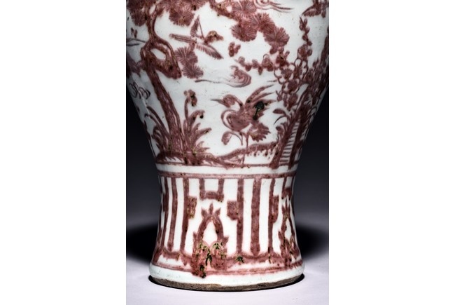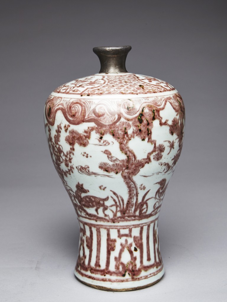 The exterior of vase is painted in copper-red with scene of deer and crane upon the river bank among pines, plums, bamboo, and orchids, above the river with swimming ducks and below birds in flight within auspicious clouds, all flanked by a band of swirling pattern and geometric band, the gently sloping shoulder further decorated with leafy flowering and fruiting branches. Replacement on the waisted neck. Ming Dynasty period.