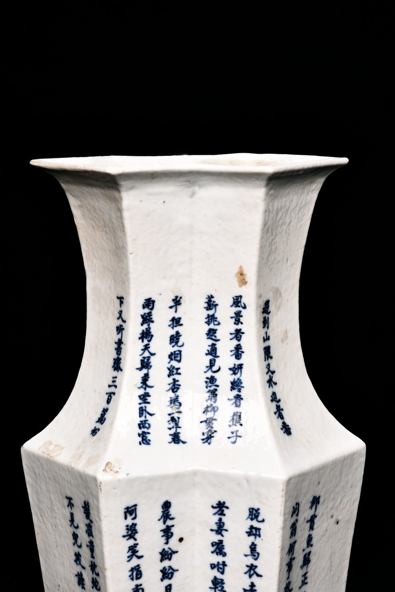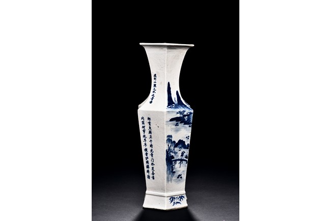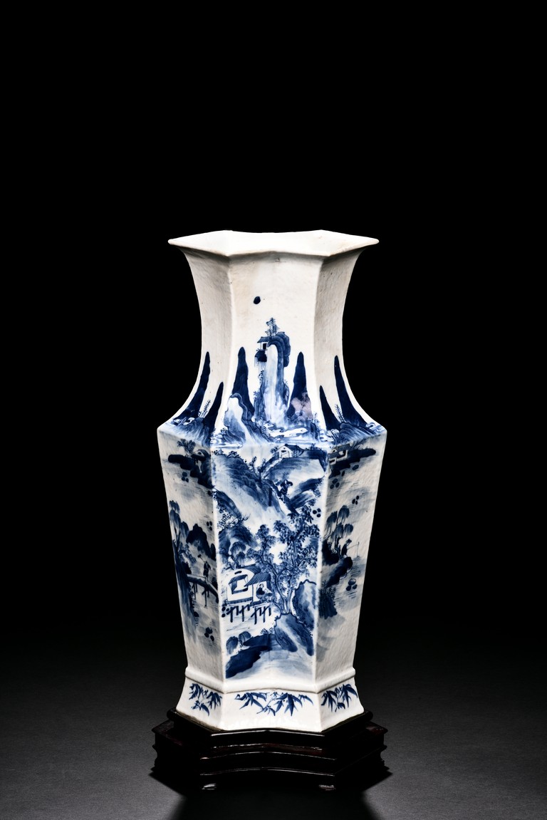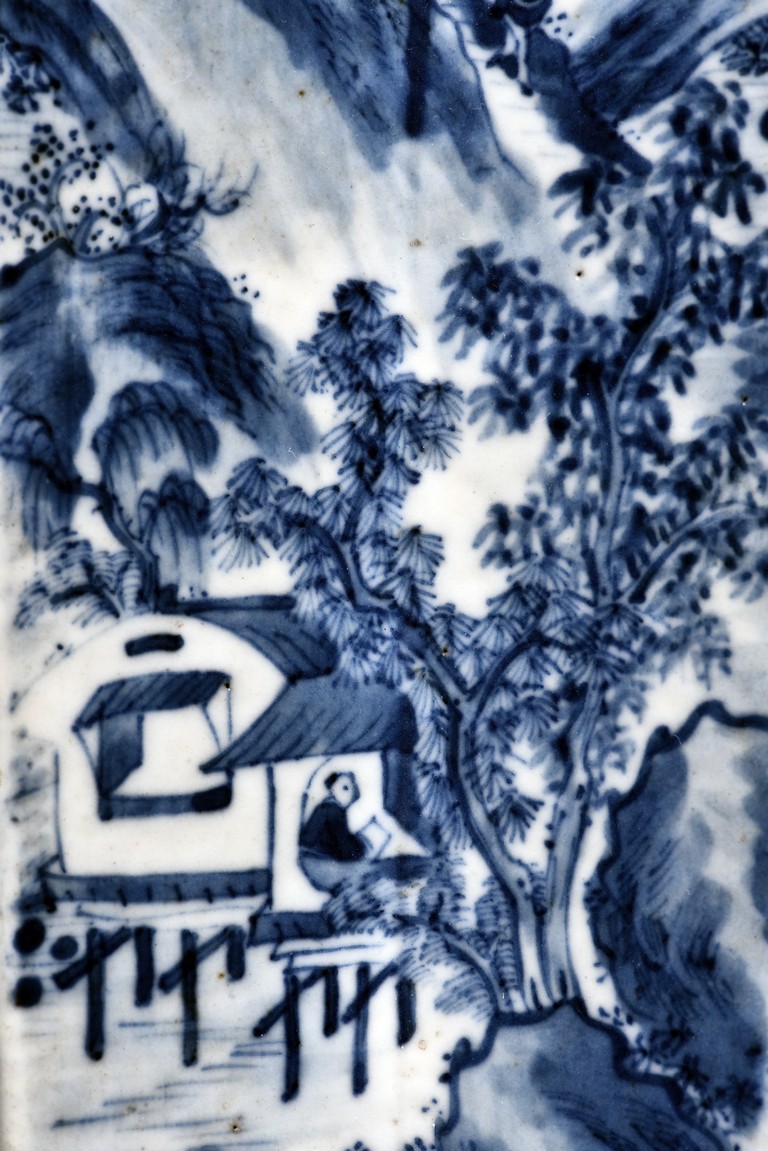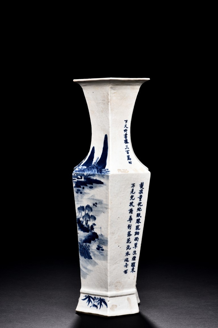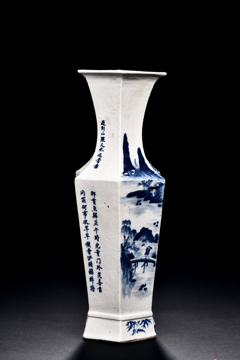 The vase is of unusual form as if two rhombus linked together, the front exterior finely painted in blue and white with landscape scene of residents living in village deep within the mountain. The reverse decorated with poem. Qing Dynasty period.