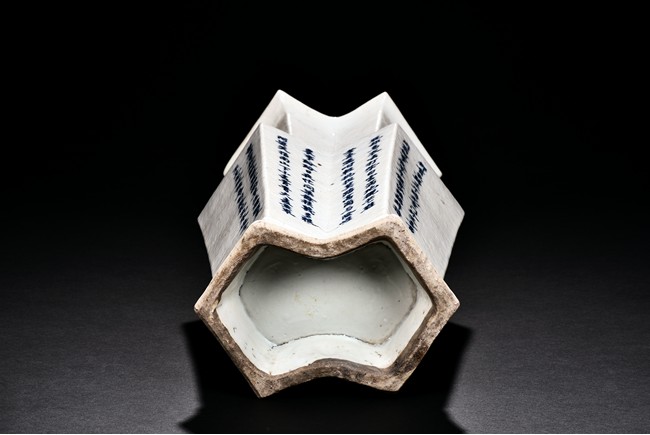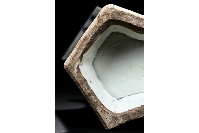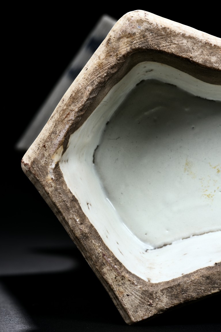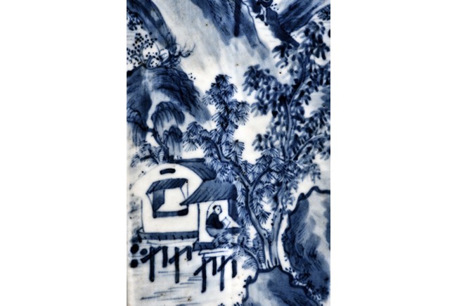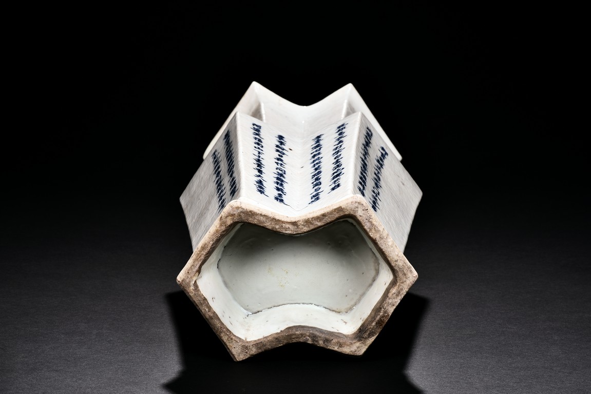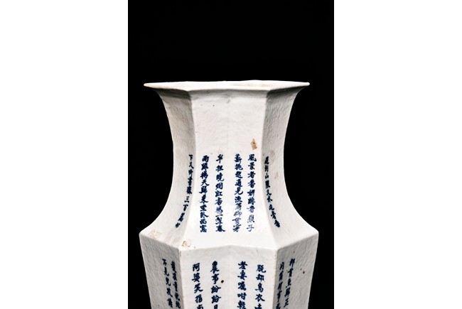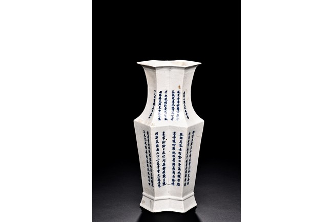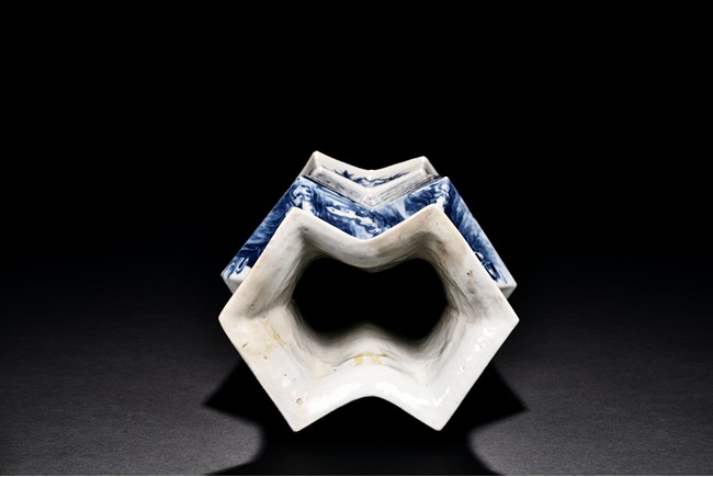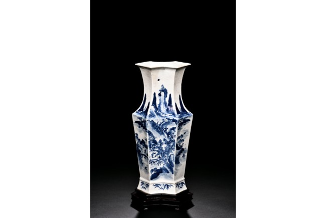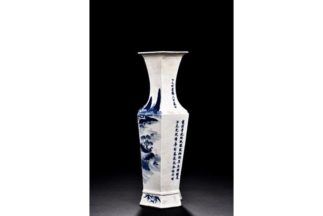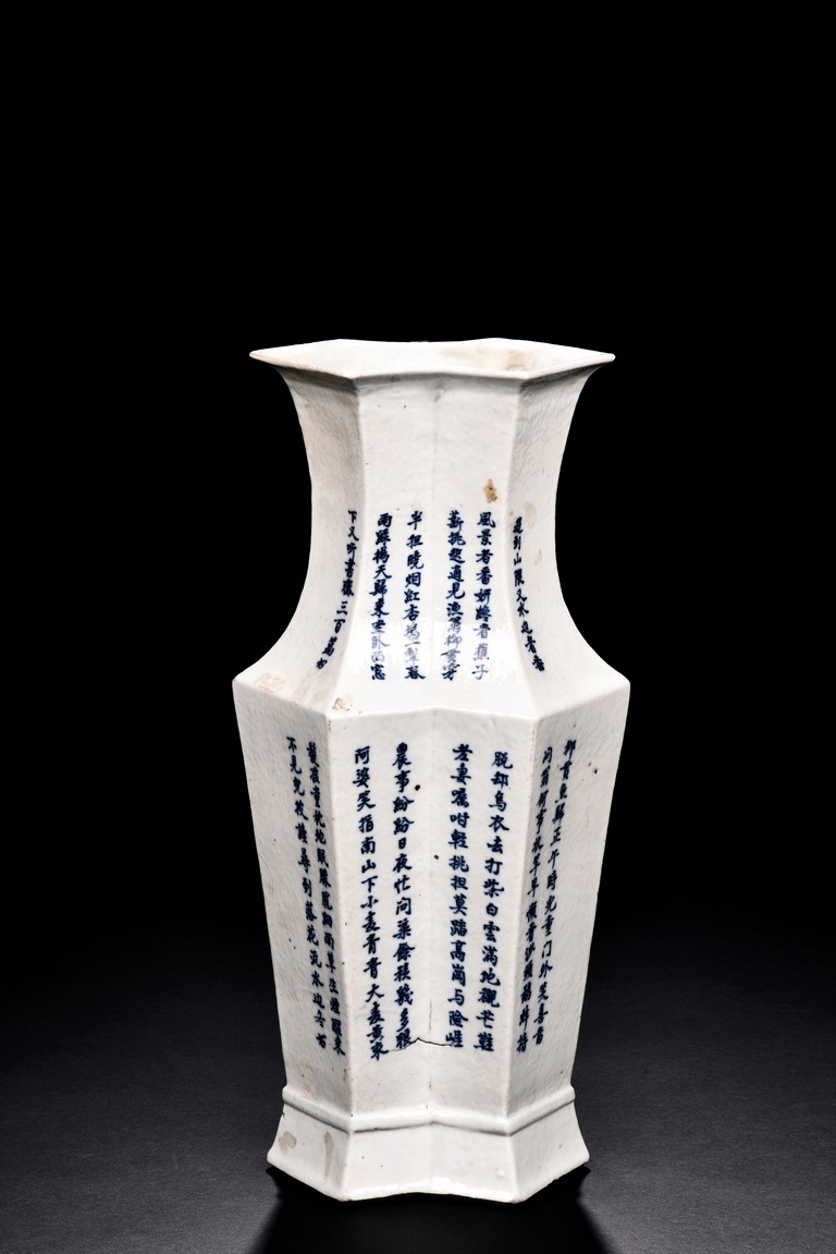 The vase is of unusual form as if two rhombus linked together, the front exterior finely painted in blue and white with landscape scene of residents living in village deep within the mountain. The reverse decorated with poem. Qing Dynasty period.