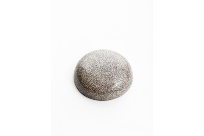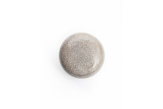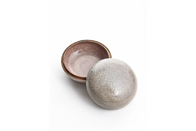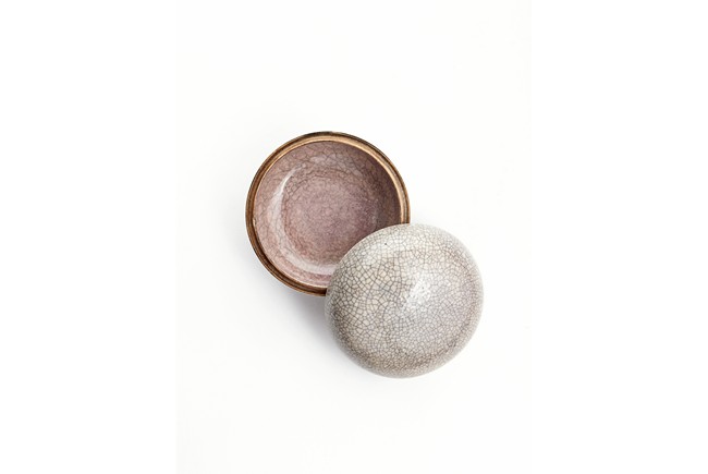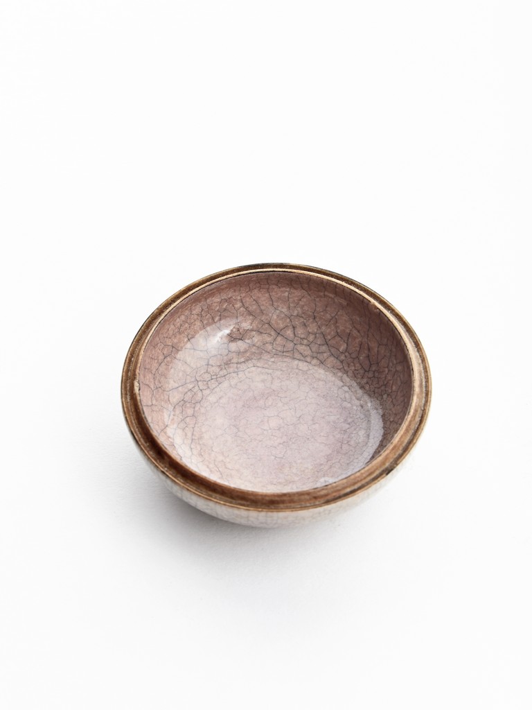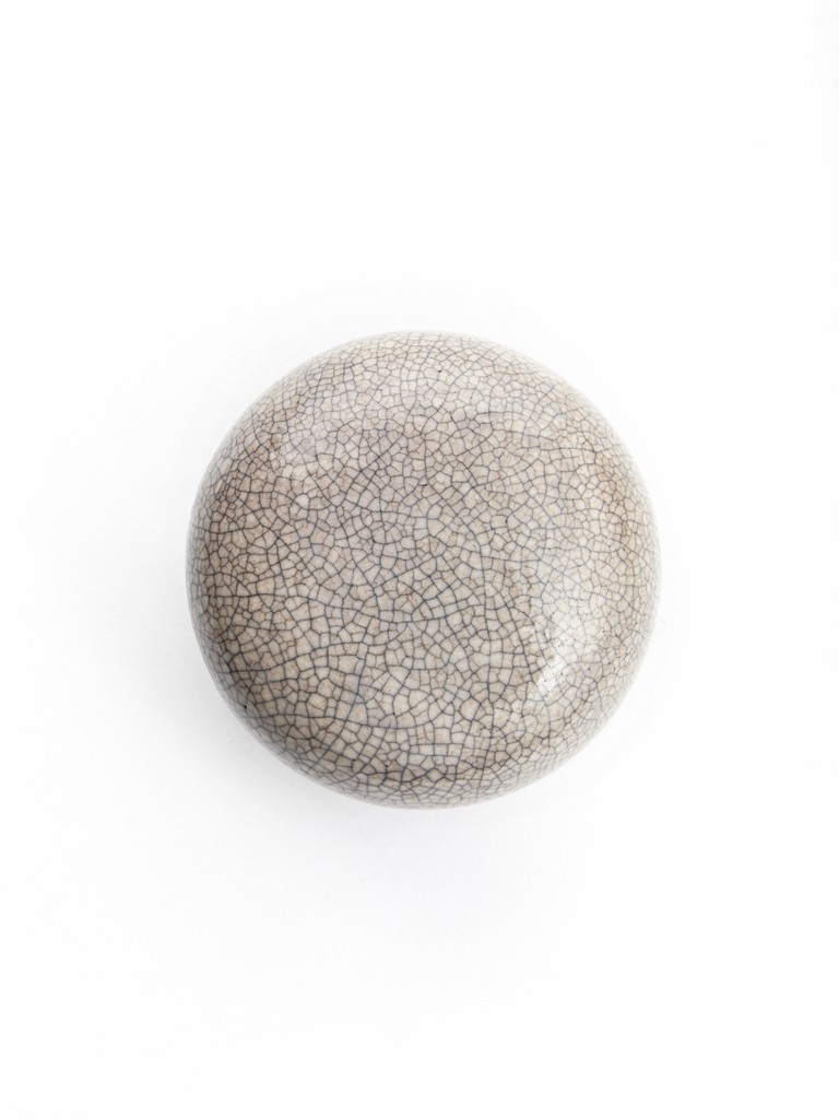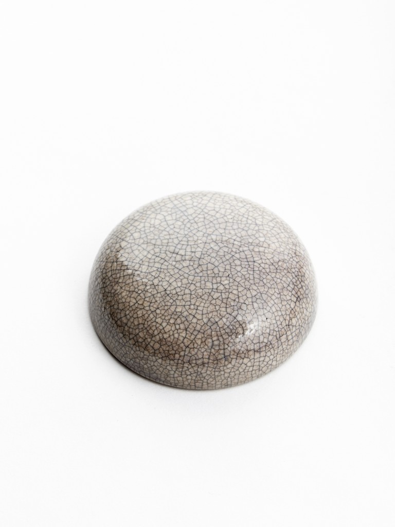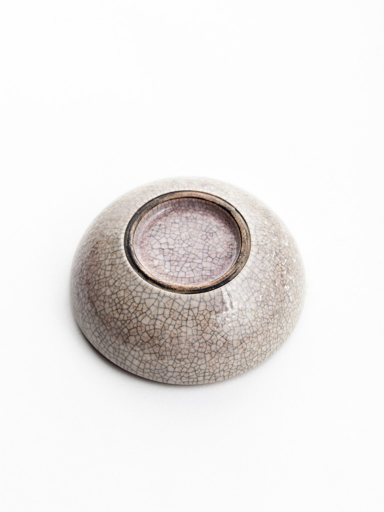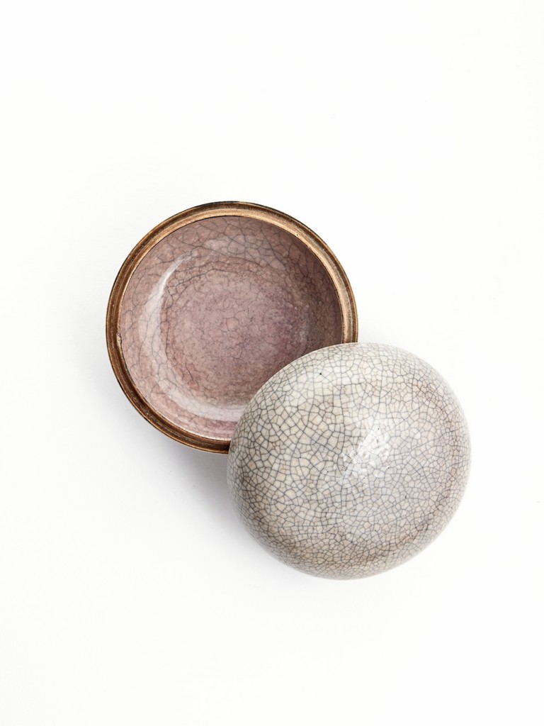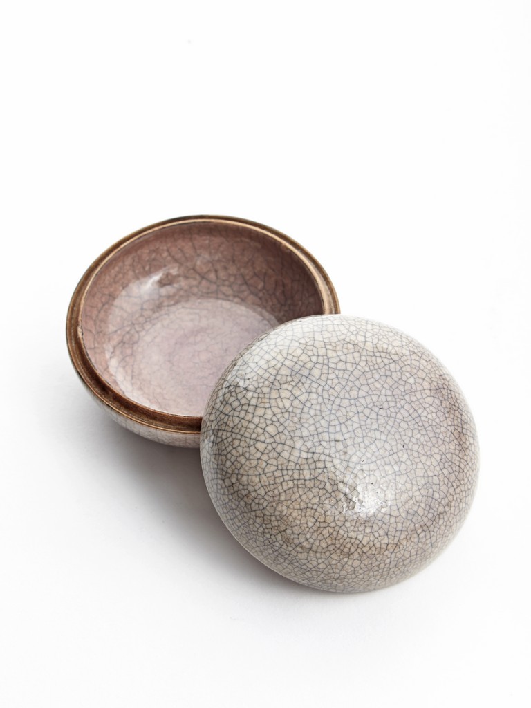Of circular form, the exterior of cover and body is suffused with dense networks of fine black and russet crackles in imitation of Song dynasty Ge ware porcelain. Qing Dynasty period.