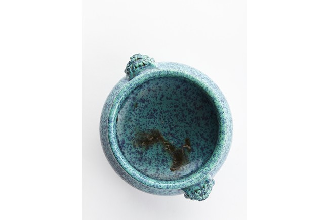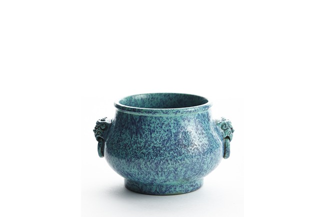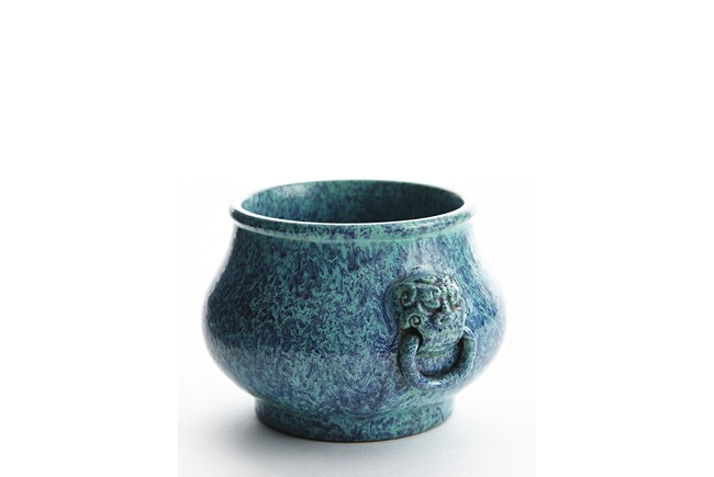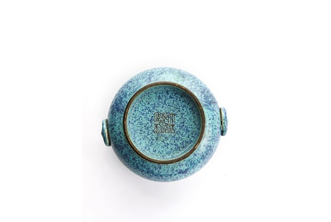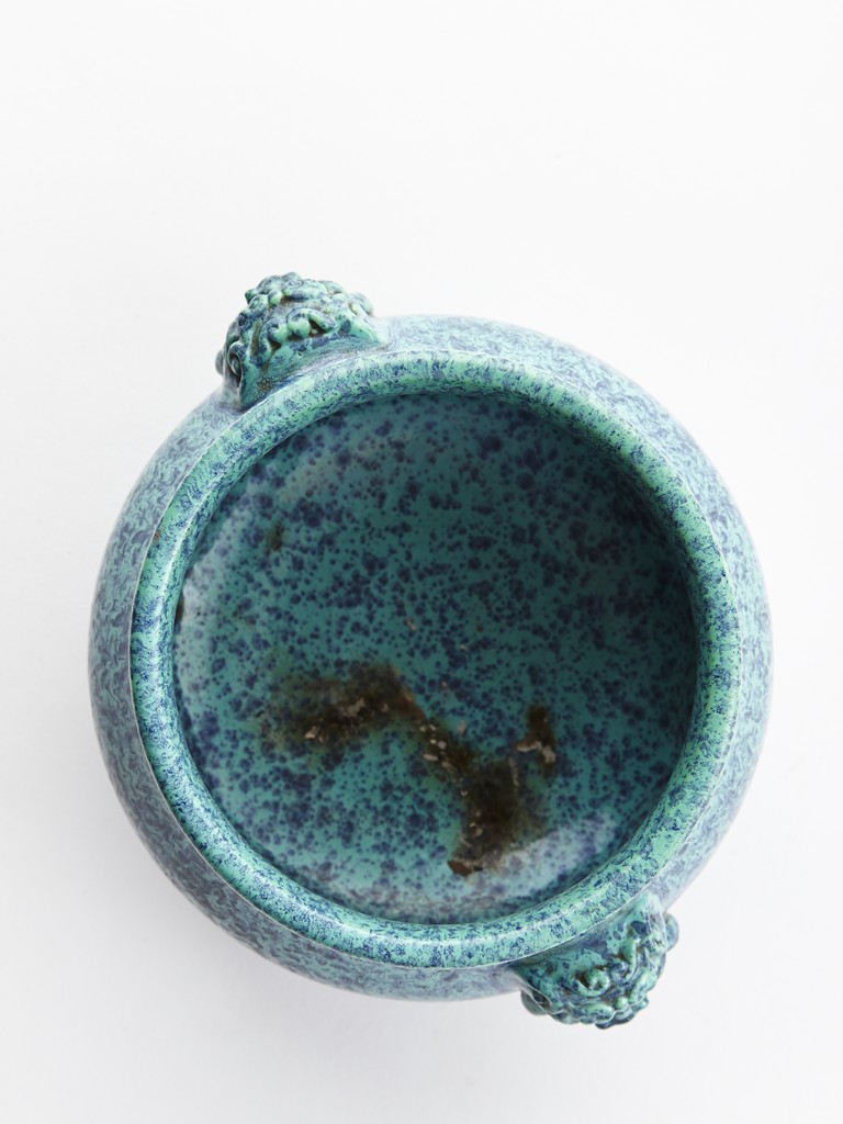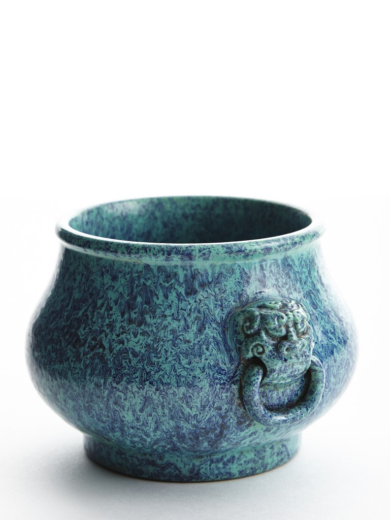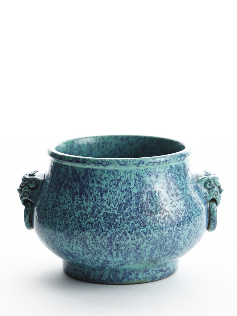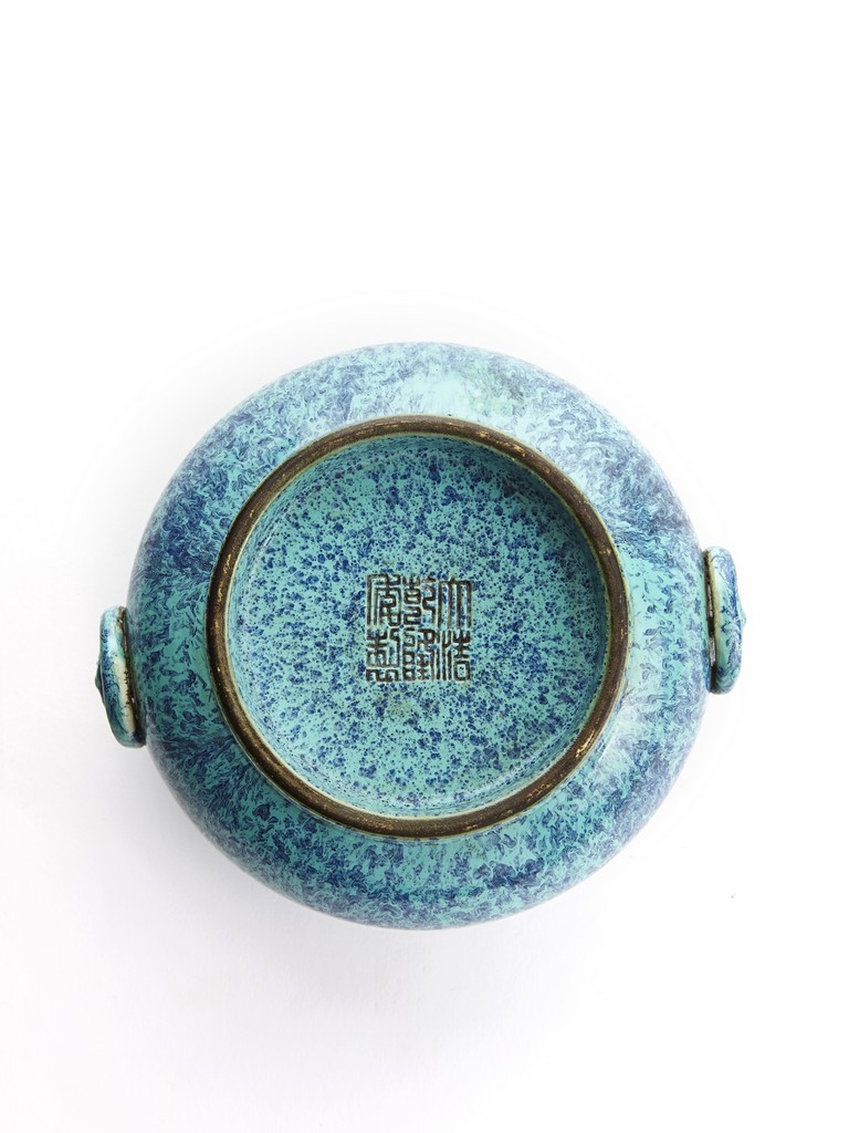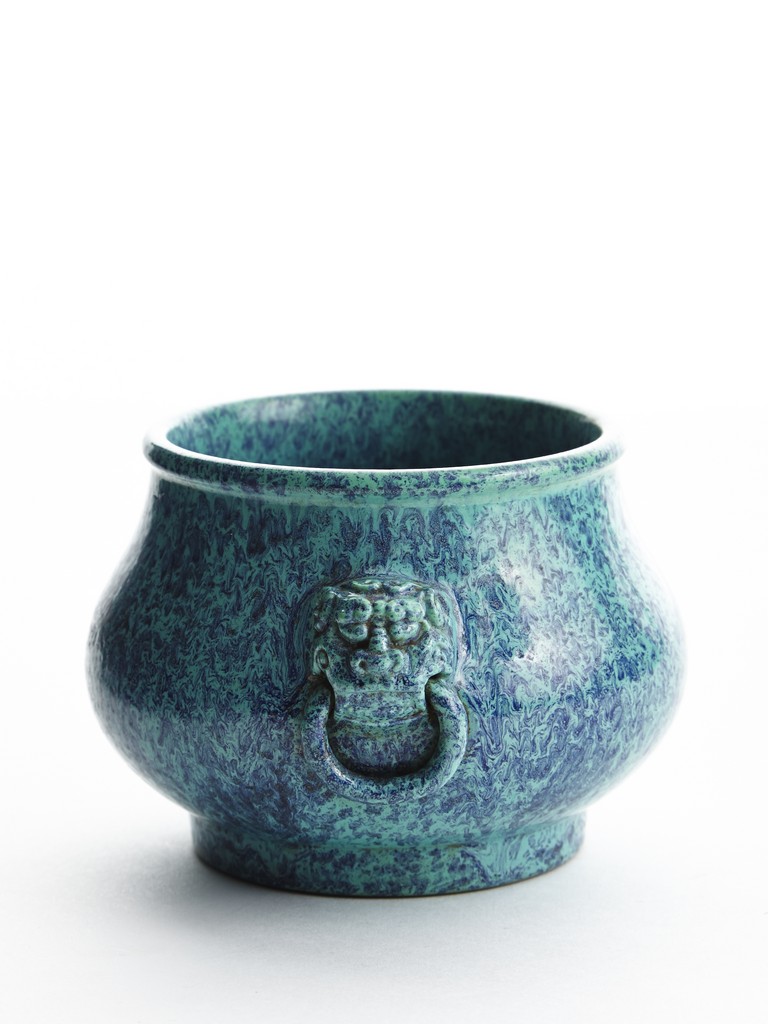 Of compressed globular form, the censer rises from circular foot ring, the body flanked by two lion head handles suspended with loose ring, overall evenly covered with a thick bright turquoise glaze suffused with marbled mottling of deep red and violet. The base bears six character 'QIANLONG' mark. Qing Dynasty period.