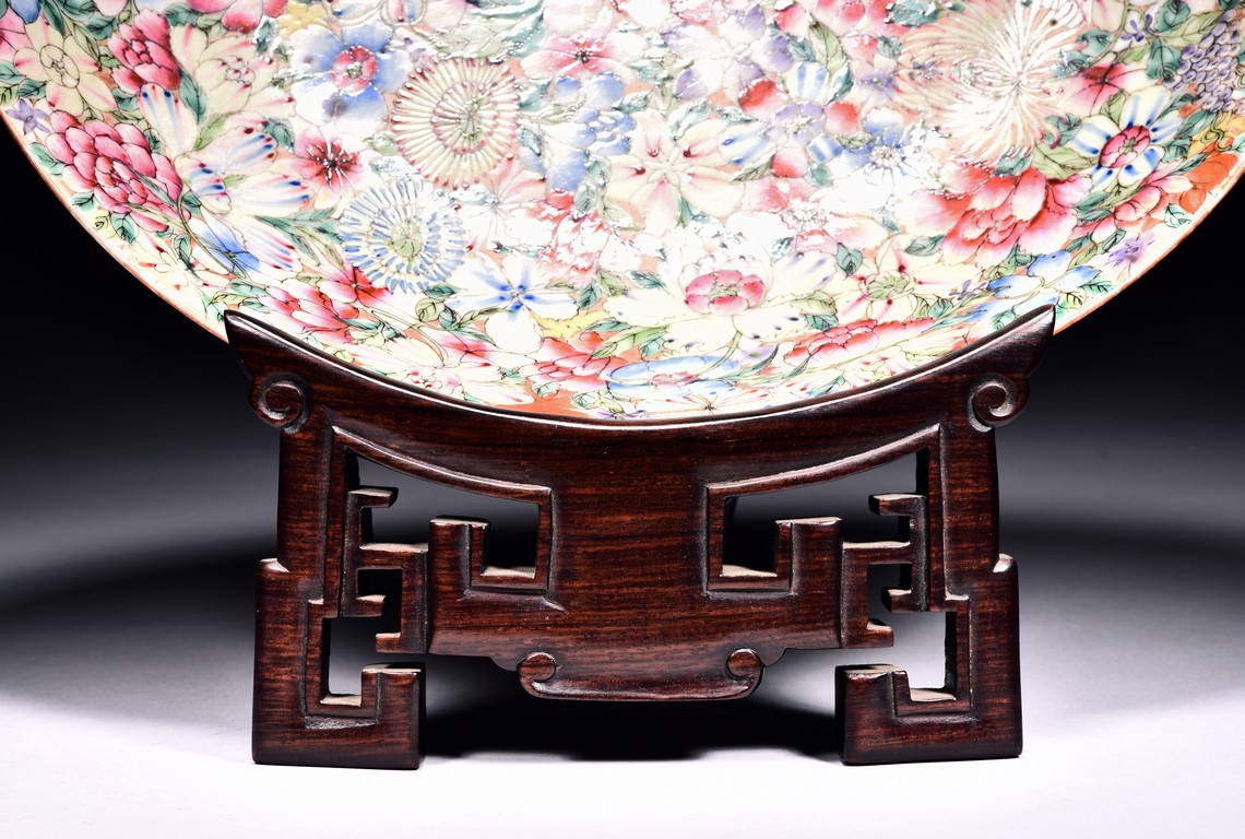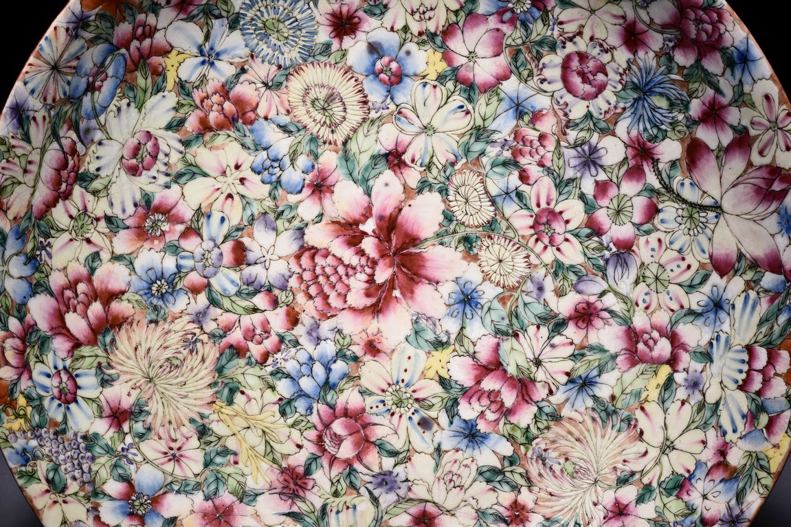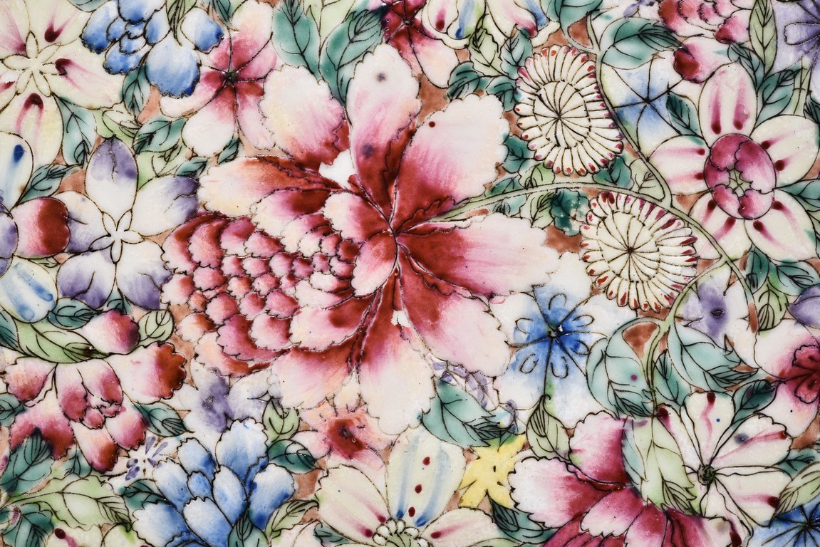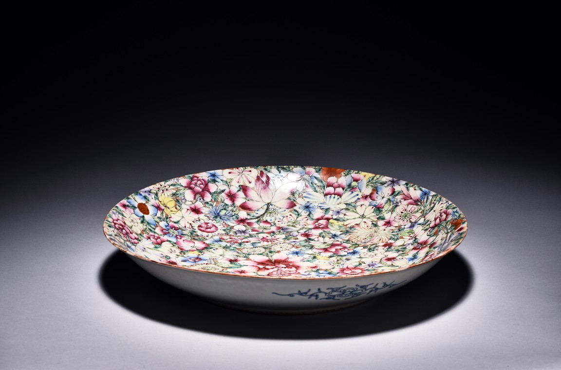 The gently rounded sides rising to a slightly everted rim, the interior finely enameled with 'hundred flower' of various types and sizes, the exterior decorated in blue enamel with styliezed floral motif, the bottom bears a six character 'QIANLONG' mark. Qing Dynasty period.
