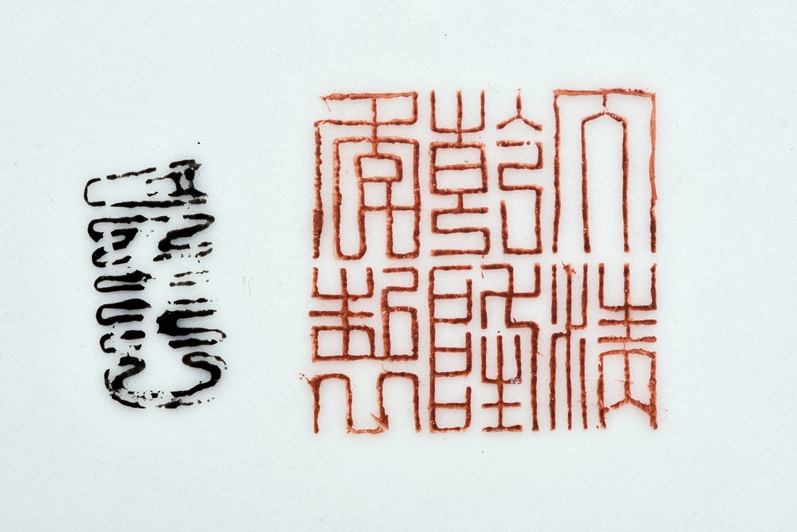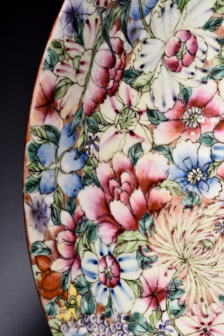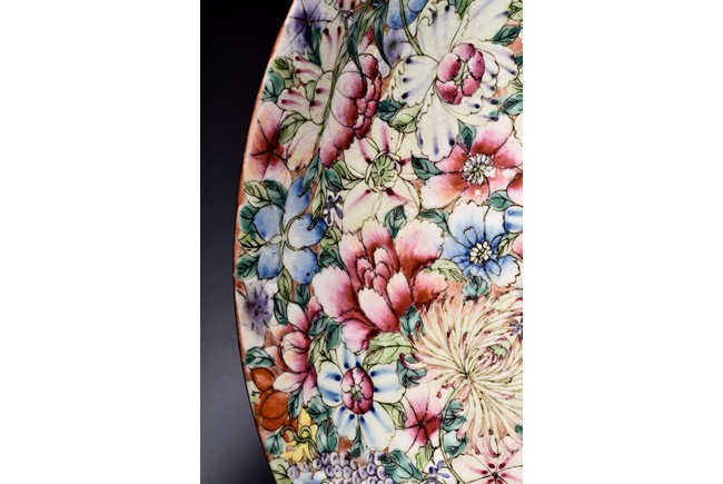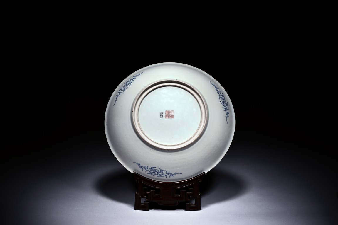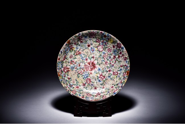 The gently rounded sides rising to a slightly everted rim, the interior finely enameled with 'hundred flower' of various types and sizes, the exterior decorated in blue enamel with styliezed floral motif, the bottom bears a six character 'QIANLONG' mark. Qing Dynasty period.