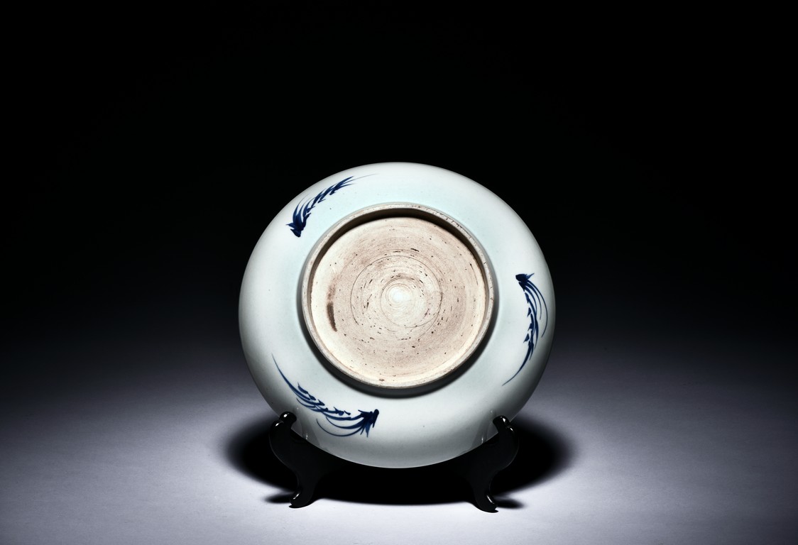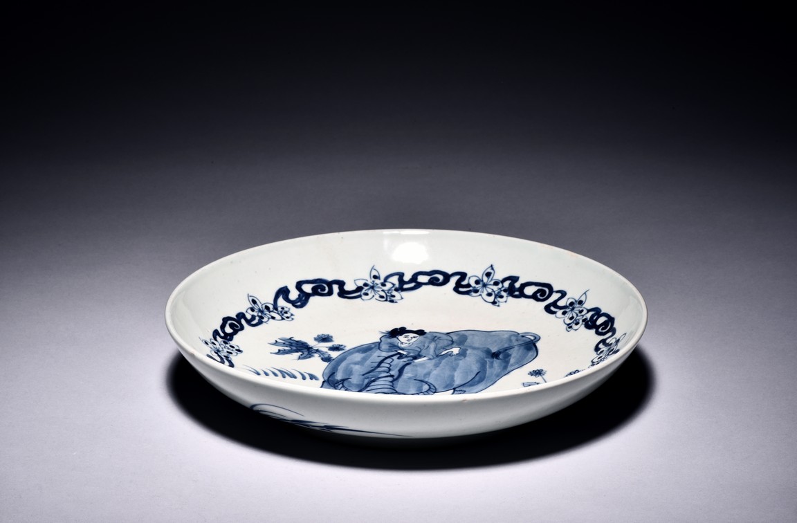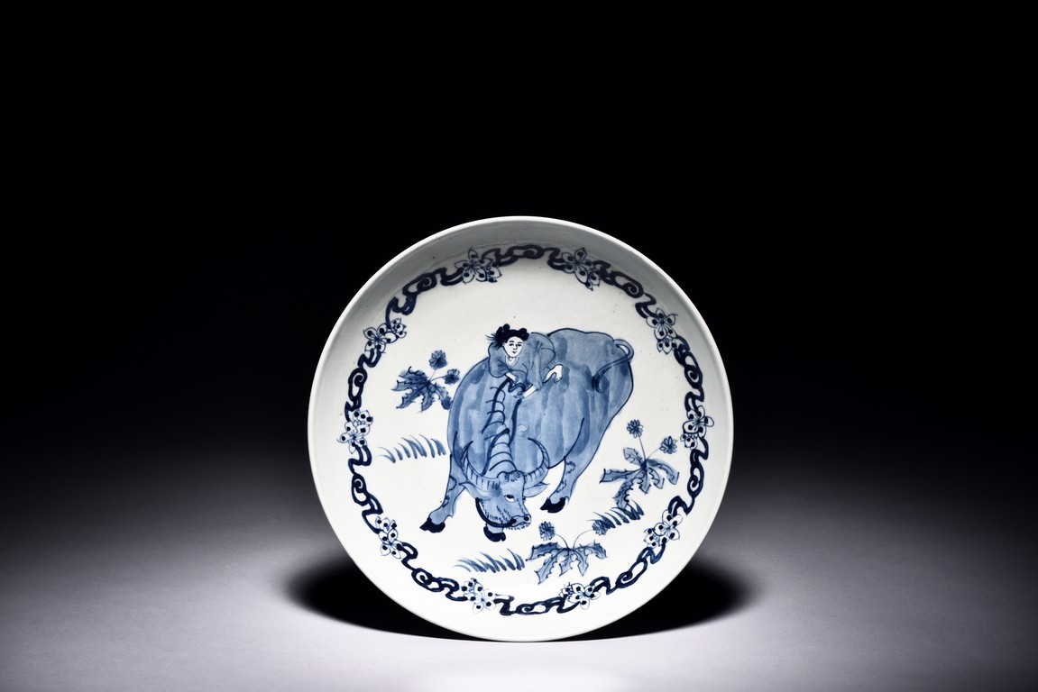 The interior decorated with a boy upon a buffalo in an outdoor setting, with both hands holding a robe tied through buffalo's nose, the exterior decorated with stylized orchid motif. Qing Dynasty period.