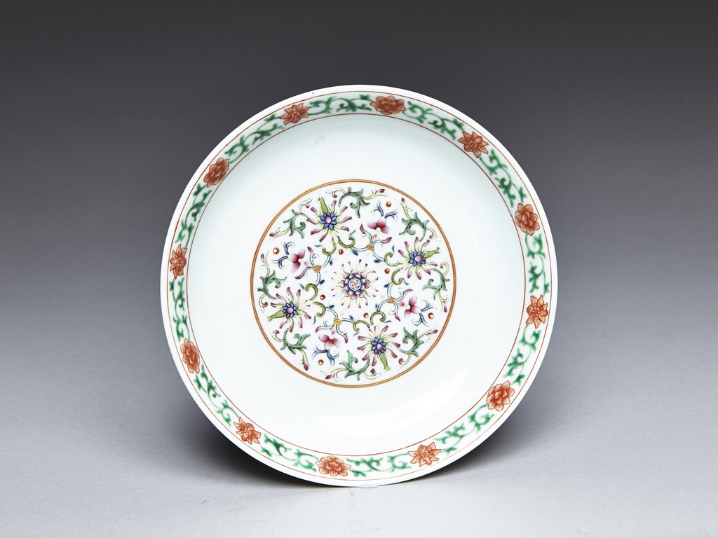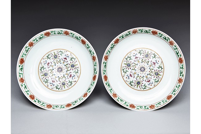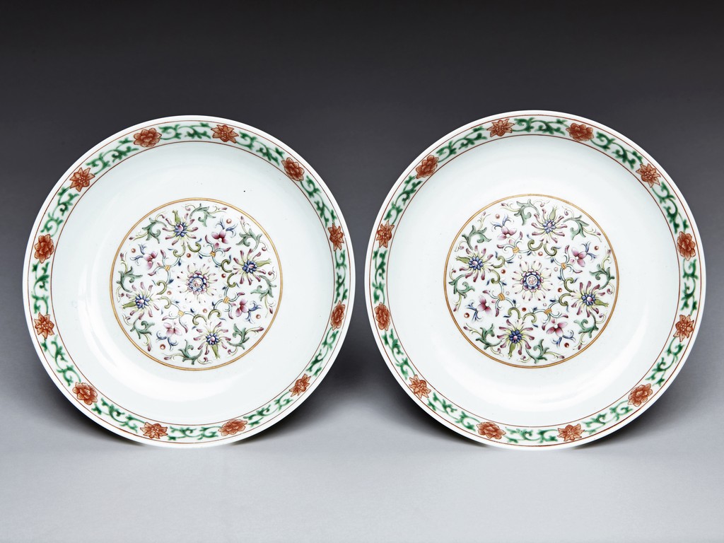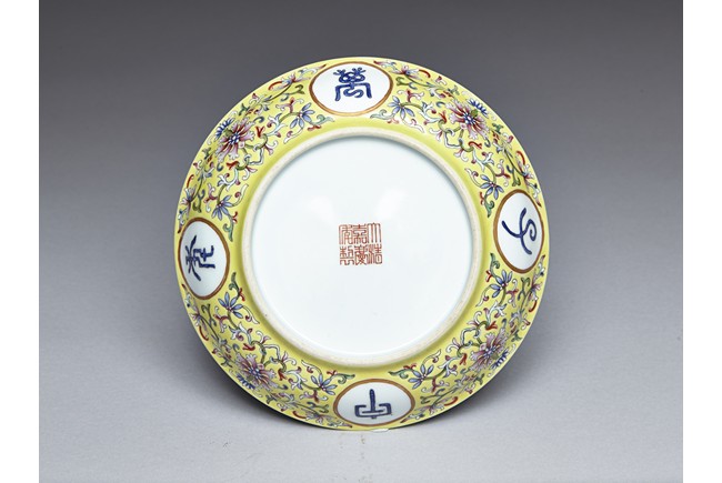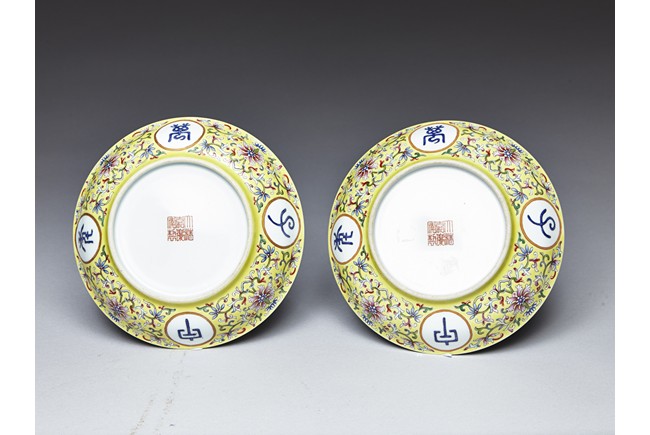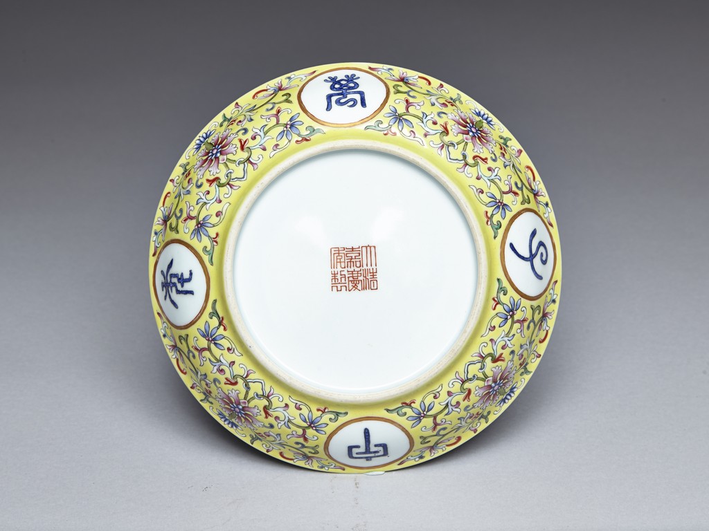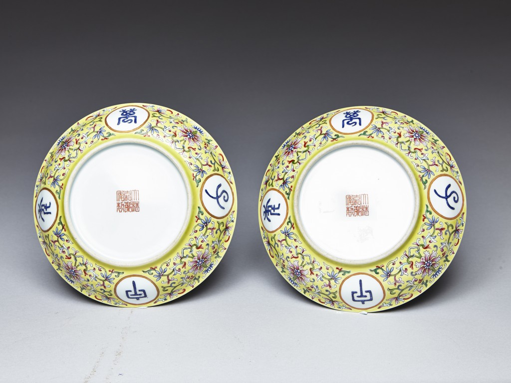 Each dish is finely enamalled with a central roundel enclosing scrolling lotus flowers, the rim further decorated with a band of floral scrolls. The exterior is delicately decorated with four roundels enclosing character 'Jia Zi Wan Nian', separated by finely enamelled lots scrolls reserved on yellow ground. The base bears six character 'Jia Qing' mark. Qing Dynasty period.