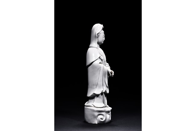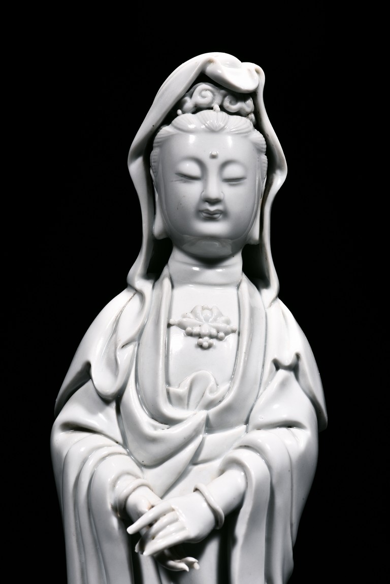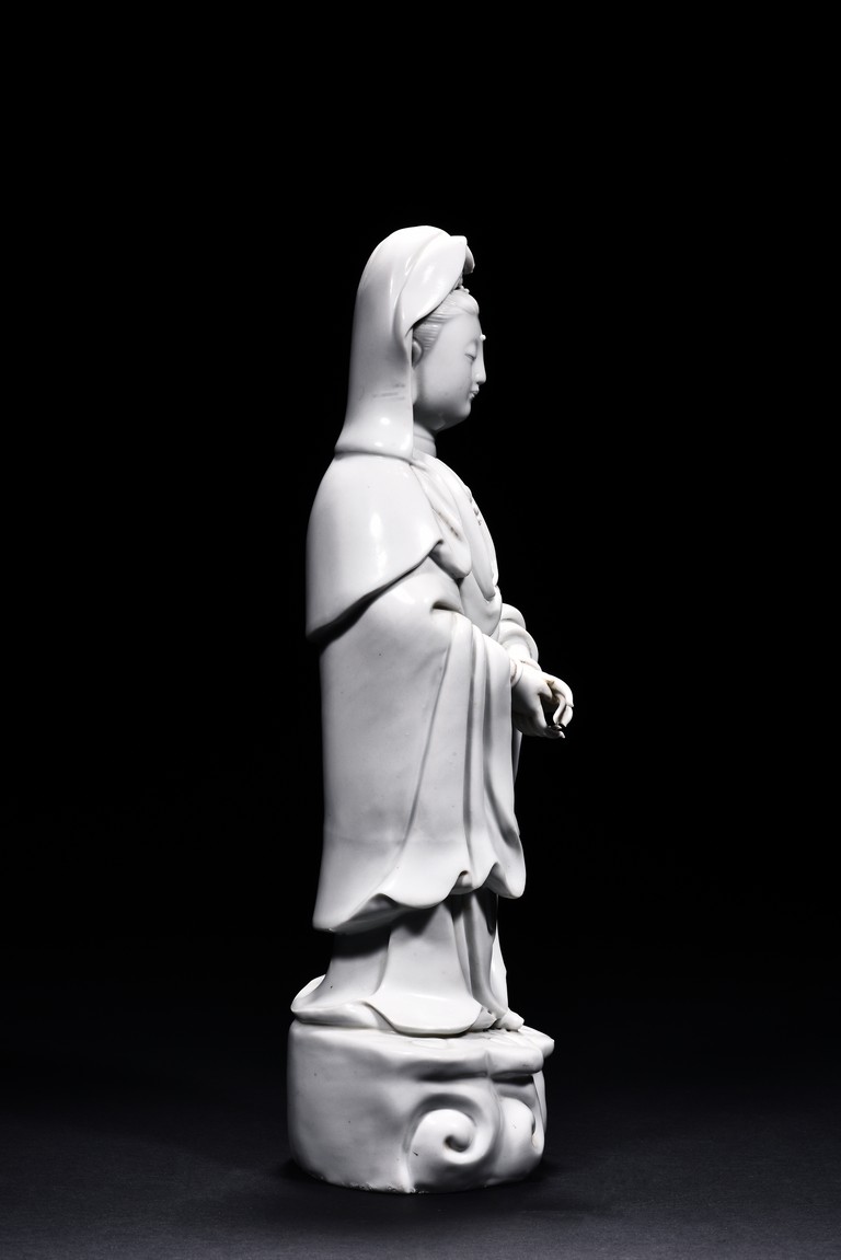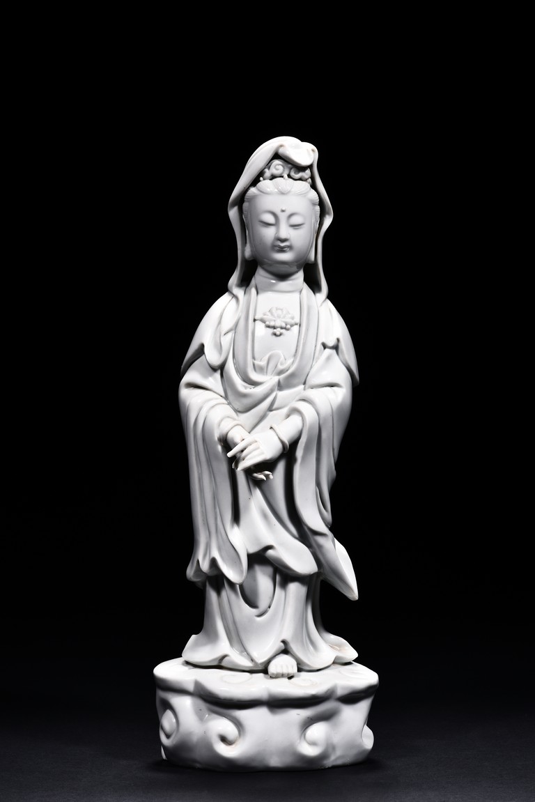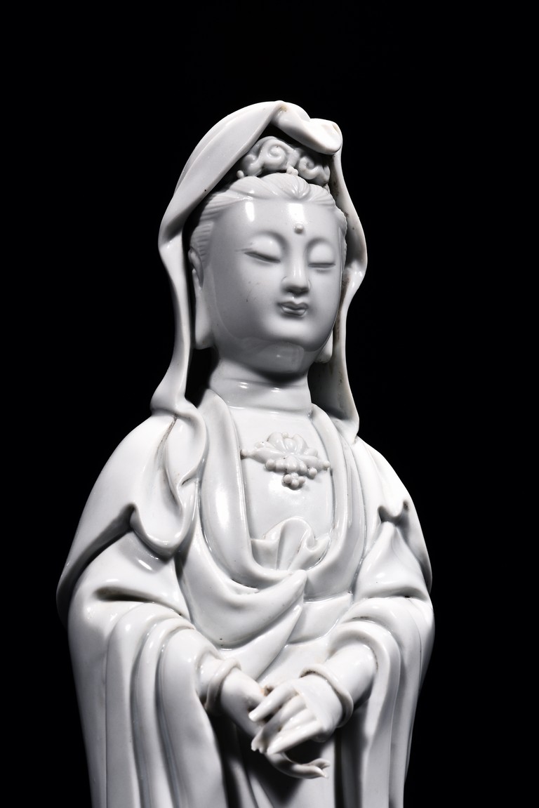 With downcast eyes and benevolent expression, her hair under veil, wearing flowing robe revealing adorned chest, both hands rested together and standing upon a stand resembling waves. Late Qing Dynasty period.