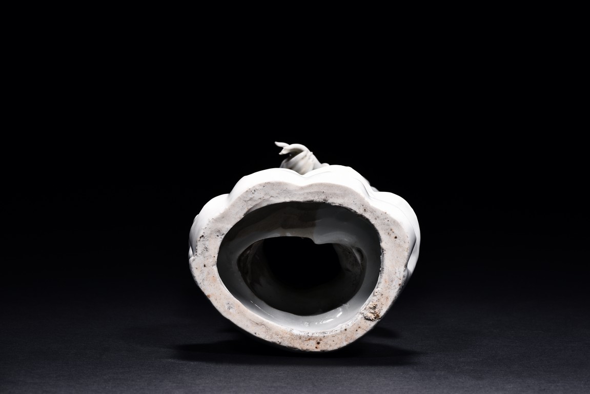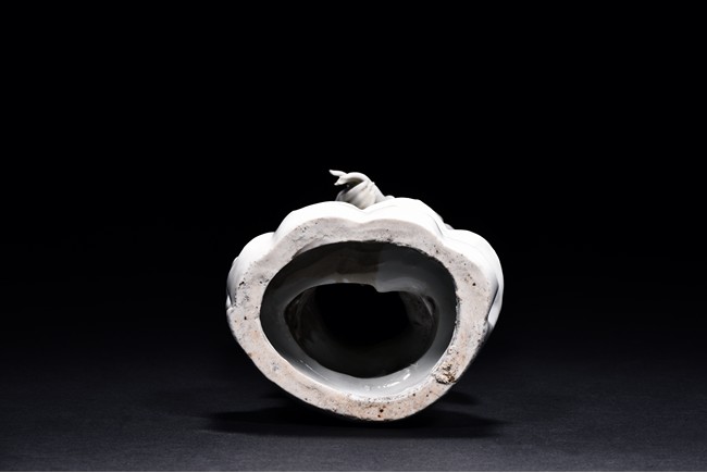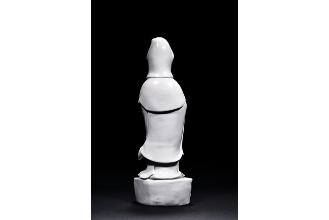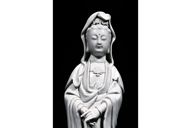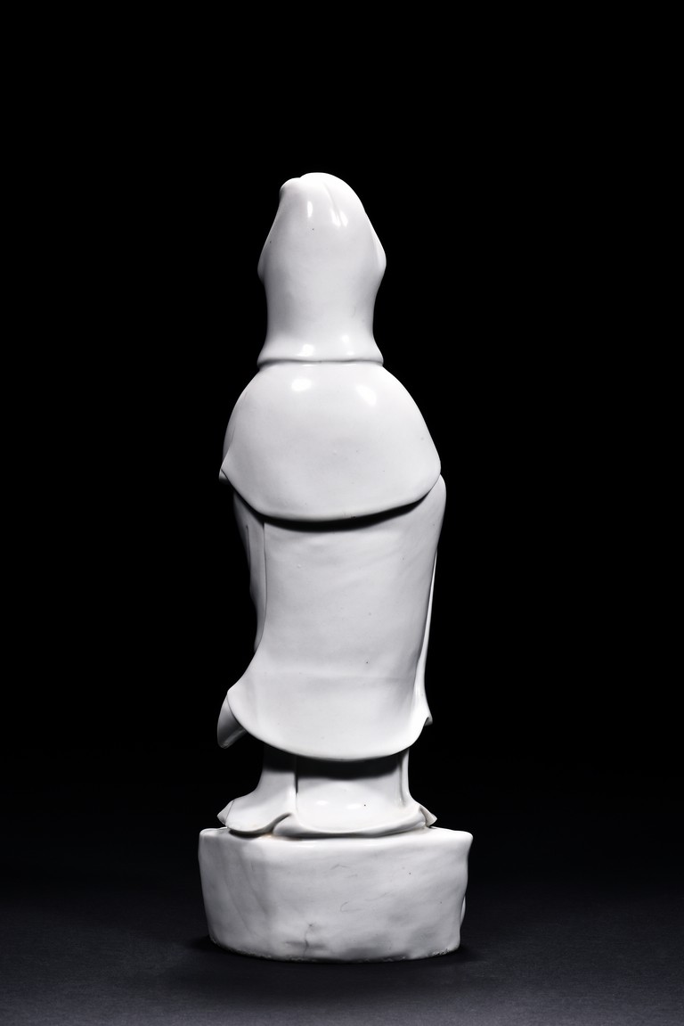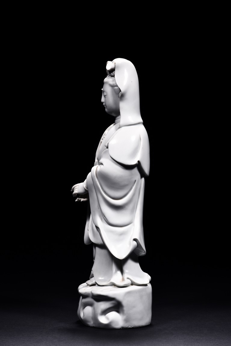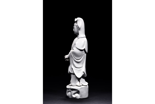 With downcast eyes and benevolent expression, her hair under veil, wearing flowing robe revealing adorned chest, both hands rested together and standing upon a stand resembling waves. Late Qing Dynasty period.