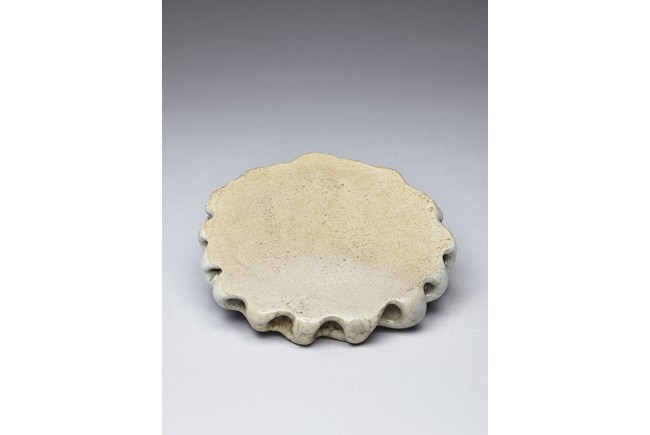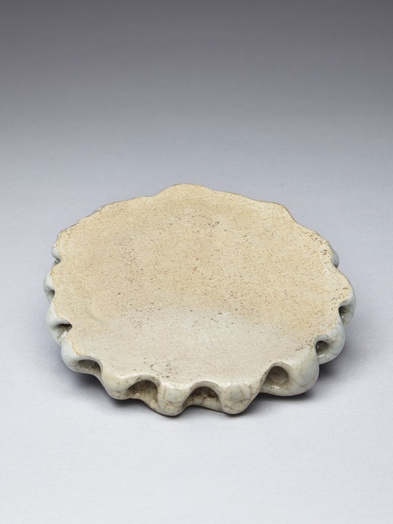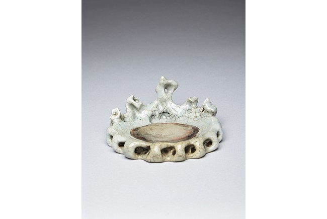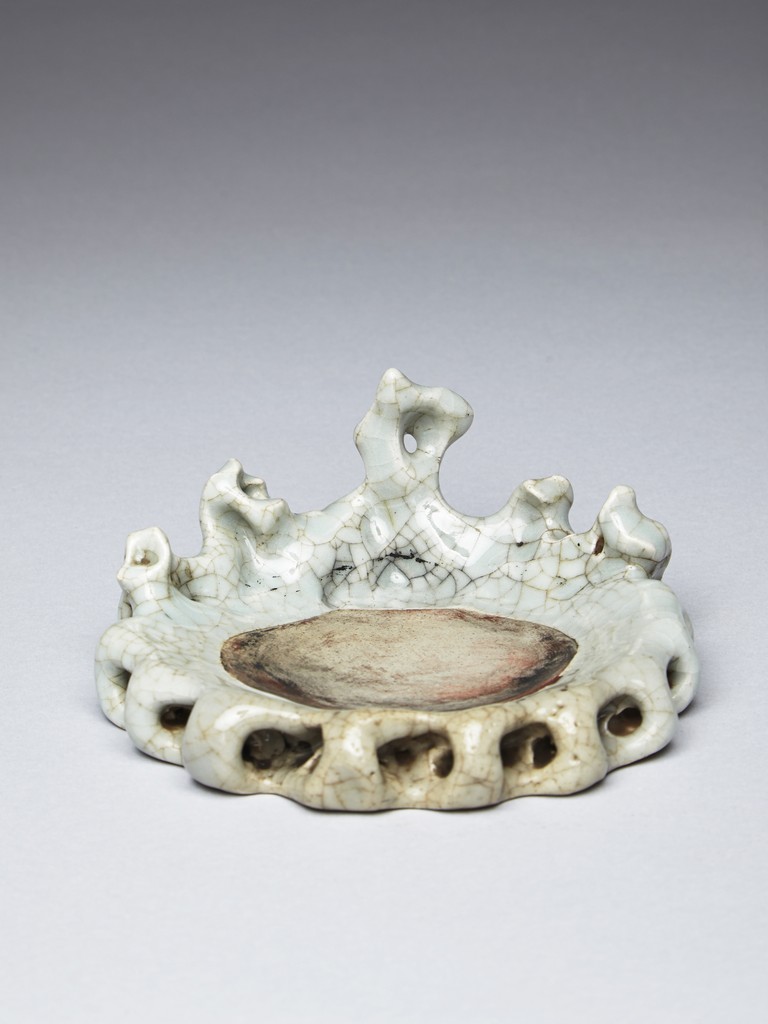 Moulded and pierced in the form of mountain range, with contours for the resting of the brush, overall glazed in bluish grey glaze with network of crackles, the unglazed concave base serves as washer. Qing Dynasty period.