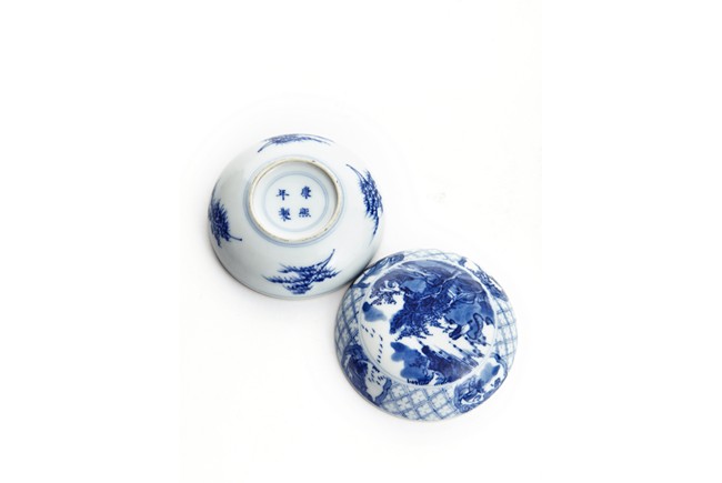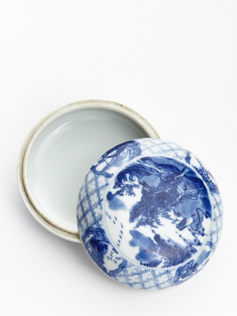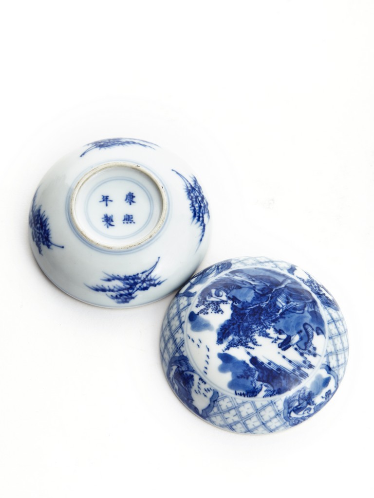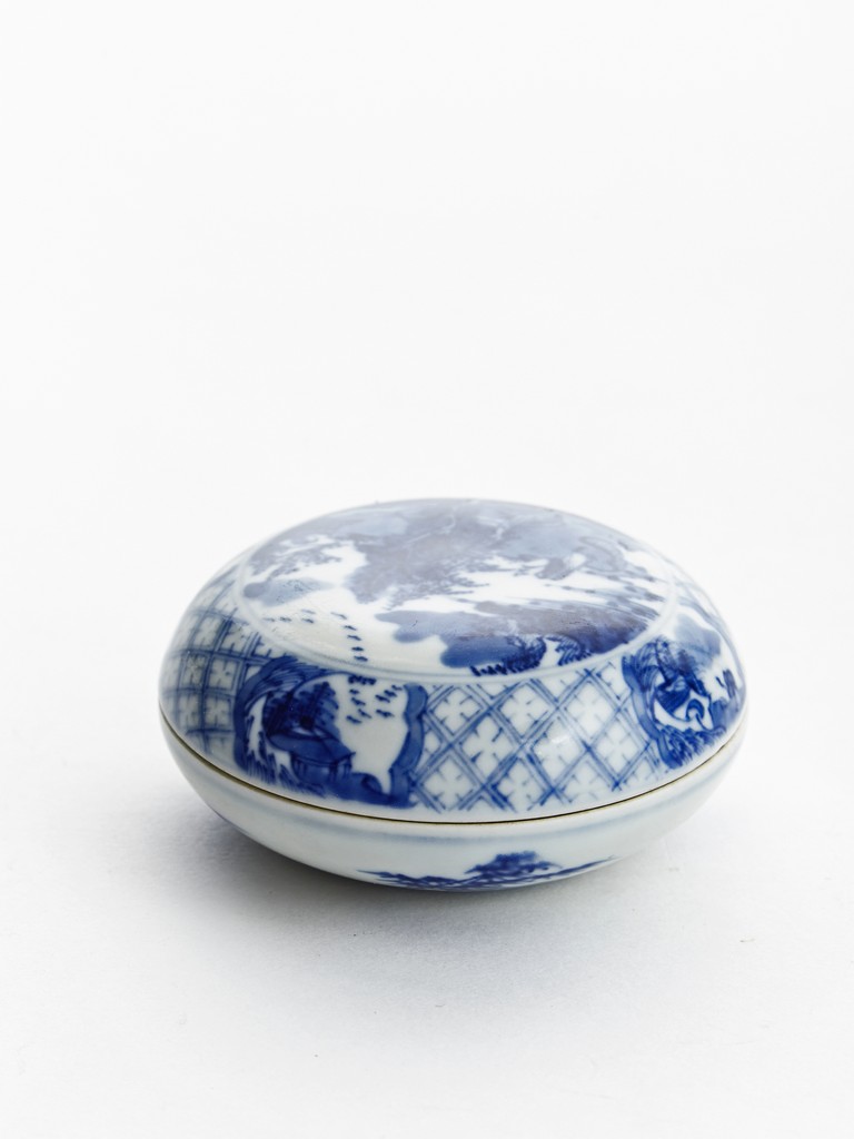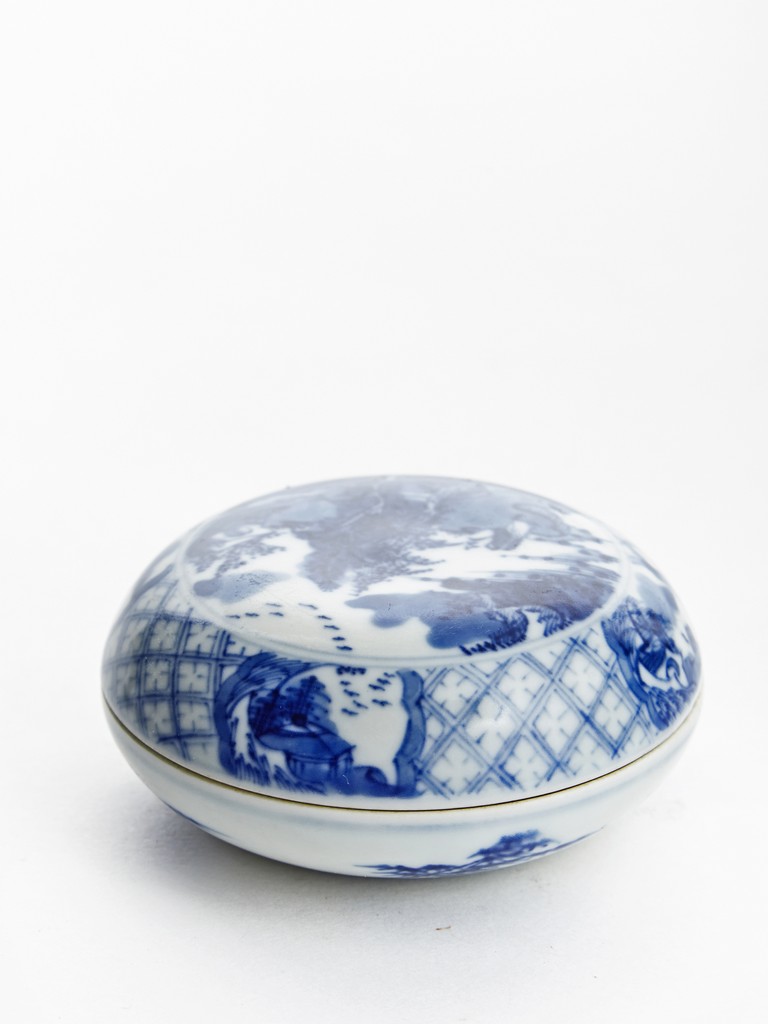 The top of cover finely enamelled with a riverbank landscape scene with figure and tall trees. The body painted with four panels of landscape spaced by geometric pattern. The bottom with four character Kangxi mark. Qing Dynasty period.