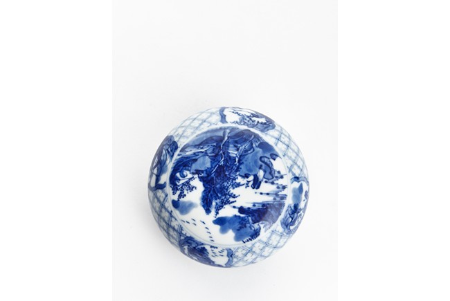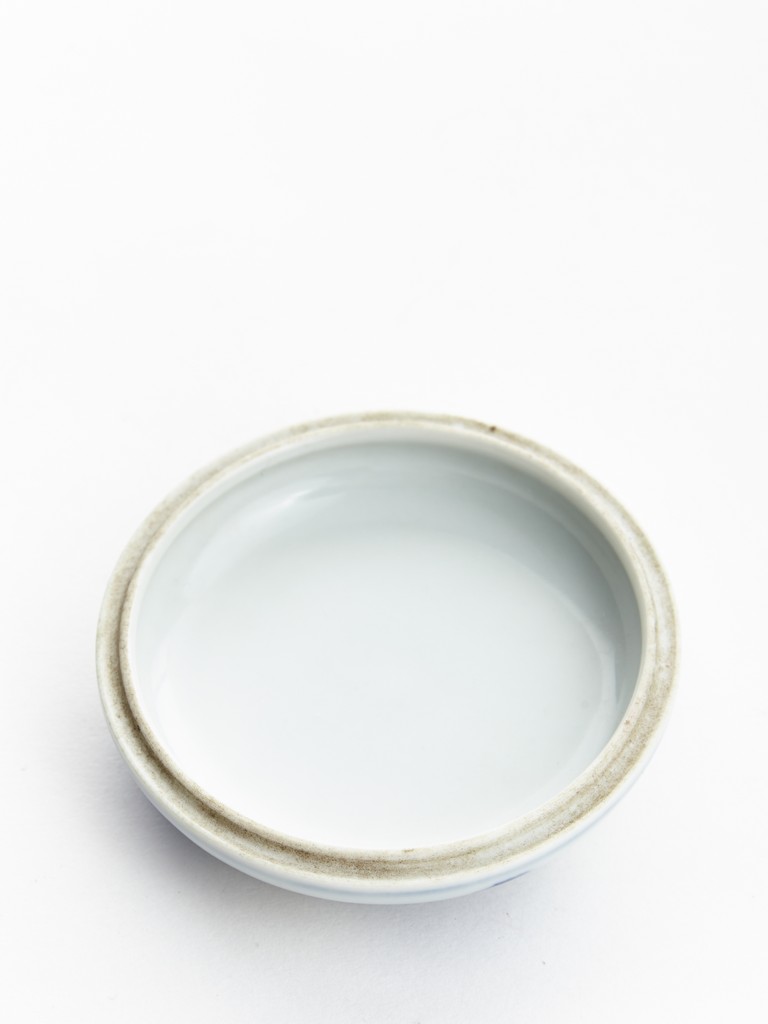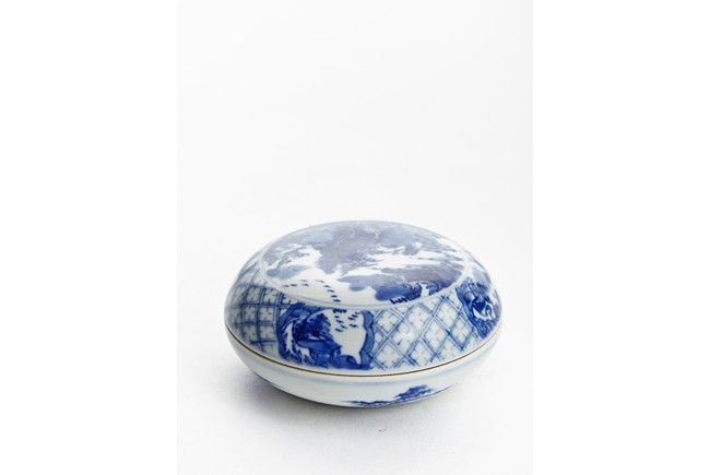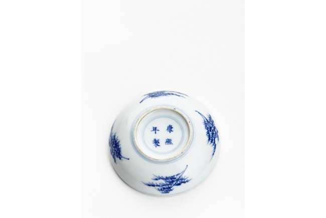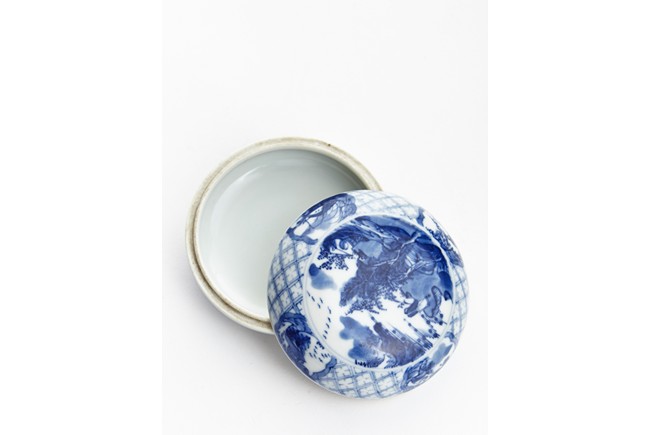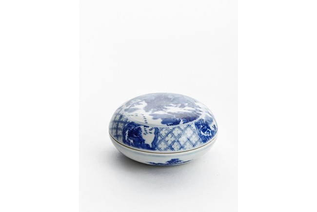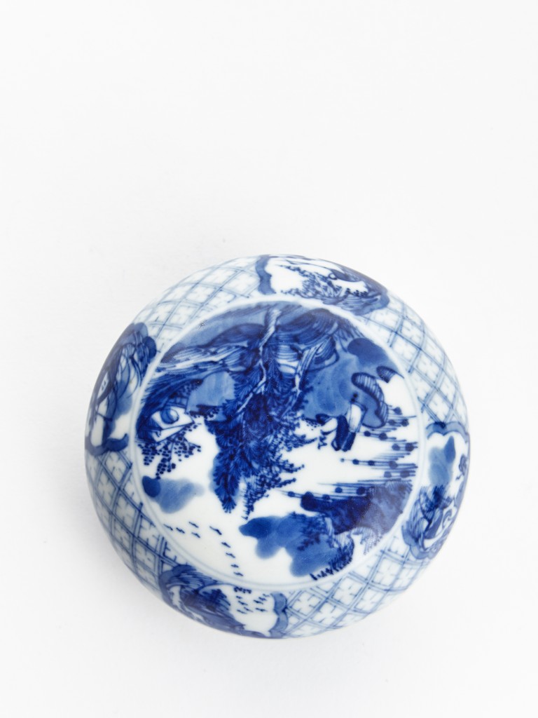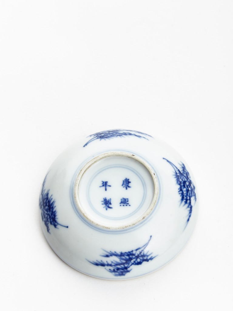 The top of cover finely enamelled with a riverbank landscape scene with figure and tall trees. The body painted with four panels of landscape spaced by geometric pattern. The bottom with four character Kangxi mark. Qing Dynasty period.