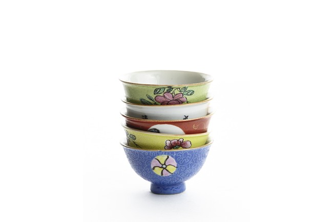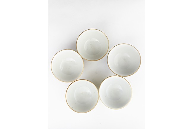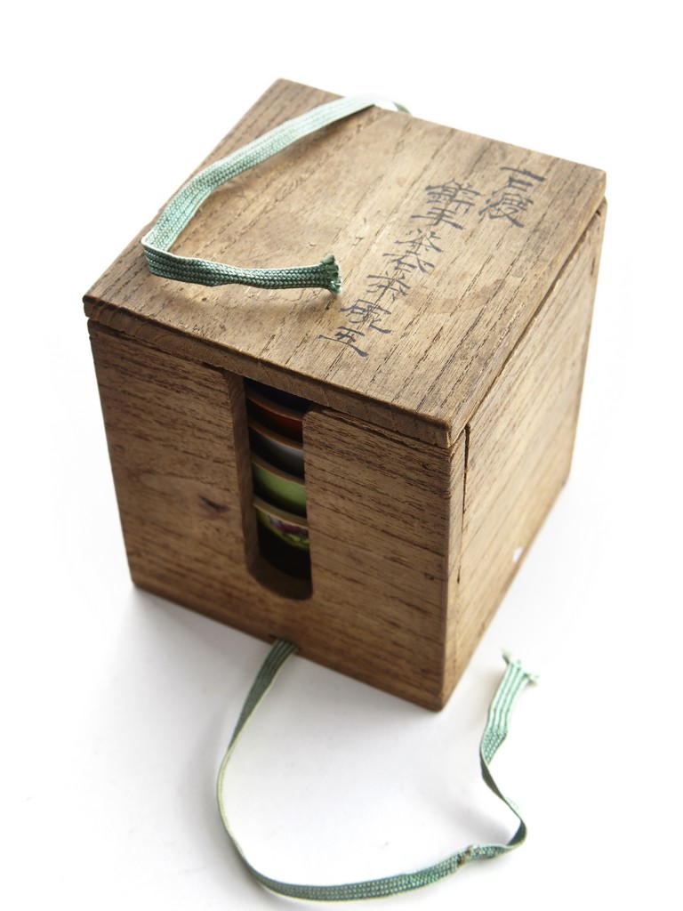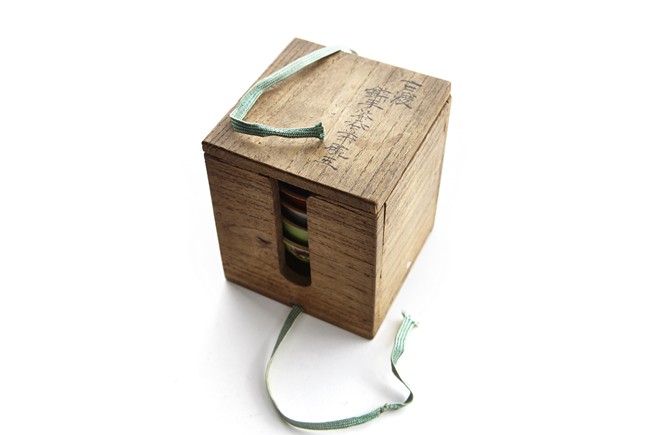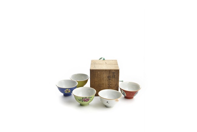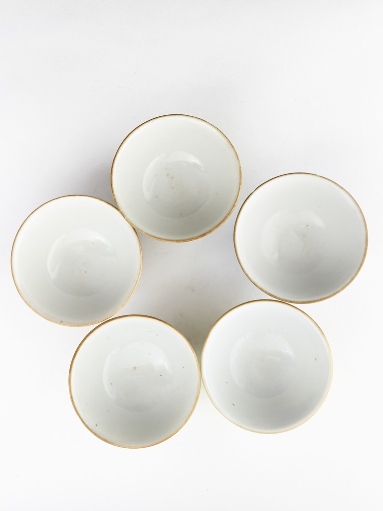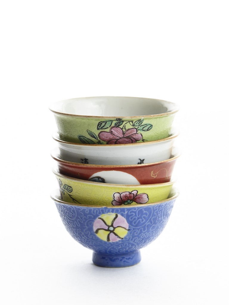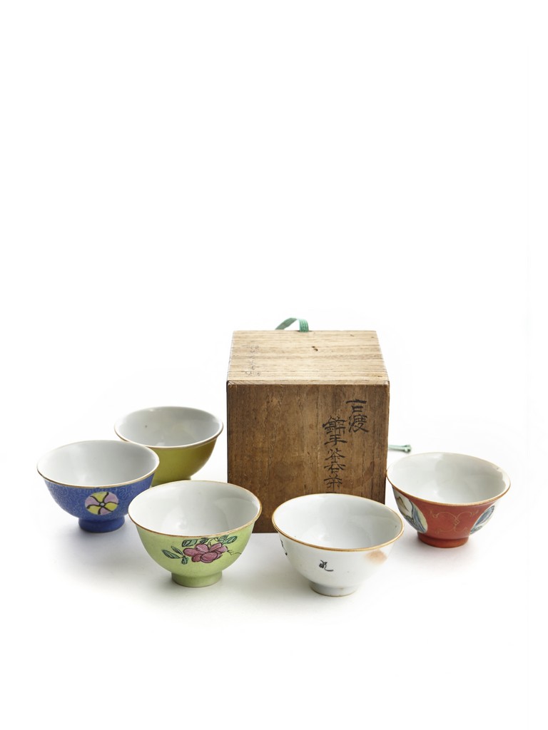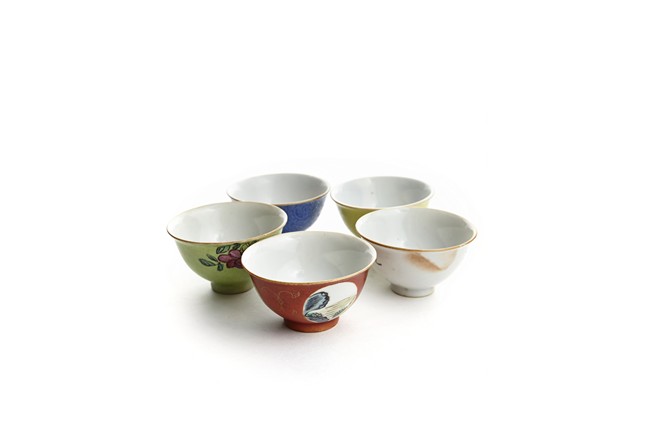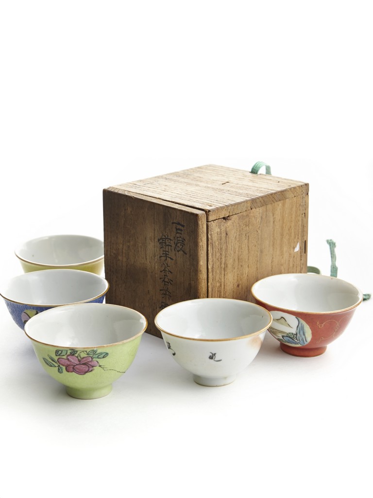 Comprising of five famille rose bowl cups, all enamelled in different sgraffiato background tone, including one decorated with leafy flowering branch reserved in yellow ground, one decorated with medallion reserved in blue sgraffiato tone, one decorated with medallions enclosing landscape against coral red ground. Accompanied with a wood box. Qing Dynasty period.