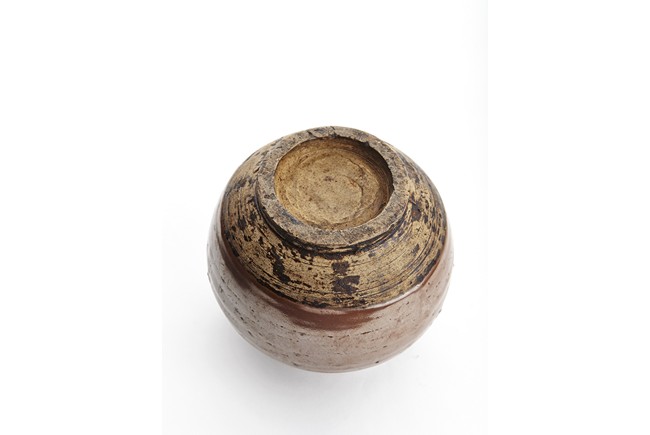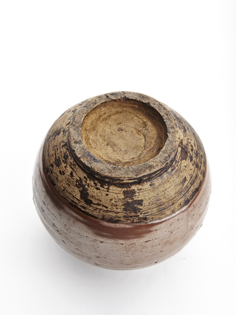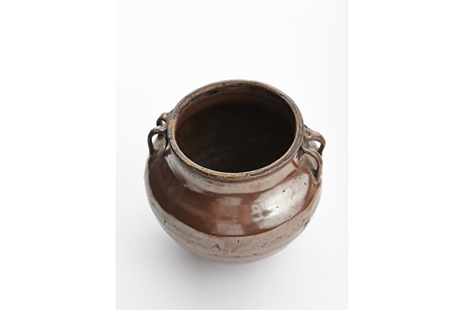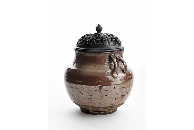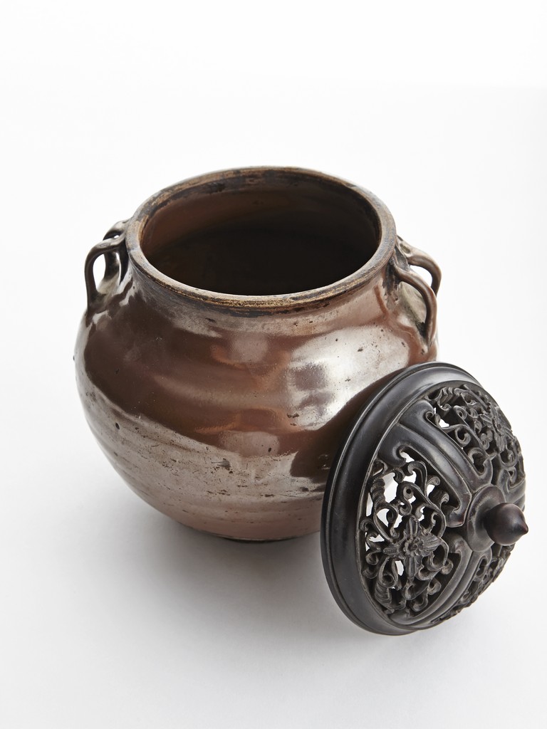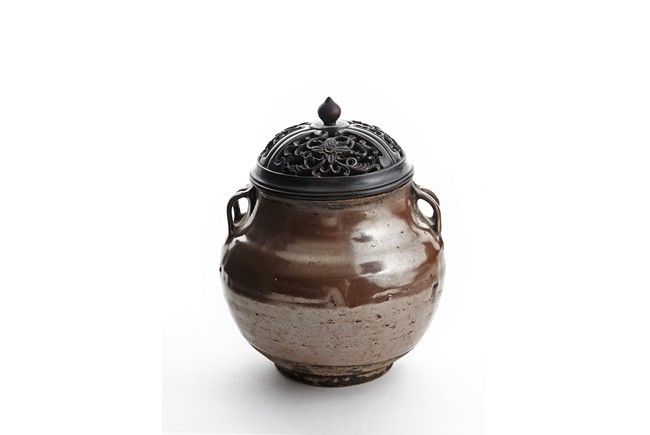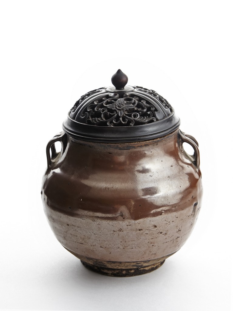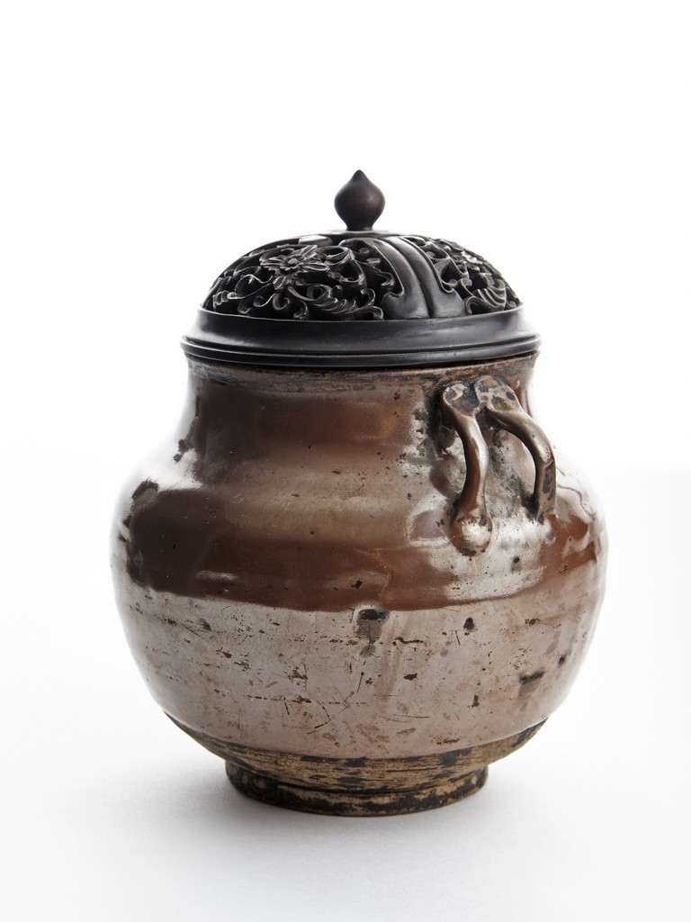 Rising from circular foot ring, the exterior evenly applied with rich russet-brown glaze, the neck flanked by two arched handles on each side, fitted with an reticulated openwork zitan cover. Song Dynasty period.